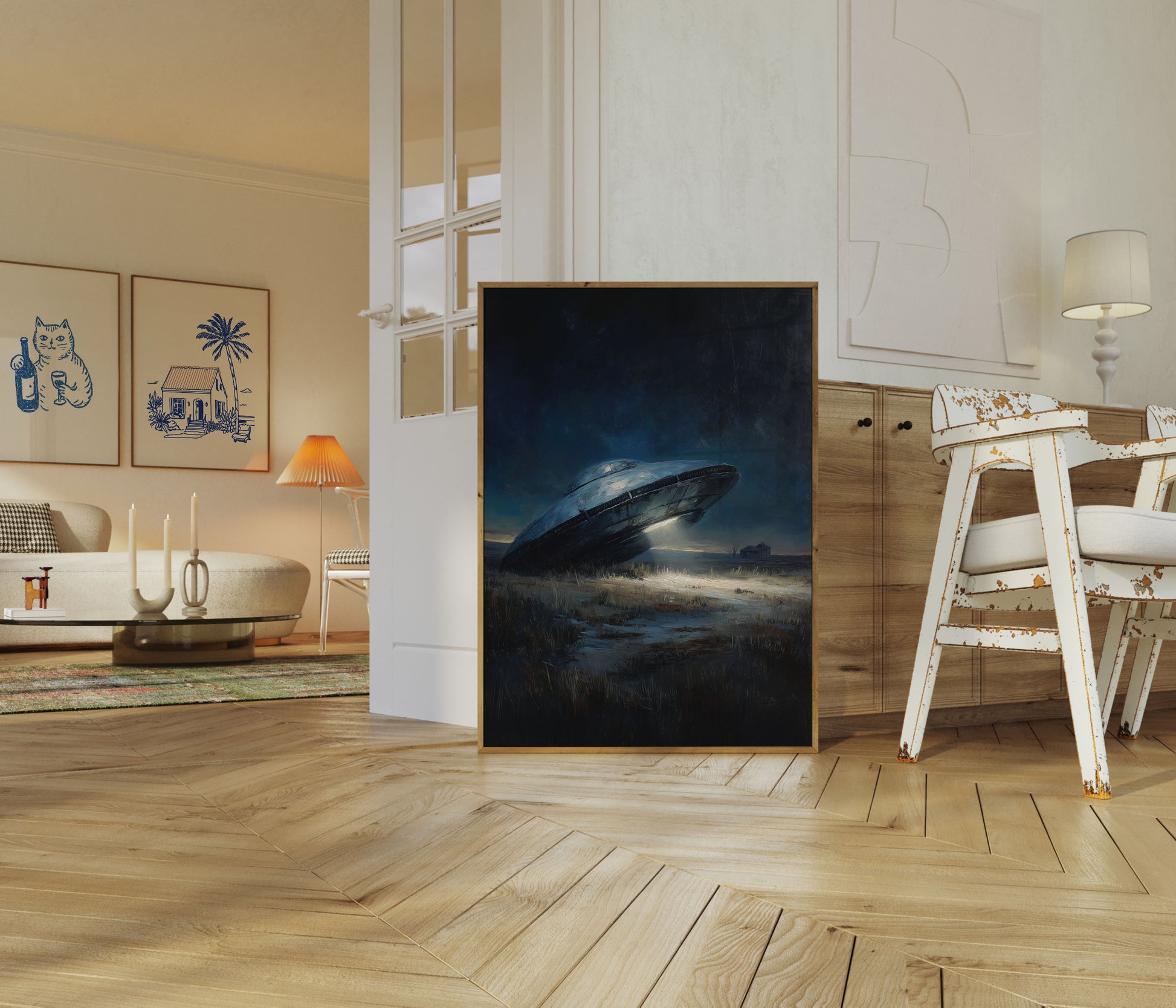 Tajemné UFO visí dramaticky nad opuštěnou venkovskou krajinou a vrhá éterický paprsek světla na tmavé, mlhavé travnaté pláně. Hladká, kovová vesmírná loď se zdá být zavěšena v ponuré noční obloze a vyvolává atmosféru očekávání a mimozemské úžasnosti. Děsivý a atmosférický, tento obraz zachycuje představivost mimozemských setkání.