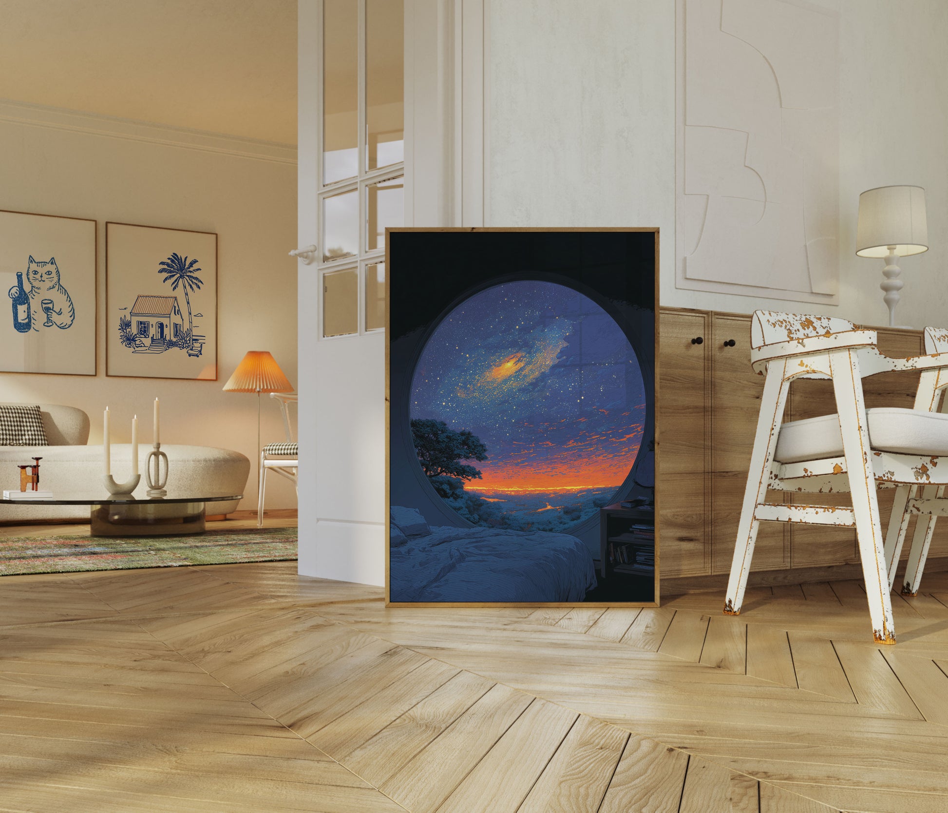 Pohledy skrze kruhové okno na dechberoucí scénu, kde se den setkává s nocí v dokonalé harmonii. Teplý zlatý západ slunce se rozpouští v hlubokém soumraku, zatímco se Mléčná dráha rozprostírá majestátně nad hlavou, poseta nespočetnými hvězdami ve zlatých a bílých tónech. Toto ohromující umělecké dílo zachycuje kouzelný moment mezi soumrakem a hvězdným světlem, vytvářející klidnou a kontemplativní atmosféru, která vyzývá diváky, aby se zastavili a obdivovali krásu vesmíru. Silueta stromu a klidná krajina pod ním ukotvují tuto nebeskou vizi v chvíli tichého zamyšlení a přírodní krásy.