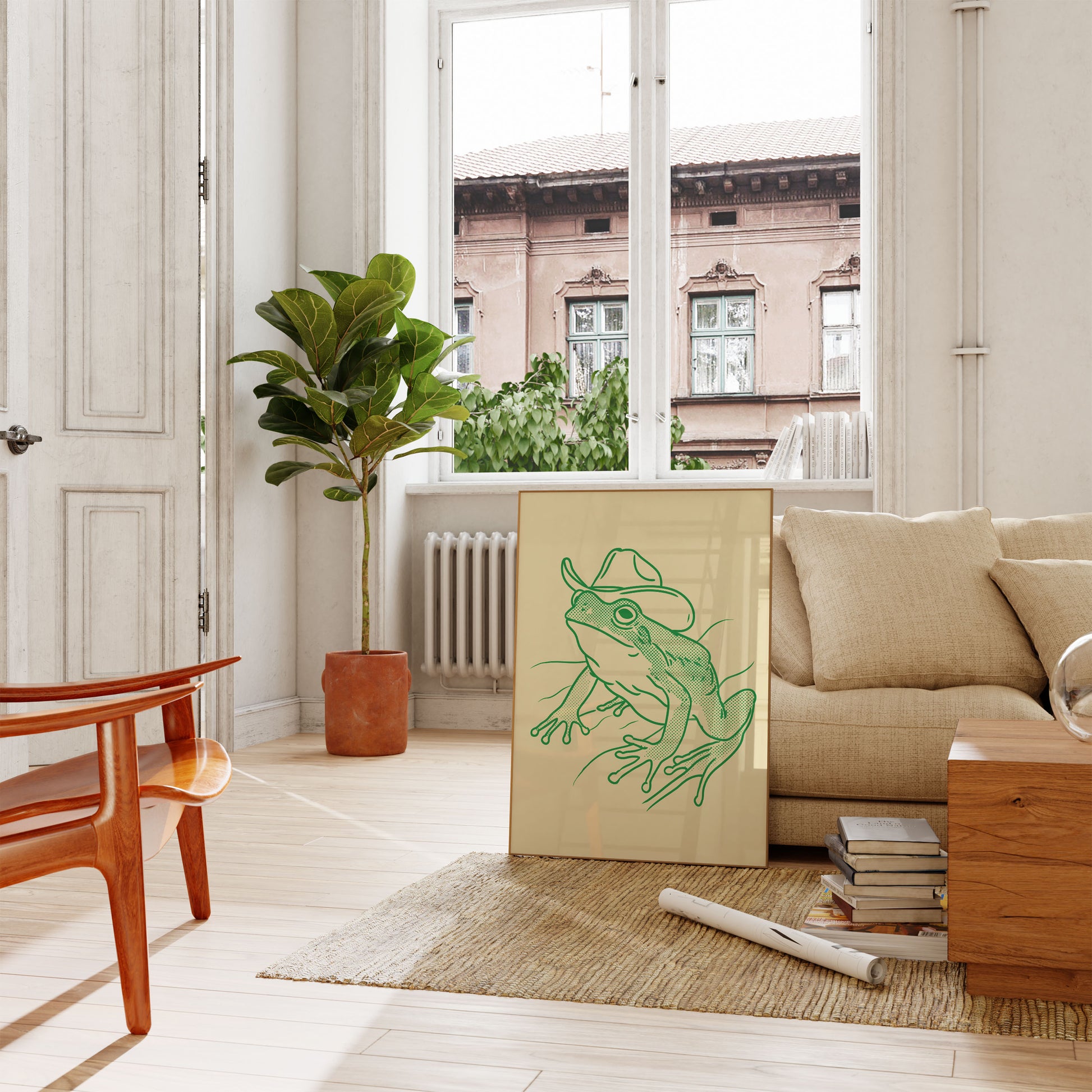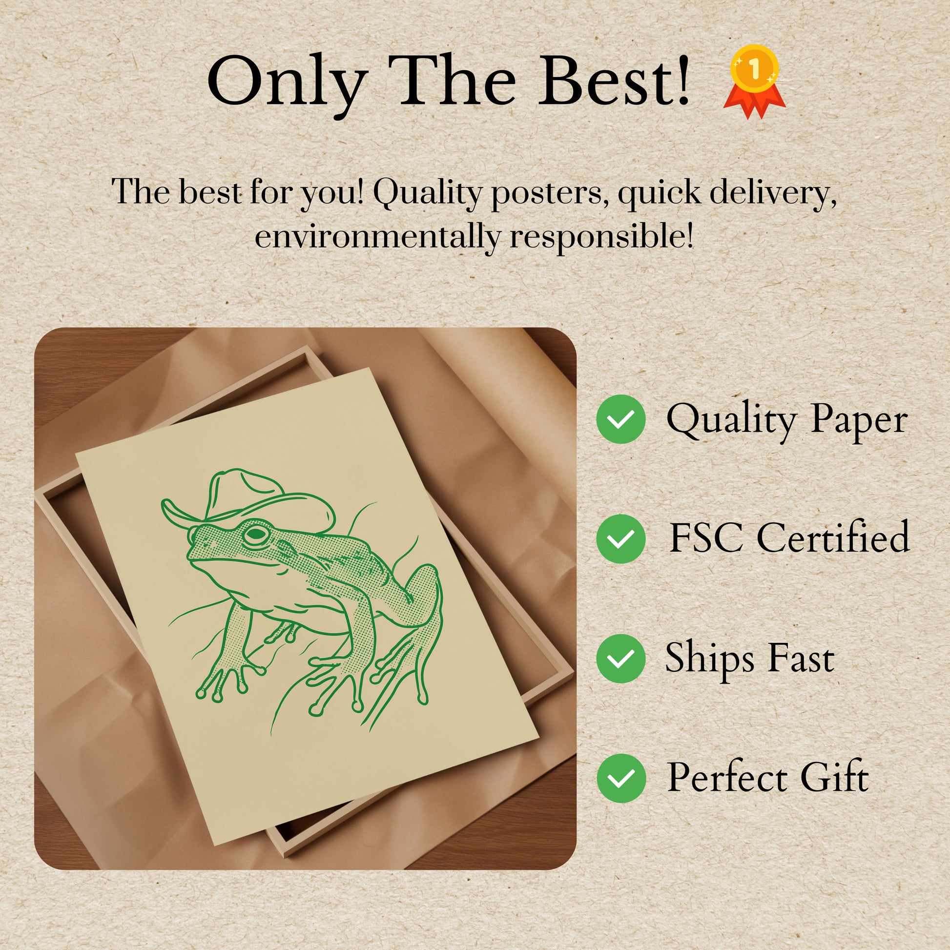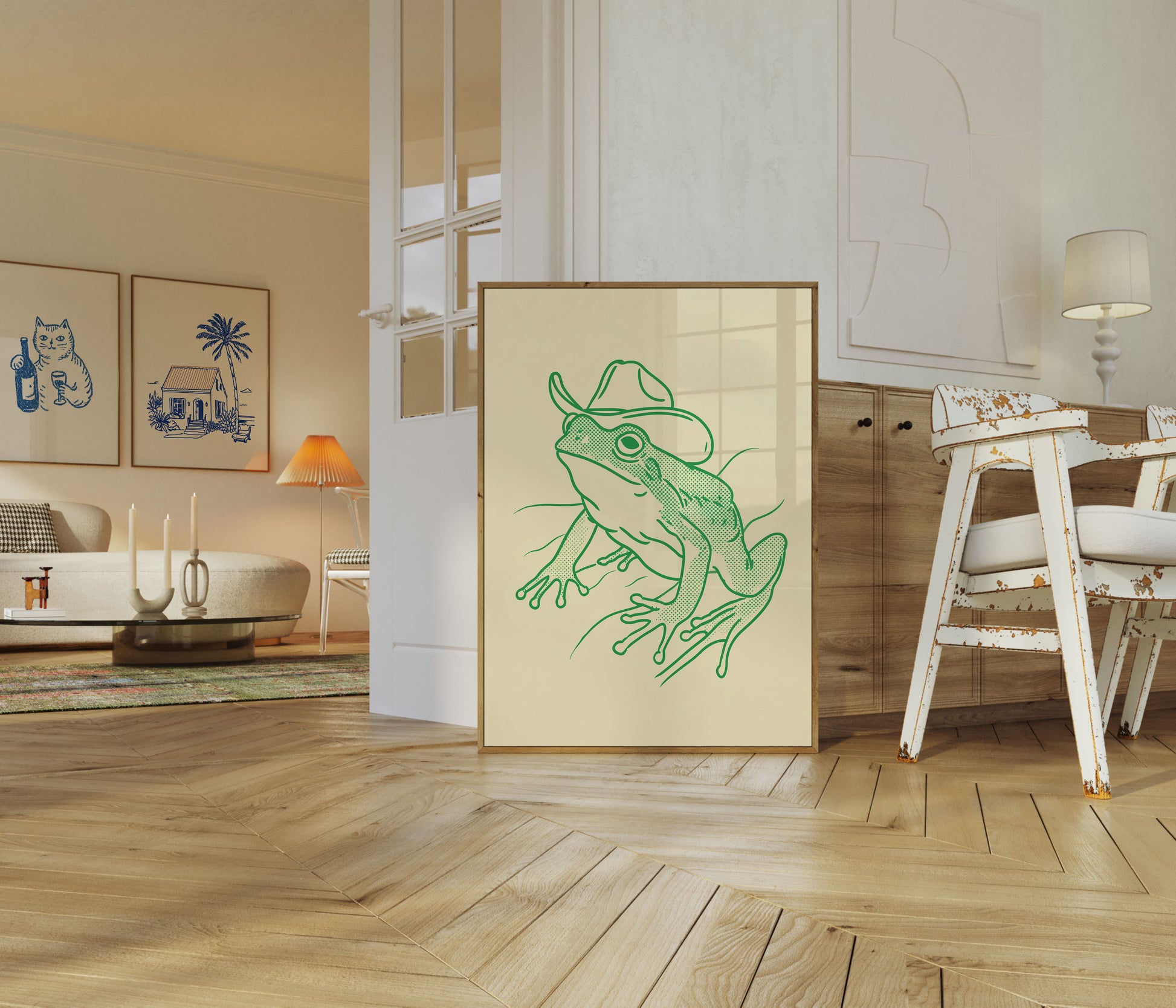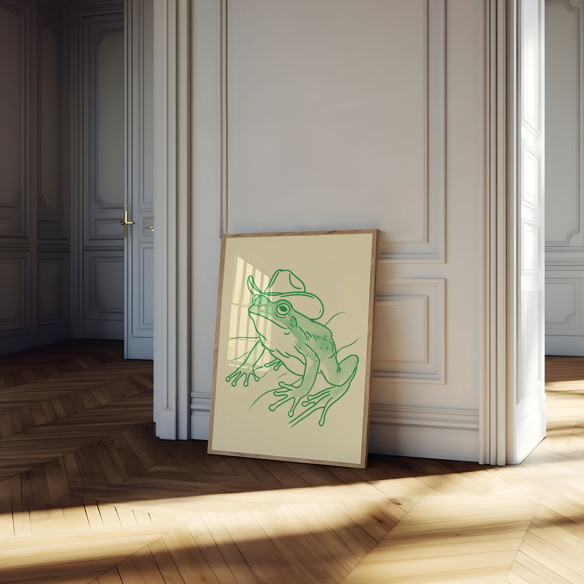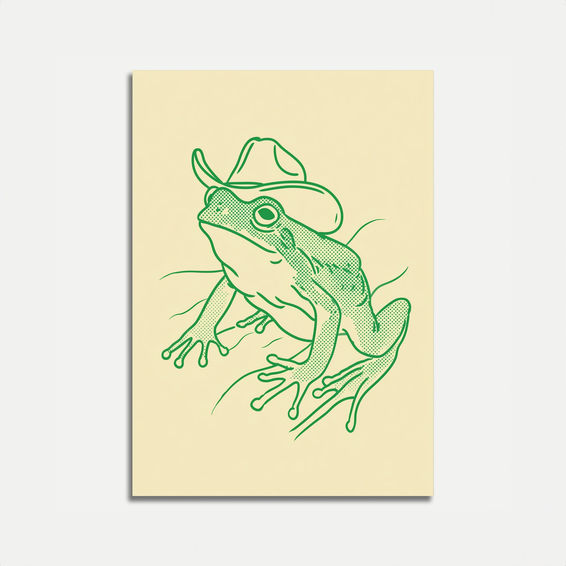 Tato roztomilá zelená ilustrace zachycuje hravou žábu v klasickém kovbojském klobouku, vyobrazené v okouzlujícím polotonálním stylu na jemném krémovém pozadí. Detailní linkresba a hravý charakter přinášejí smysl pro humor a osobitost tohoto jedinečného zvířecího uměleckého díla, které je perfektní pro přidání špetky svérázného kouzla do jakéhokoli prostoru.