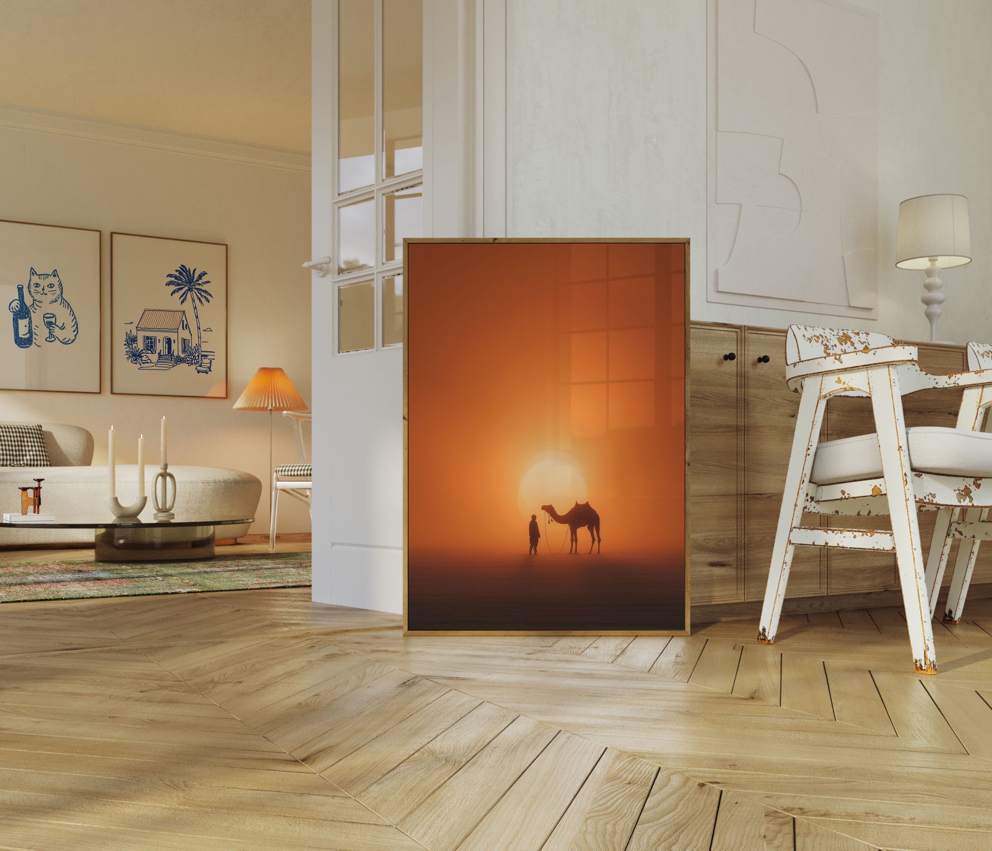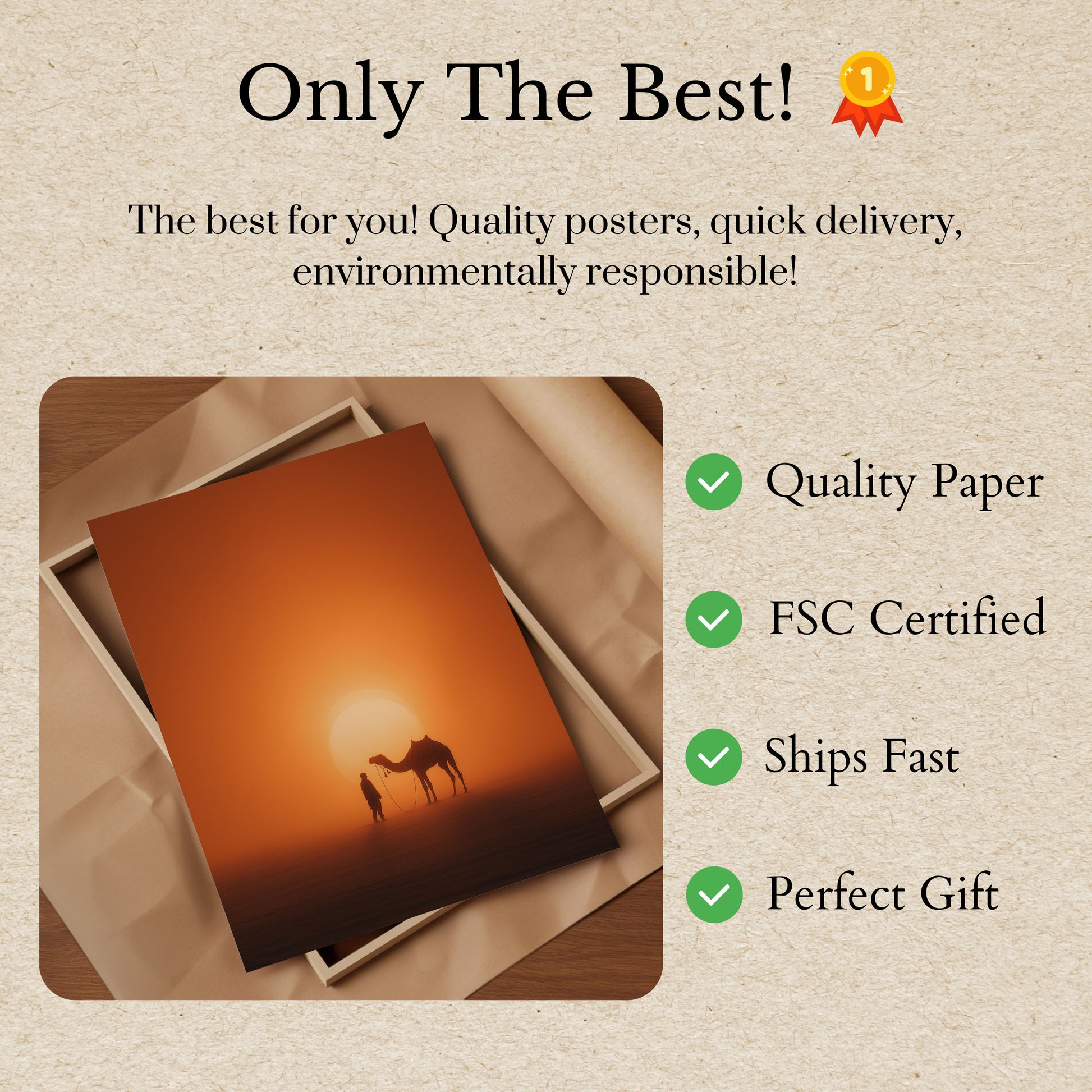 Tato úchvatná pouštní scéna zachycuje kouzlo zlatého západu slunce nad rozlehými písečnými dunami. Osamělá postava stojí s majestátním velbloudem, který se rýsuje proti zářivému kotouči teplého světla a vytváří intimní okamžik v rozsáhlé divočině. Bohatý přechod oranžových a jantarových tónů vyplňuje celé kompozici a vzbuzuje pocity touhy po cestování, dobrodružství a klidné samoty v jedné z nejznámějších krajin Země. Ideální pro každého, kdo sní o egzotických cestách nebo chce domů přinést klidnou krásu pouště.