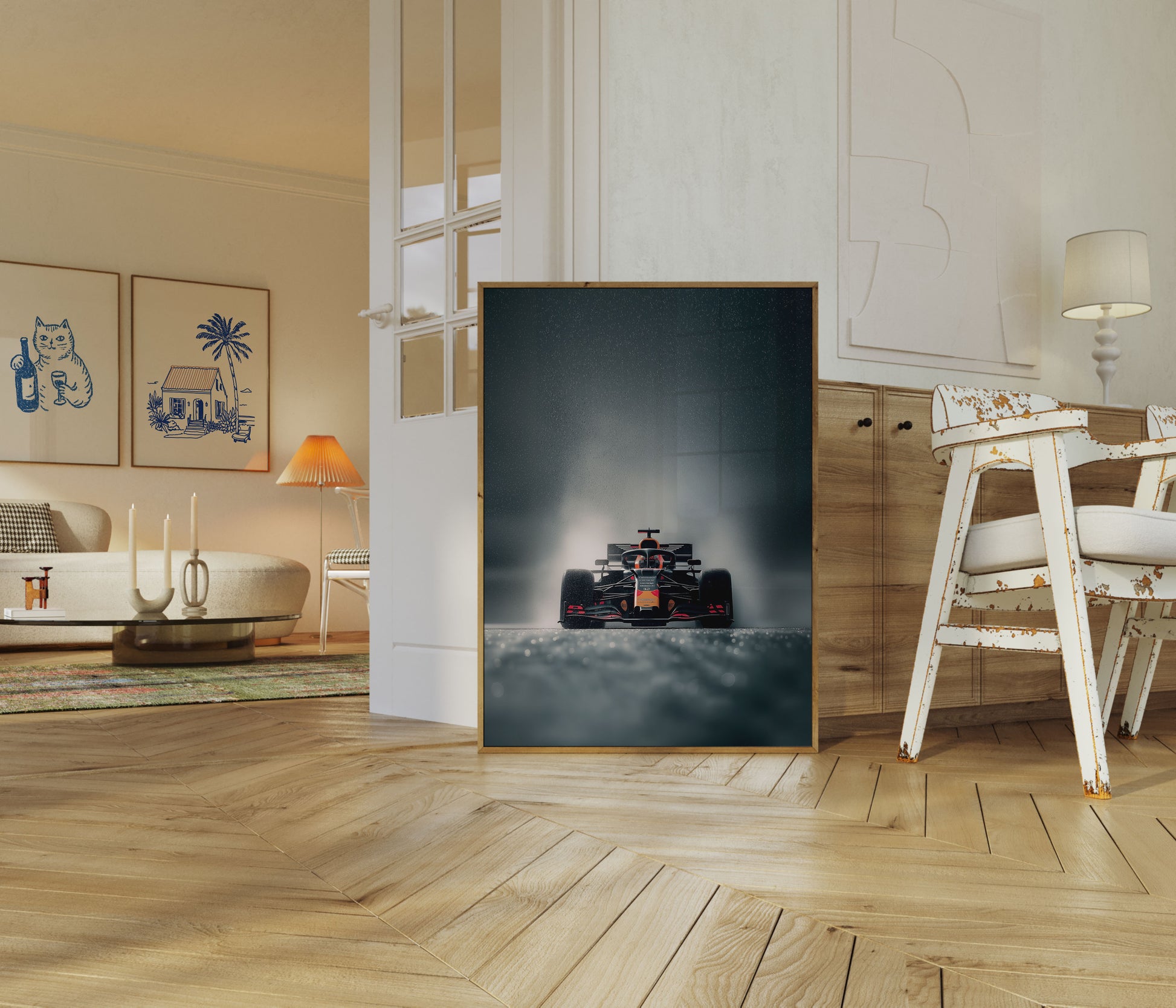 Zažijte intenzitu a drama závodů Formule 1 s tímto úžasným dynamickým plakátem. Elegantní červený a černý závodní vůz se pronáší těžkým deštěm, čímž vytváří explozivní vodní sprej, který vypluňuje rám energií a pohybem. Pochmurná atmosféra zachycuje dovednost, rychlost a adrenalin motorsportu v jeho nejlepší podobě, s dramatickým osvětlením prolomujícím se bouřlivou oblohou. Tento silný obraz oslavuje přesné inženýrství a konkurenční ducha Formule 1, což jej činí dokonalým pro každého nadšence závodů nebo milovníka sportu, který oceňuje vysoce výkonná vozidla a dramatické akční momenty.