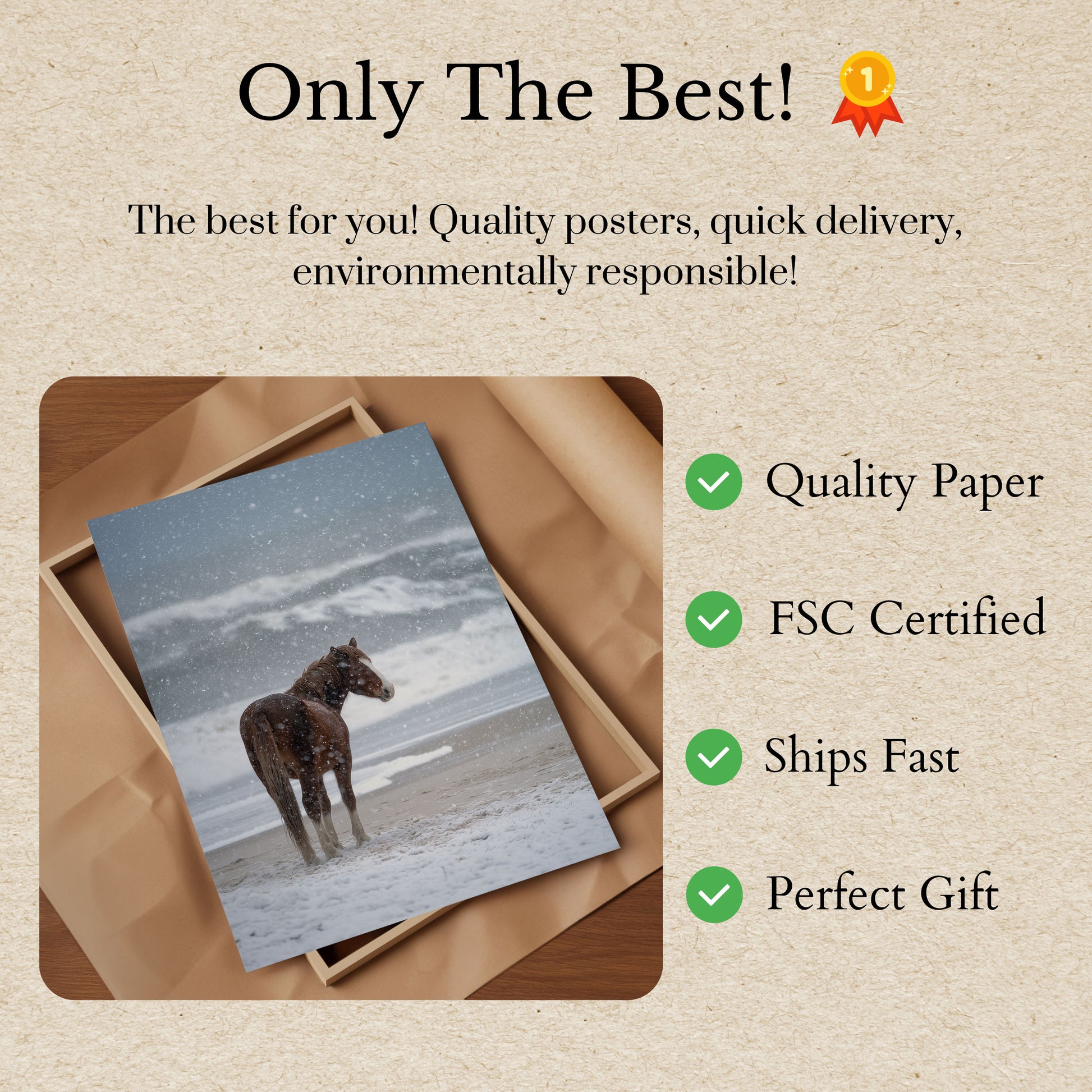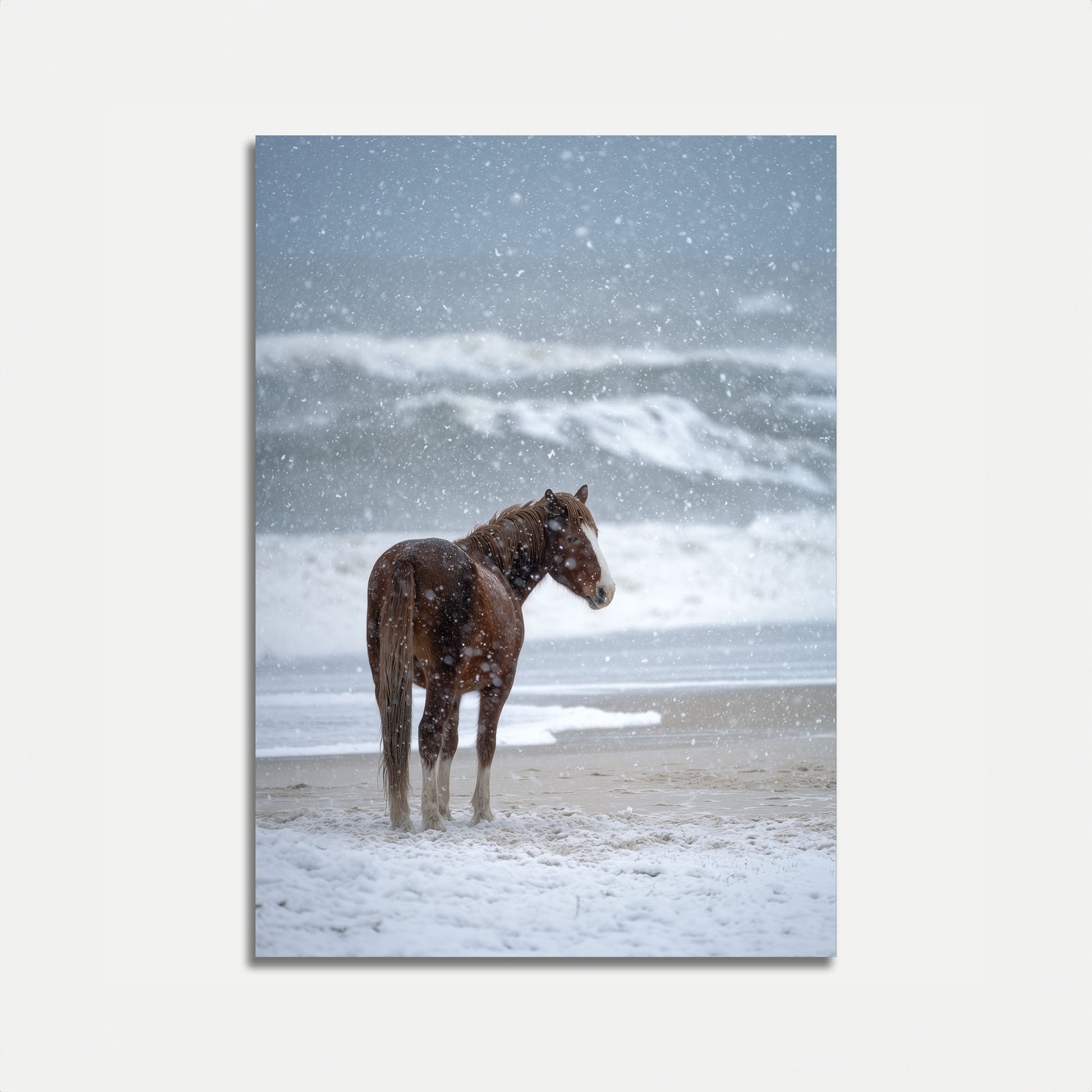 Majestátní hnědý kůň stojí osamocen na zasněžené pláži a hledí do bouřlivého zimního mořského horizontu. Jemné sněhové vločky víří kolem jeho svalnatého těla a vytvářejí dechberoucí scénu tichého odhodlání a přírodní krásy. Bohatě kaštanový odstín srsti koně dramaticky kontrastuje s holou bílou krajinou a šedým mořským pozadím.