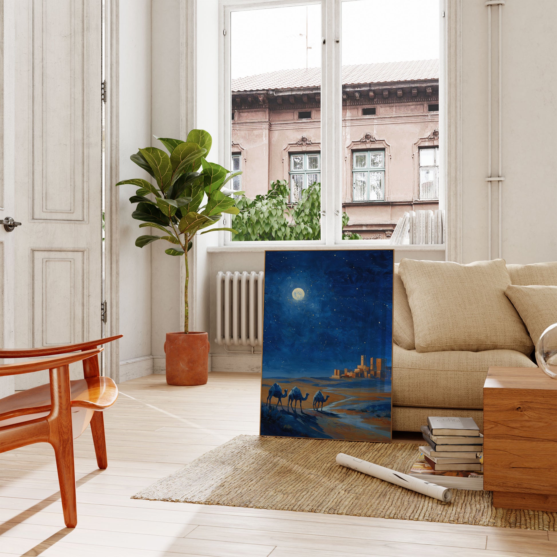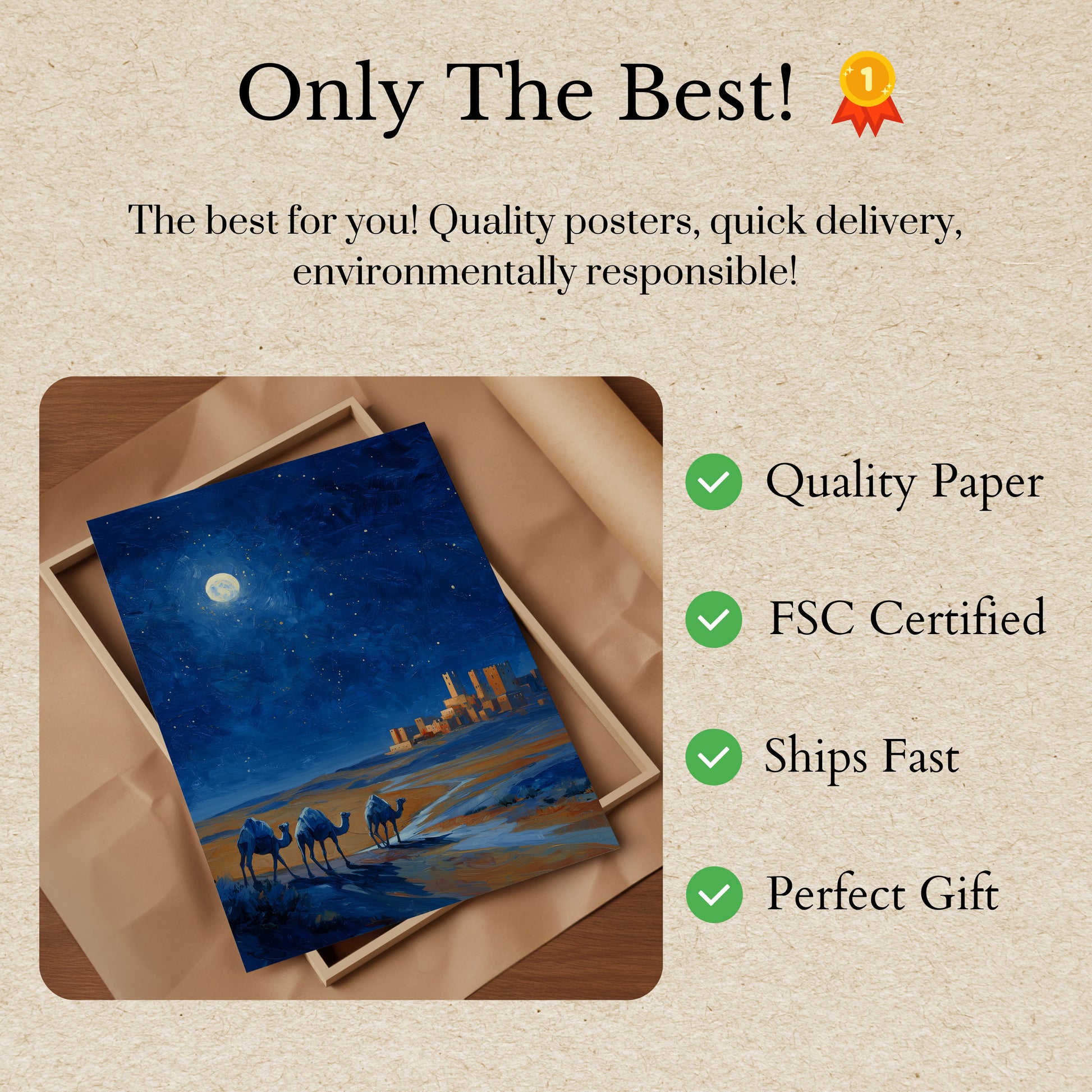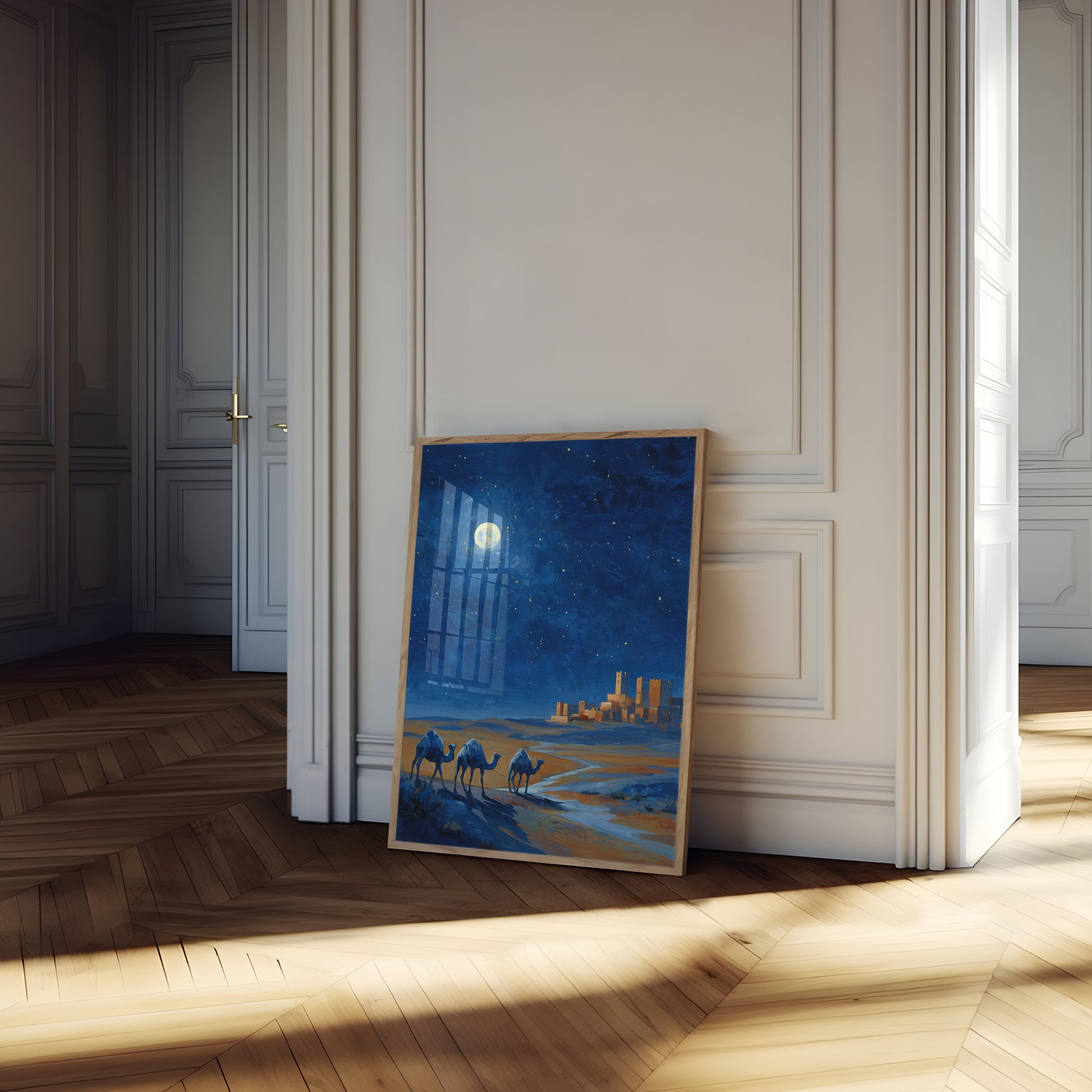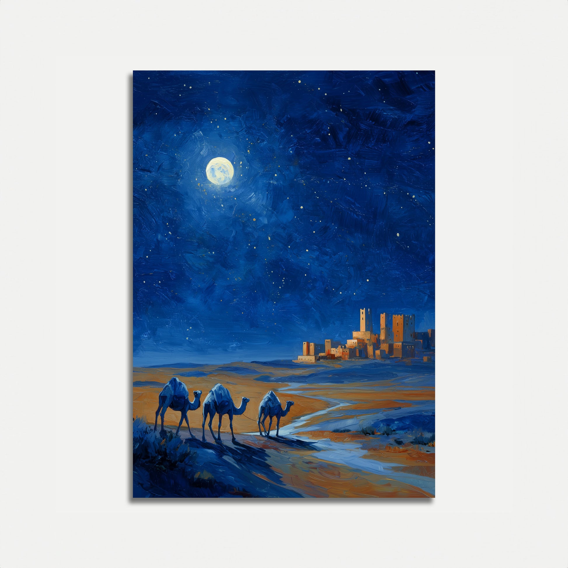 Úchvatná noční krajina zachycuje tři velbloudy přecházející zlatou poušť, siluetované proti hlubokému modrému hvězdnatému nebi. Úplněk vrhá éterické světlo na starobylé kamenné věže v dálce, čímž vytváří kouzelnou a tajemnou atmosféru nadčasového cestování a dobrodružství.