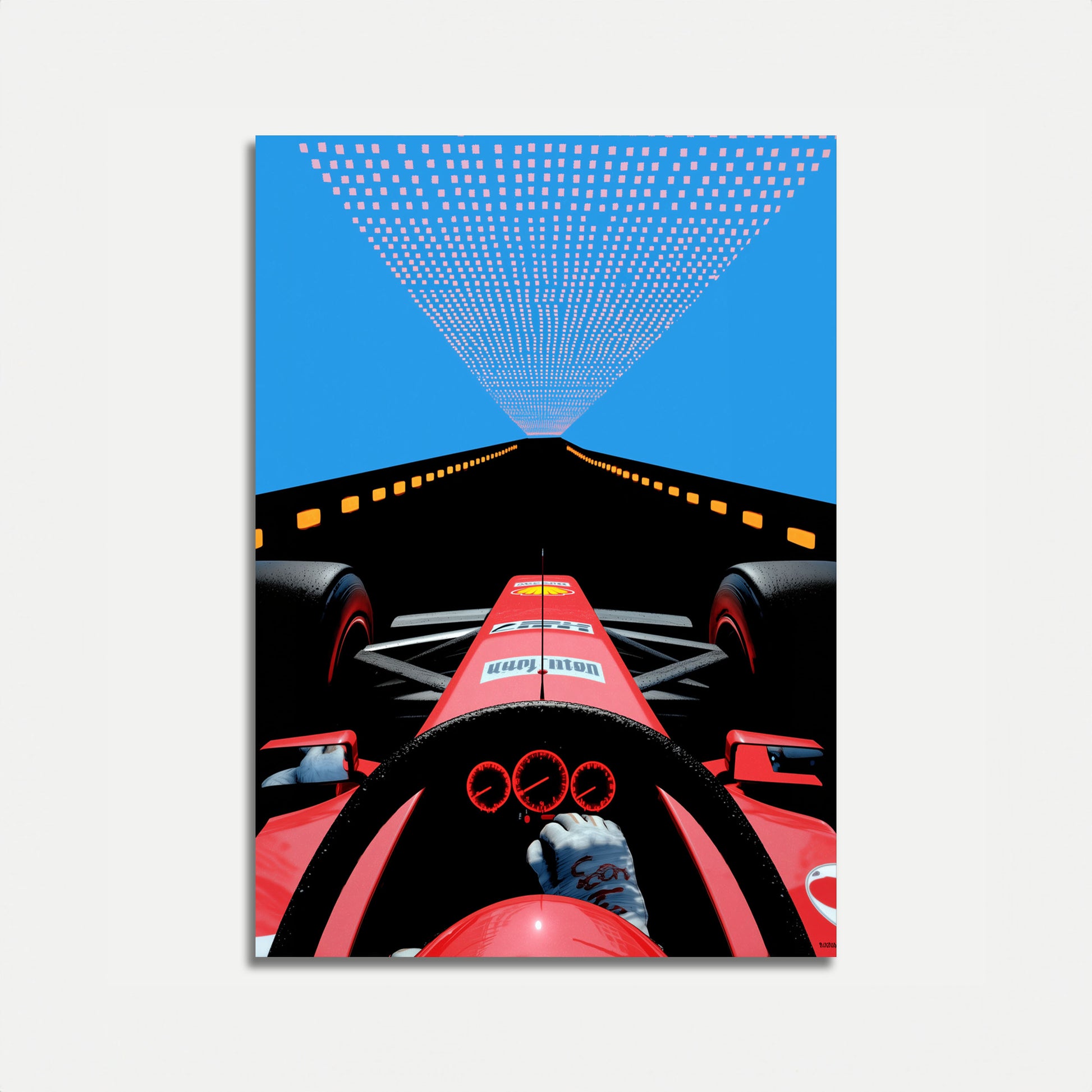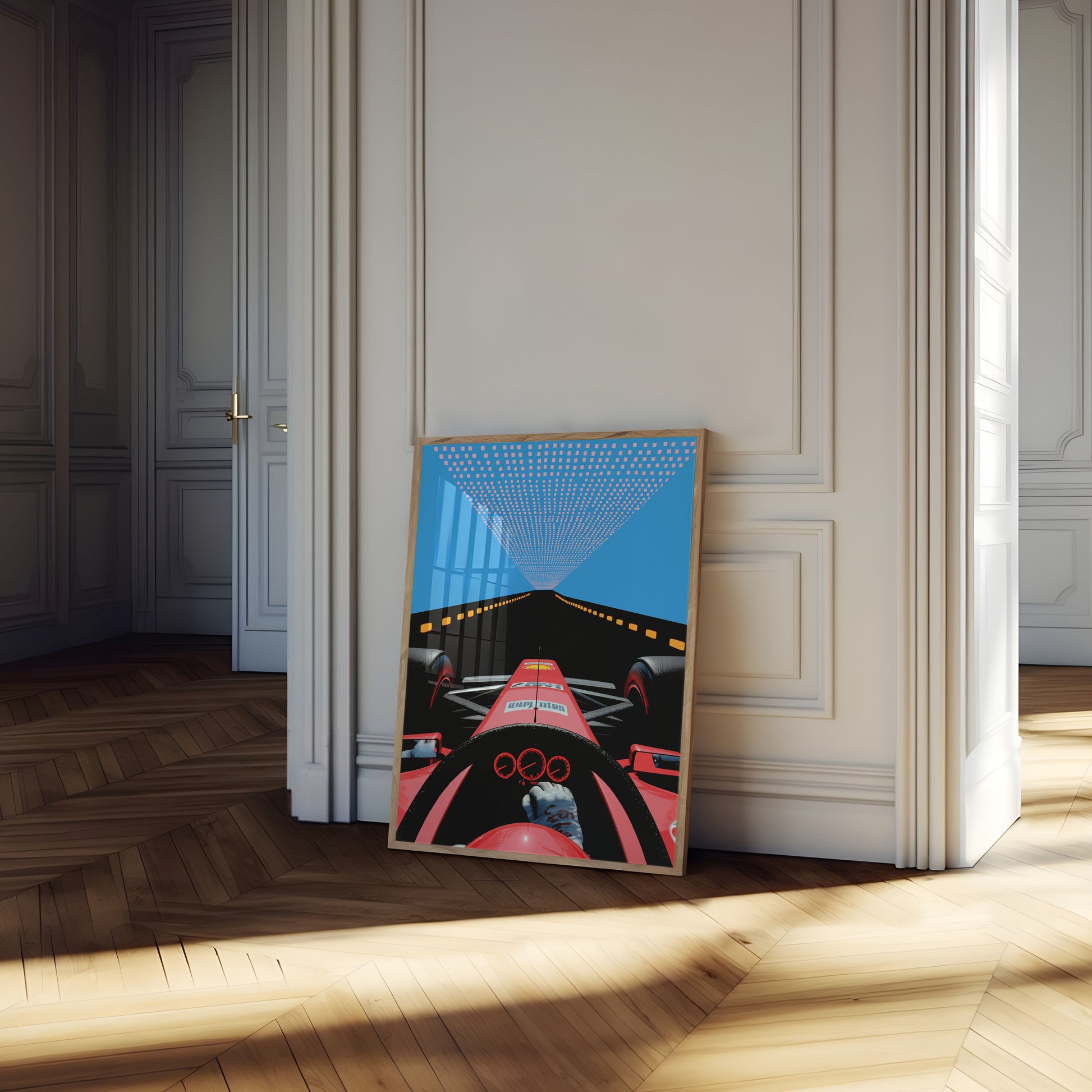 Zažijte srdcervoucí intenzitu motoristického sportu s tímto úžasným plakátem z perspektivy Formule 1. Obraz zachycuje dramatický pohled z vnitřku elegantního červeného závodního vozu, přičemž dynamické modro-růžové pixelové pozadí vytváří pocit neuvěřitelné rychlosti a pohybu. Živoucí přístrojová deska a rukavicí opatěná ruka na volantu zvou diváky do světa vysoce výkonných profesionálních závodů.