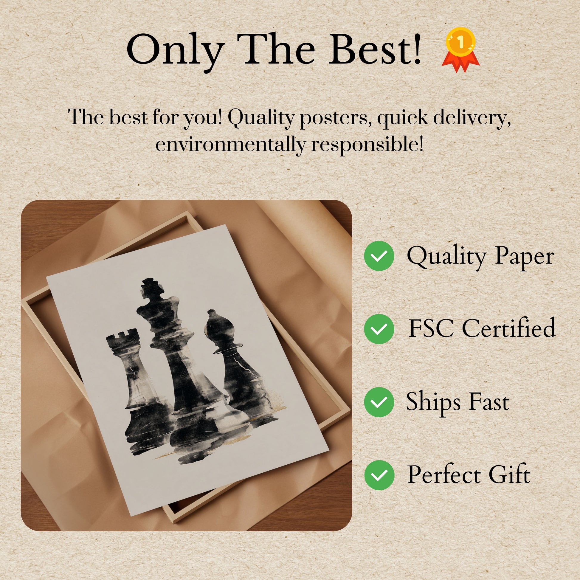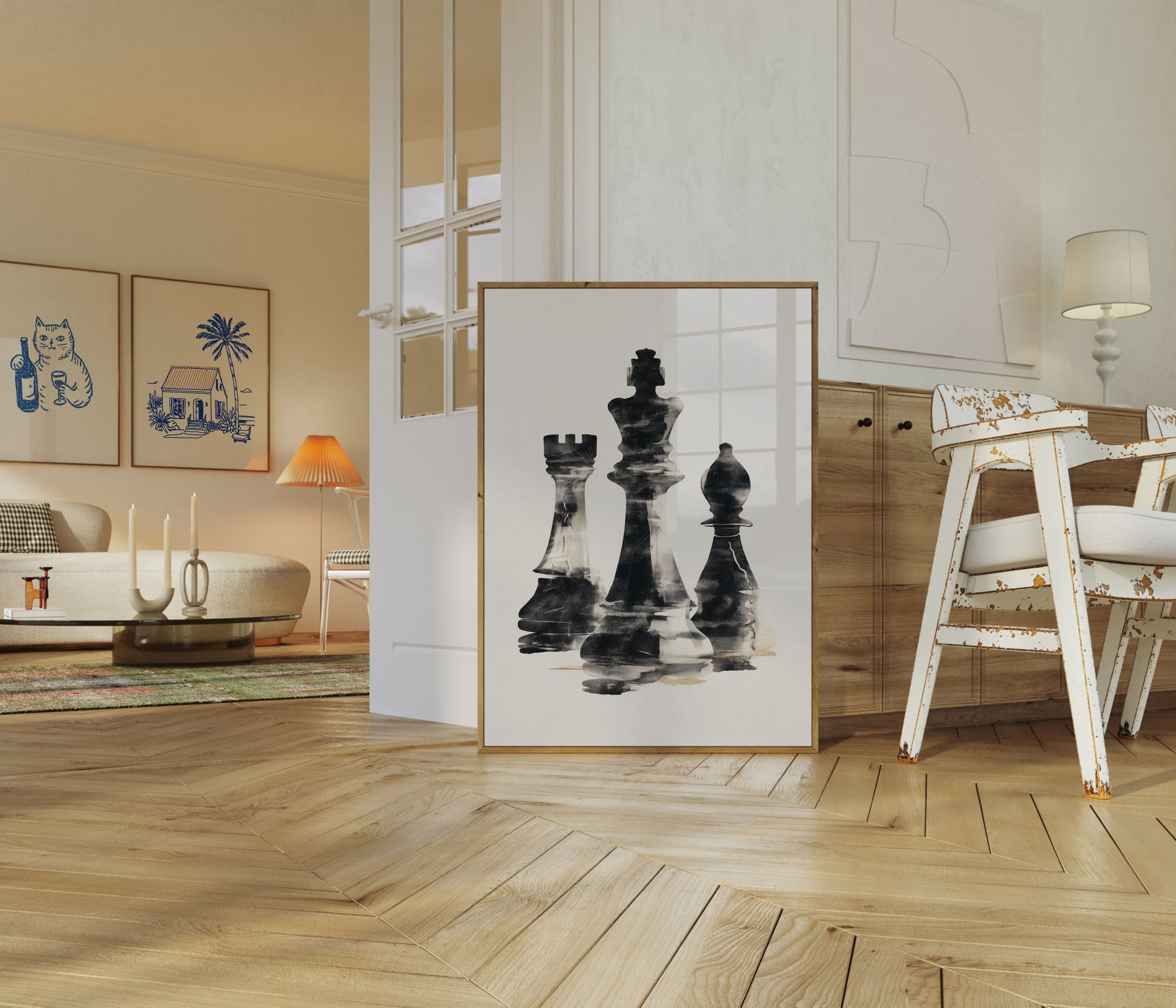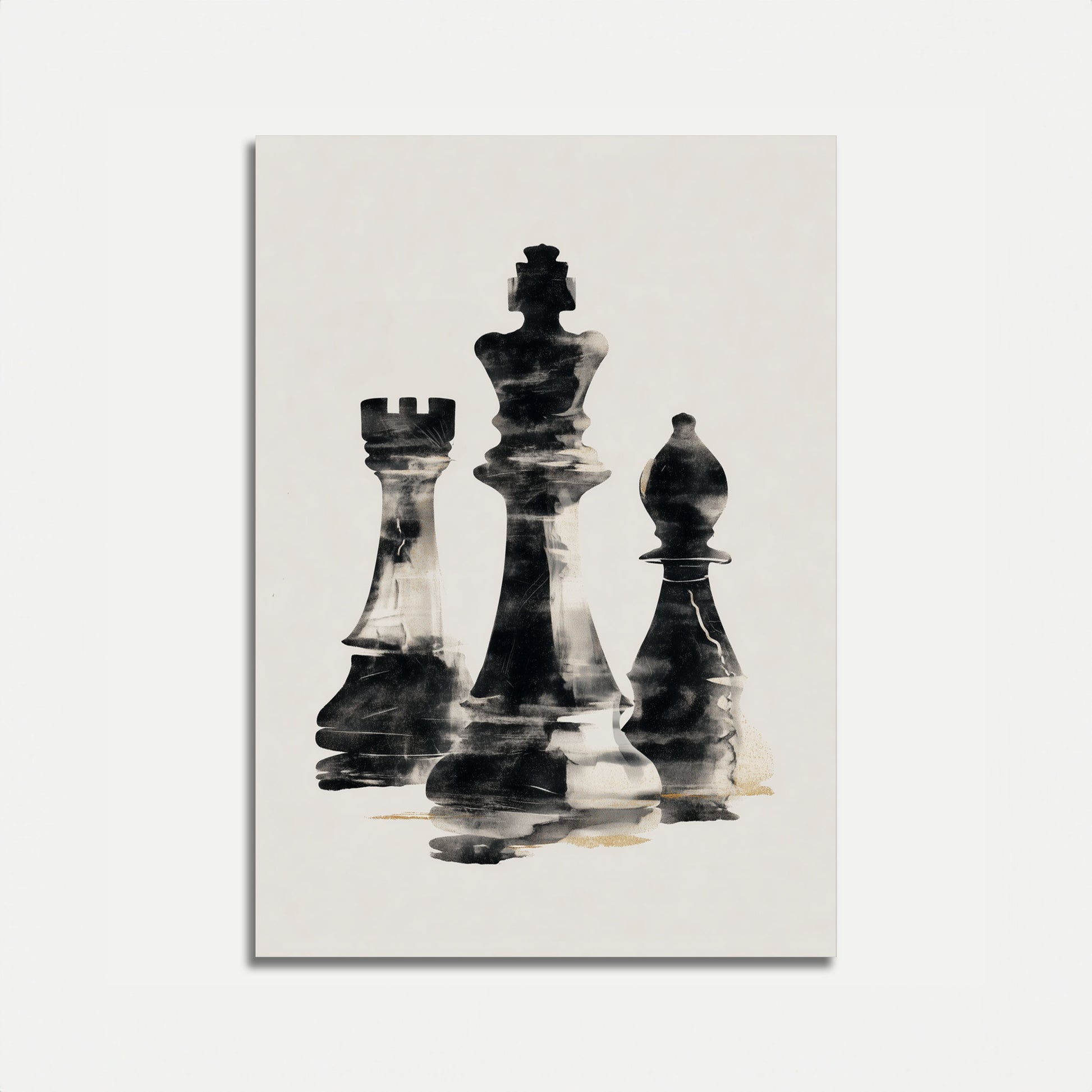 Ponořte se do éterického světa šachu s touto okouzlující uměleckou interpretací klasických šachových figur. Zobrazené v nevýrazných monochromatických tónech, obraz zachycuje tajemství a strategickou krásu hry prostřednictvím snového, kouřovitého vizuálního efektu. Král, věž a střelec vyvstávají z mlžných stínů a vytvářejí mocnou metaforu strategické složitosti a elegance šachu.