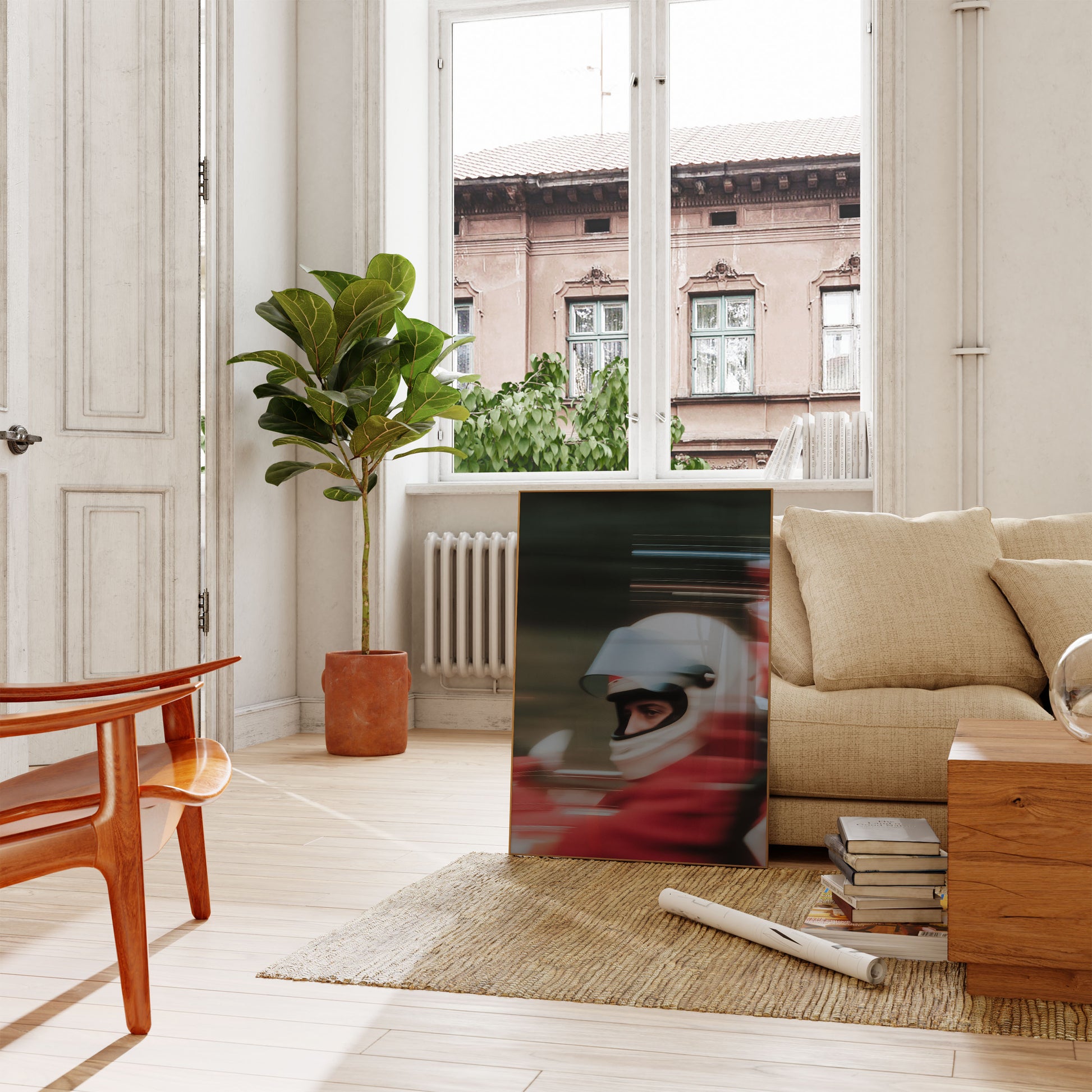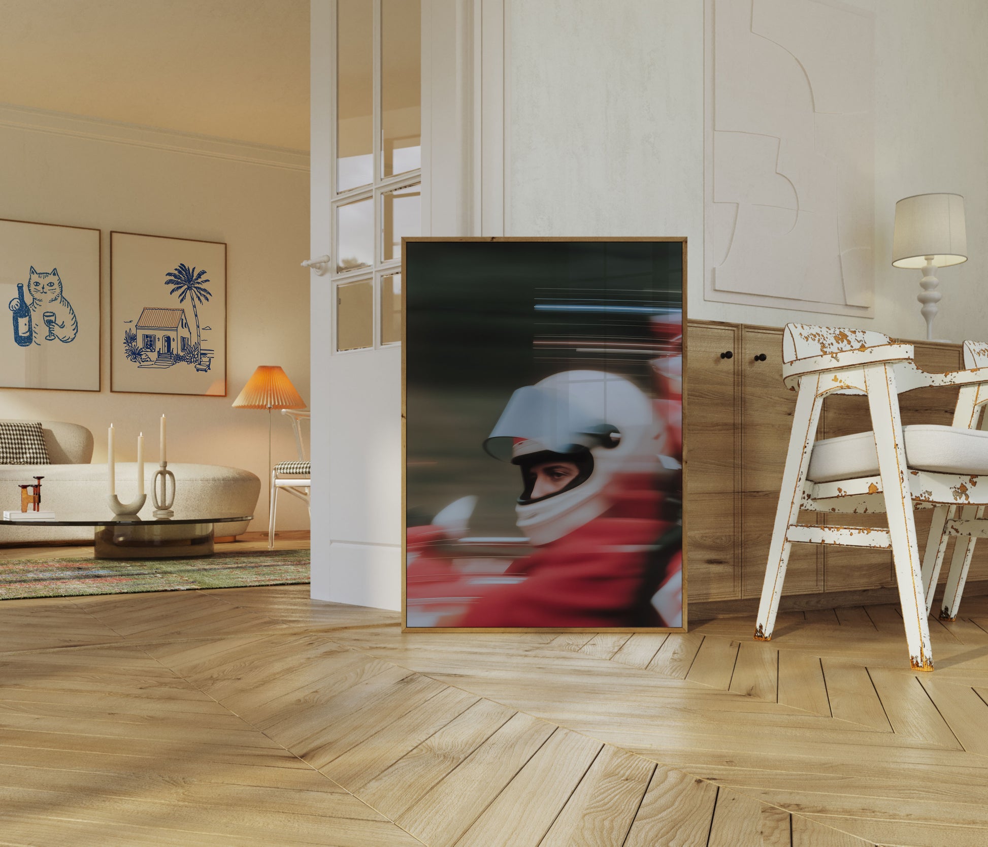 Zažijte srdceryvnou intenzitu závodů zachycenou v tomto dynamickém plakátu s rozmazaným pohybem. Bílá helma a rozmazané červené pozadí vytvářejí úžasnou vizuální reprezentaci rychlosti a adrenalinu, ukazující syrovou energii motoristické soutěže.