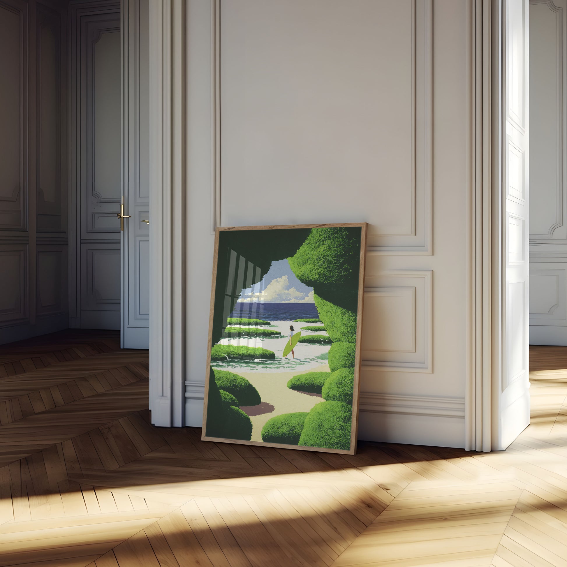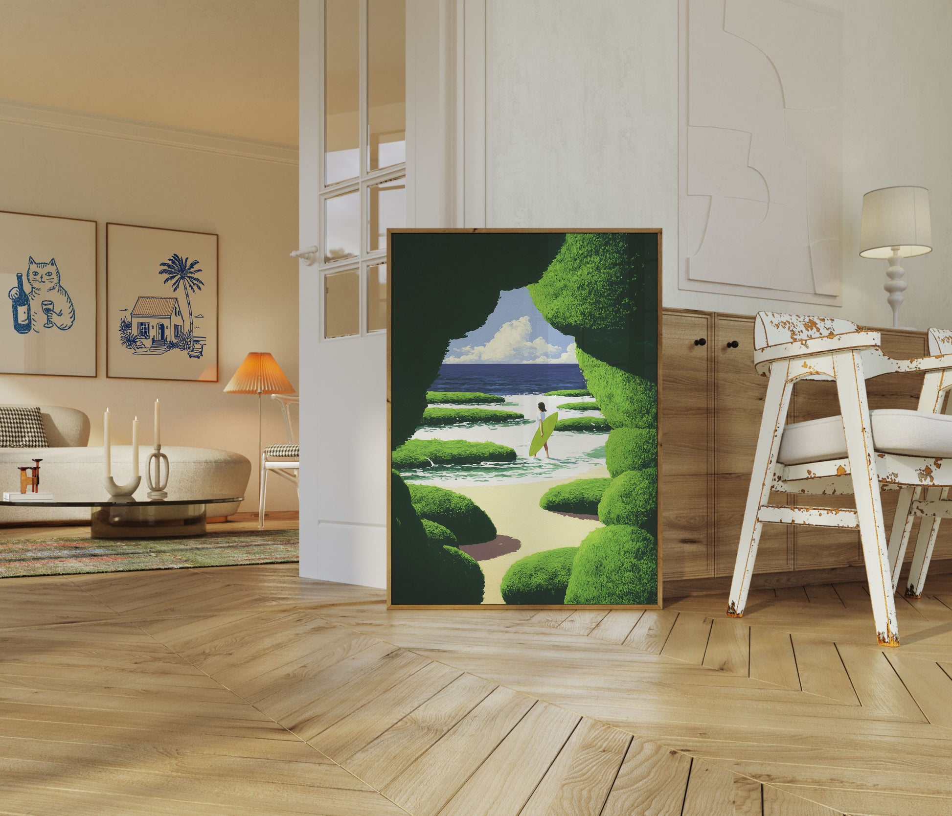 Omámující krajina, kde husté zelené mechem porostlé skály lemují klidnou mořskou stezku. Osamělý surfař nesoucí surfové prkno kráčí magickým terénem zelených kamenných útvarů, směřující k zářivě modrému horizontu s nadýchanými bílými mraky. Tento plakát zachycuje klidnou podstatu dobrodružství a přírodní krásy.