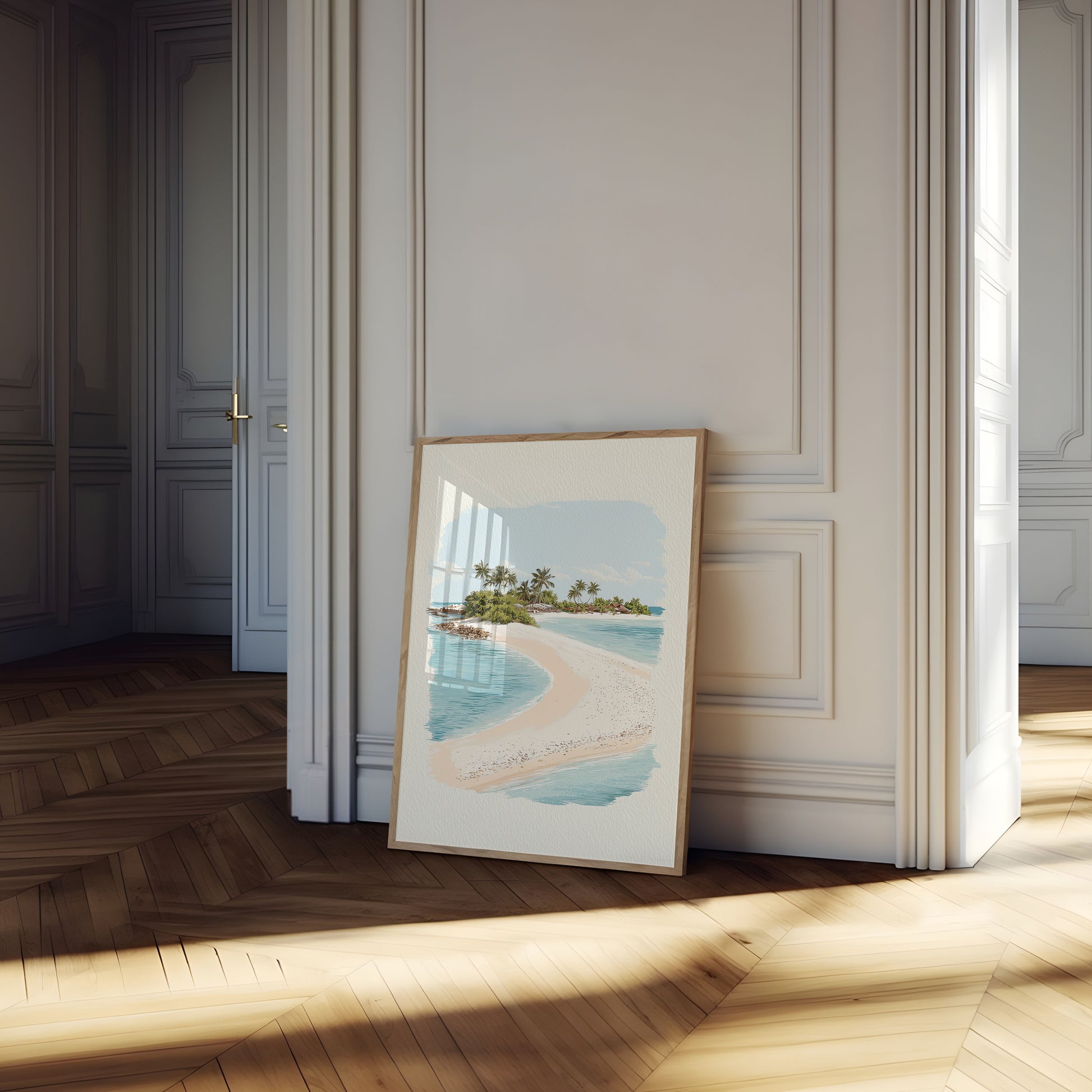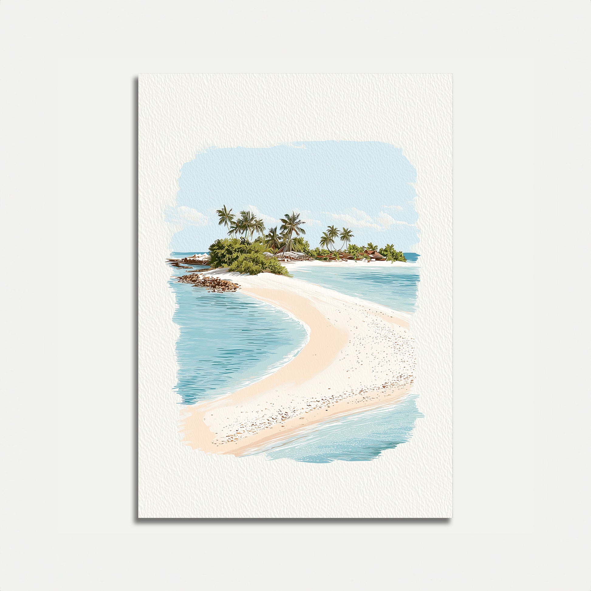 Unikněte do klidného tropického ráje pomocí tohoto úchvatného akvarelovém ilustrace panenské pískové pláže, křišťálově čistých tyrkysových vod a bujné palmové vegetace. Něžné křivky pobřeží a jemná barevná paleta vytvářejí klidný a lákavý výjev, který zachycuje podstatu dokonalého ostrovního útěku.