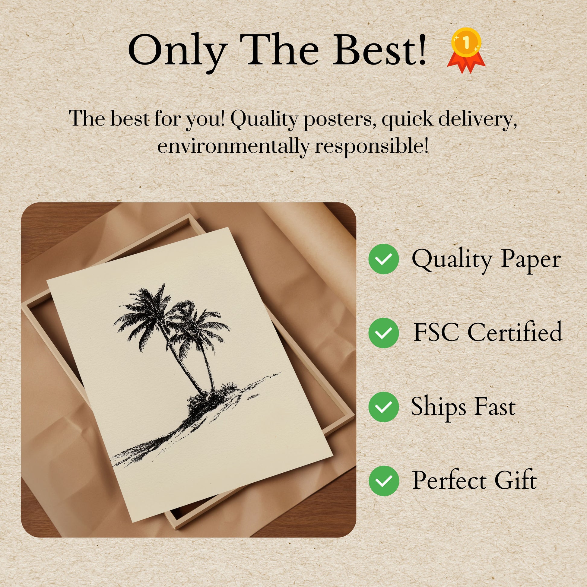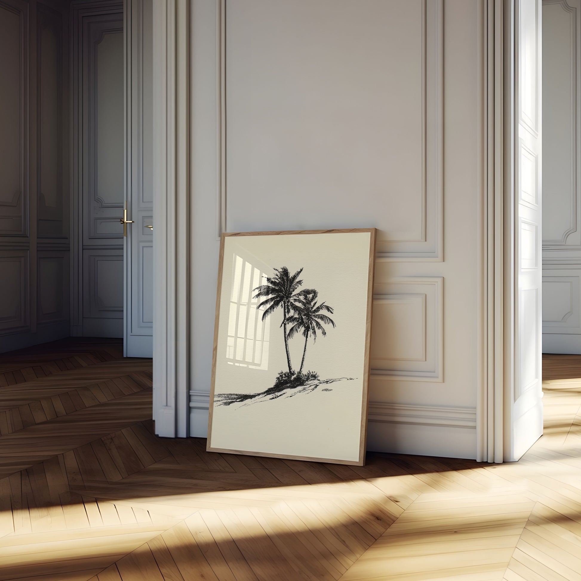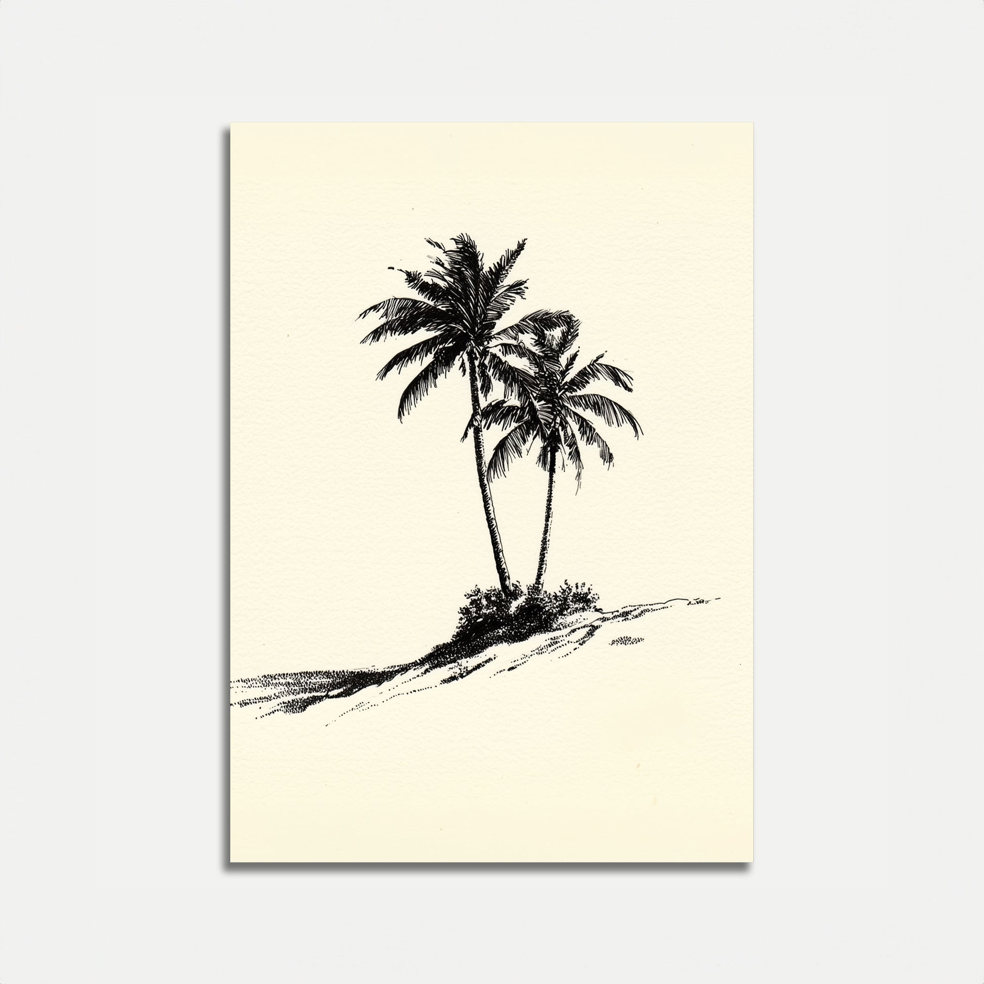 Tato působivá černobílá ilustrace zachycuje esenci tropického ráje se dvěma elegantními palmami stojícími jako strážcové na písečných břězích. Detailní linková práce a stipplovaná technika stínování vytvářejí klidnou, nadčasovou kvalitu, která evokuje klidnou krásu pobřežních krajin. Minimalistická estetika a klasický styl pero a tuše přinášejí uměleckou sofistikovanost do jakéhokoliv prostoru, ideální pro ty, kteří oceňují tichý půvab přírody a přitažlivost vzdálených pláží.