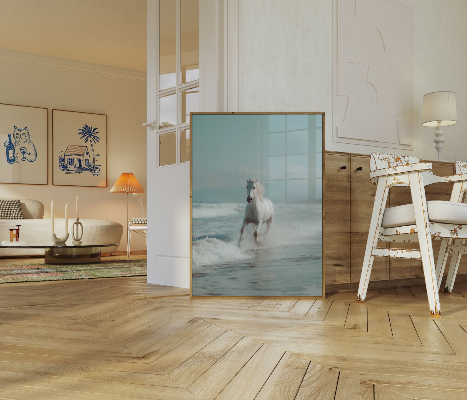 Majestátní bílý kůň mocně cválá mořskými vlnami, jeho vlající hříva a svalnaté tělo vytvářejí dechberoucí scénu přírodní krásy a divokého osvobození. Klidné tyrkysové pozadí a bílá pěna vytvářejí snovou atmosféru čistého pohybu a elegance.