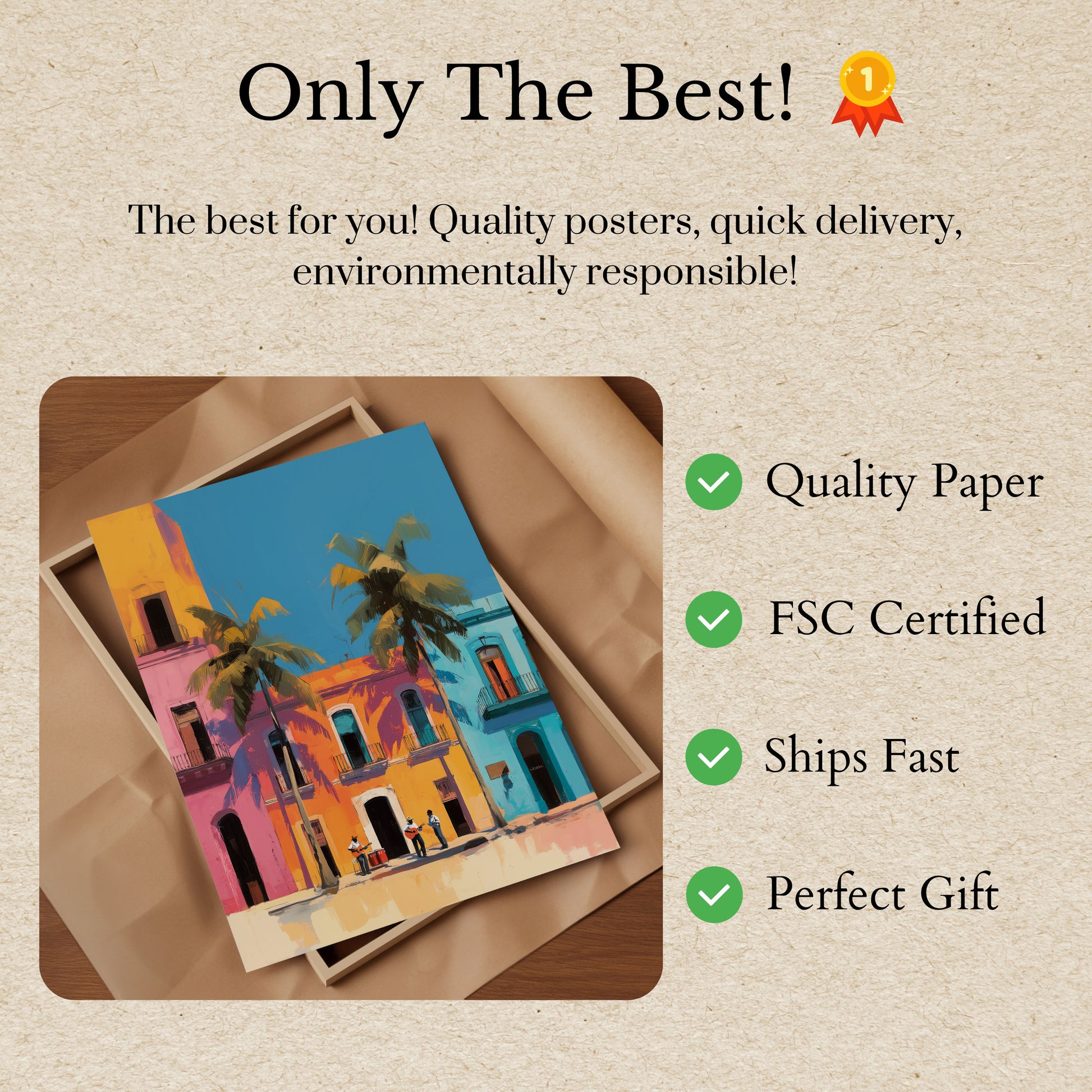 Træd ind i en vibrant verden af dristige farver og tidløs charme med dette fantastiske kunstværk med kolonial arkitektur. Dette plakat fanger en levende gadescene fyldt med strålende gule, lyserøde, blå og orange farver, der skaber en energisk og glædelig atmosfære. Kompositionen viser tre smukt malede koloniale bygninger med palmetræer, der svinger blidt i forgrunden, mens tre musikere bringer liv til pladsen nedenfor – en perfekt fejring af kultur, farve og arkitektonisk skønhed, der fremkalder varmen fra tropiske destinationer som Mexico eller Caribien.