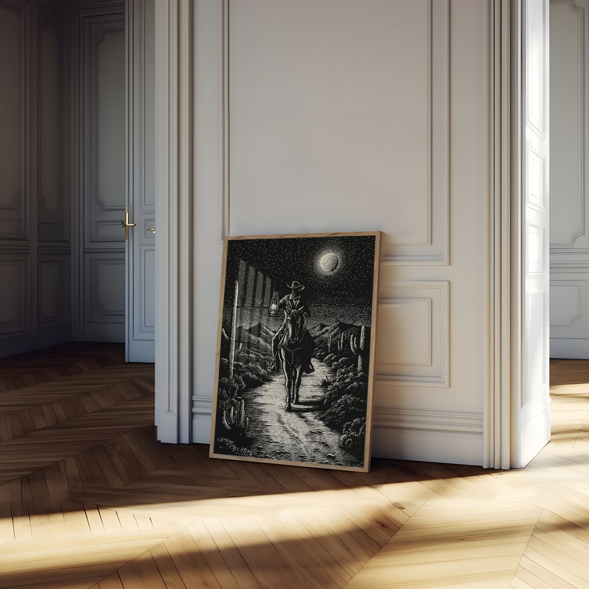 En bemærkelsesværdig sort-hvid illustration indfanger en ensom cowboy, der rider gennem et månebeskinnende ørkelandskab. Detaljeret linjearbejde afslører en ensom figur til hest, der holder en lanterne mod en stjerneklar nattehimmel med en lysende fuld måne. Den detaljerede ætsningsstil skaber en følelse af mystik og stille eventyr i den amerikanske Vesten.