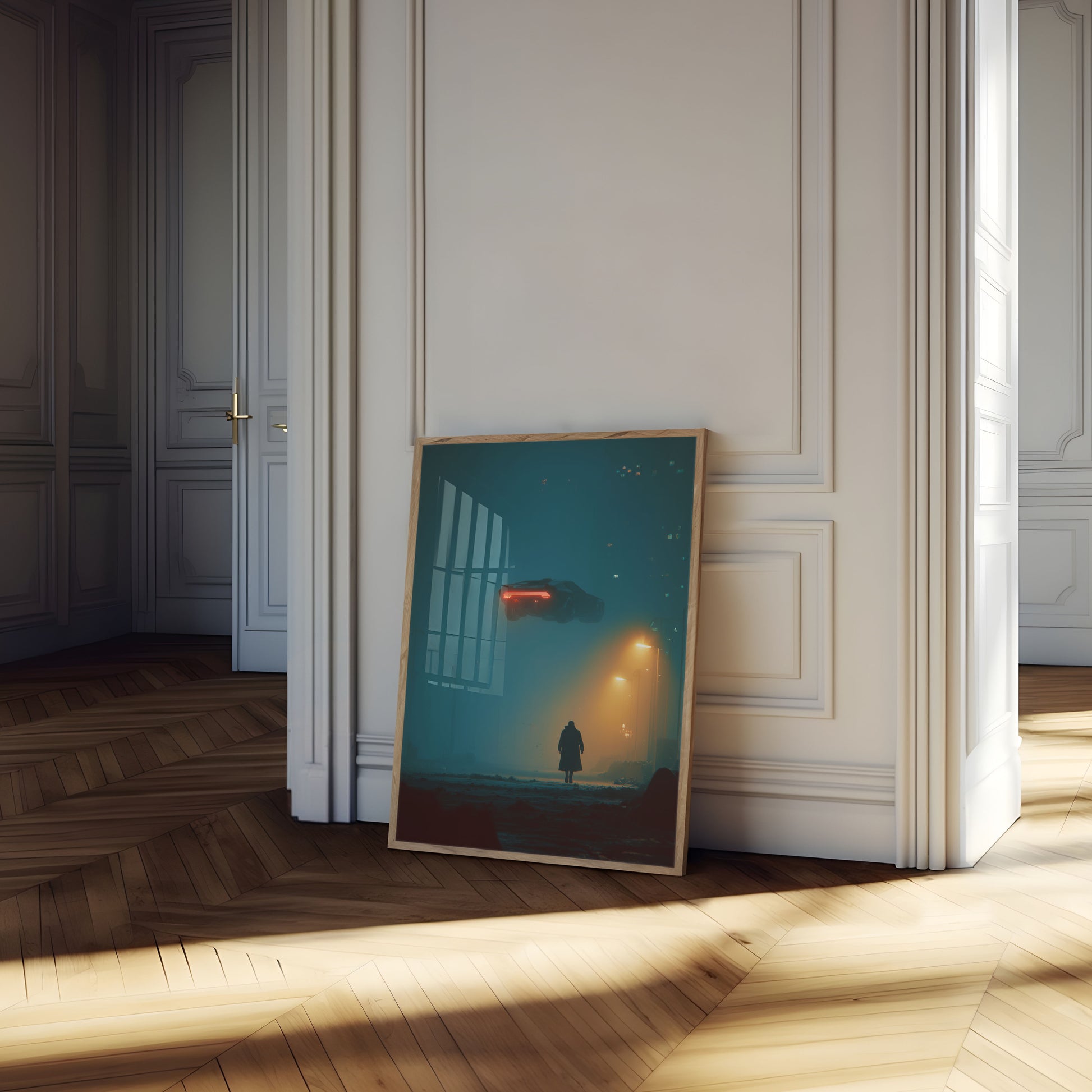 Dette fængslende sci-fi-kunstværk afbilder en ensom figur, der står under et svævende rumskib i et mystisk natligt landskab. Den dramatiske kontrast mellem UFO'ens glødende røde lys og de varme ravnfarvede gadbelysninger skaber en overordentlig atmosfære fyldt med undren og intrigue. Paletten af stemningsfuld blågrøn og orange, kombineret med protagonisten i silhuet, der står over for det ukendte, fremkalder en følelse af første kontakt, mysterium og kosmossets uendelighed, der vækker fantasi og nysgerrighed.