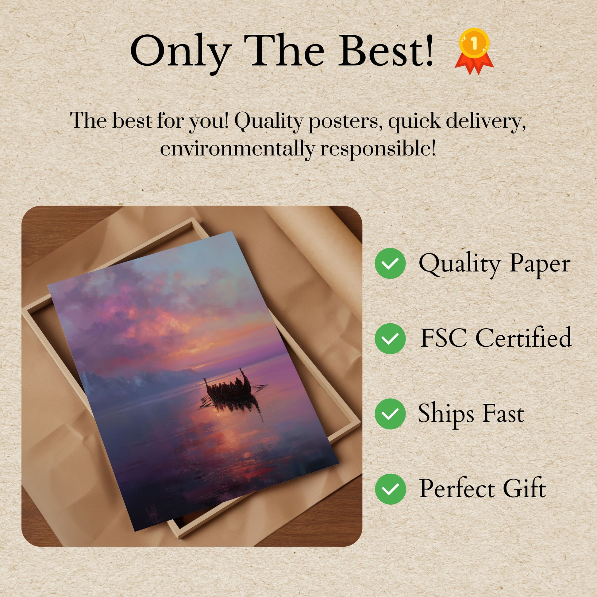 Oplev magien i en legendarisk vikingerejse fanget i dette spektakulære kunstværk. Et traditionelt langskib fyldt med krigere glider lydløst over spejlstille vande, badet i en ætereal glød fra en gylden solnedgang. Himlen eksploderer i nuancer af rosa, lilla og orange, mens majestætiske klipper rejser sig på mystisk vis fra tågen i baggrunden, hvilket skaber en atmosfære af eventyr, mystik og tidløs undren, der transporterer dig til vikingetidens æra for udforskning.