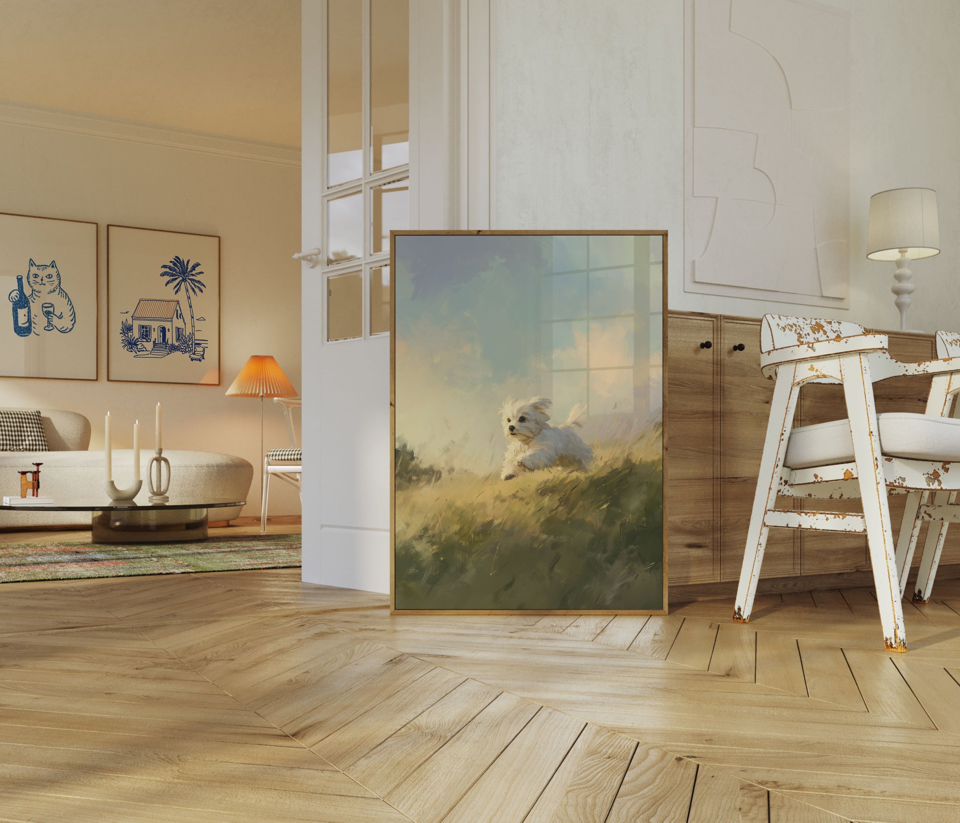 Et sart vandfarvebillede indfanger en lille hvid hund midt i en bevægelse, der springer gennem gyldne græssletter under en blød, drømmende himmel. Billedet stråler af ren glæde og frihed, med hvalpeens pels, der flyder i den blide brise og skaber en fornemmelse af bevægelse og lethed mod det fredelige landskab.