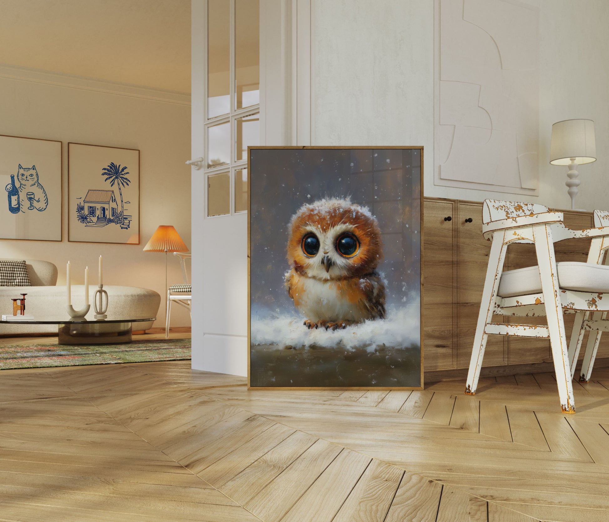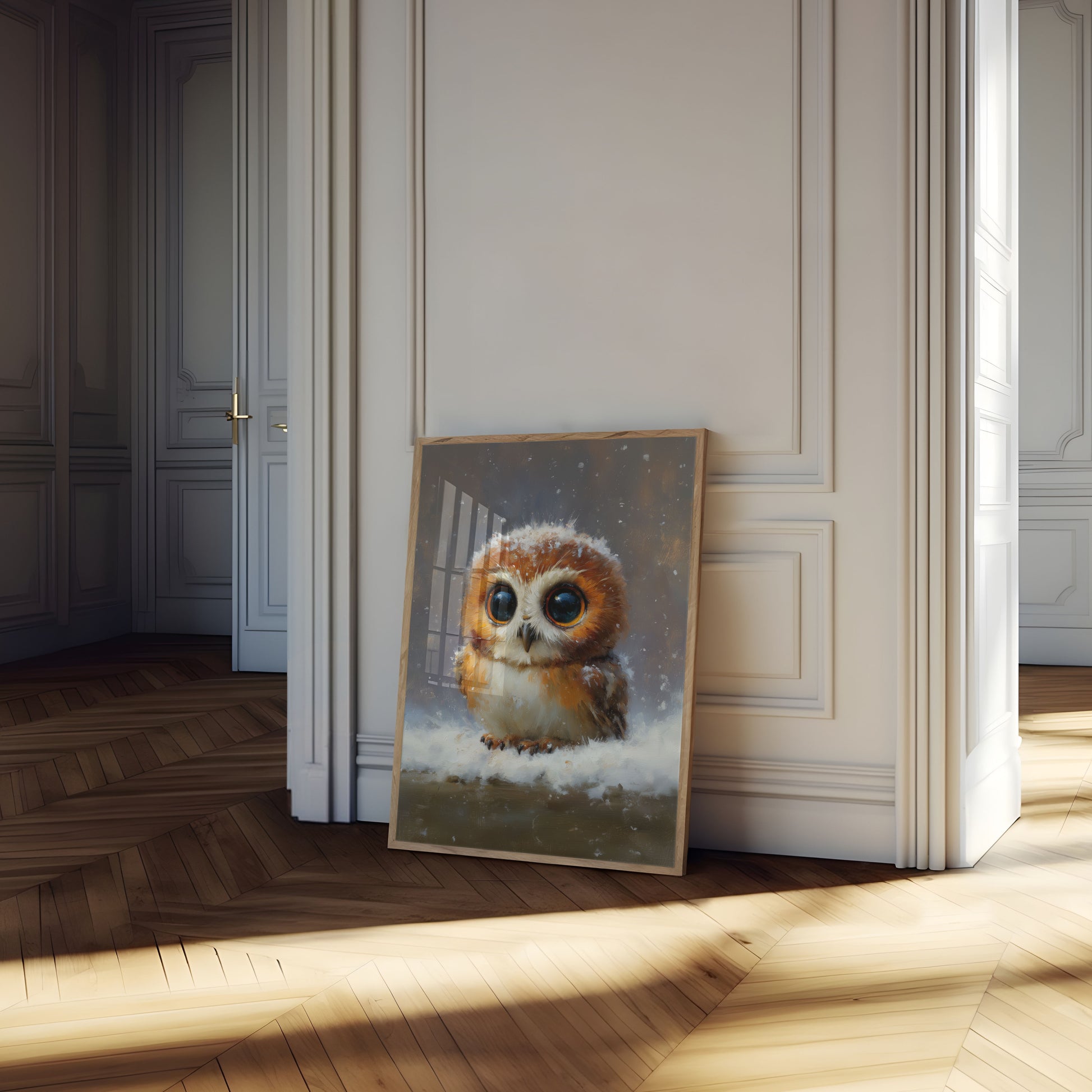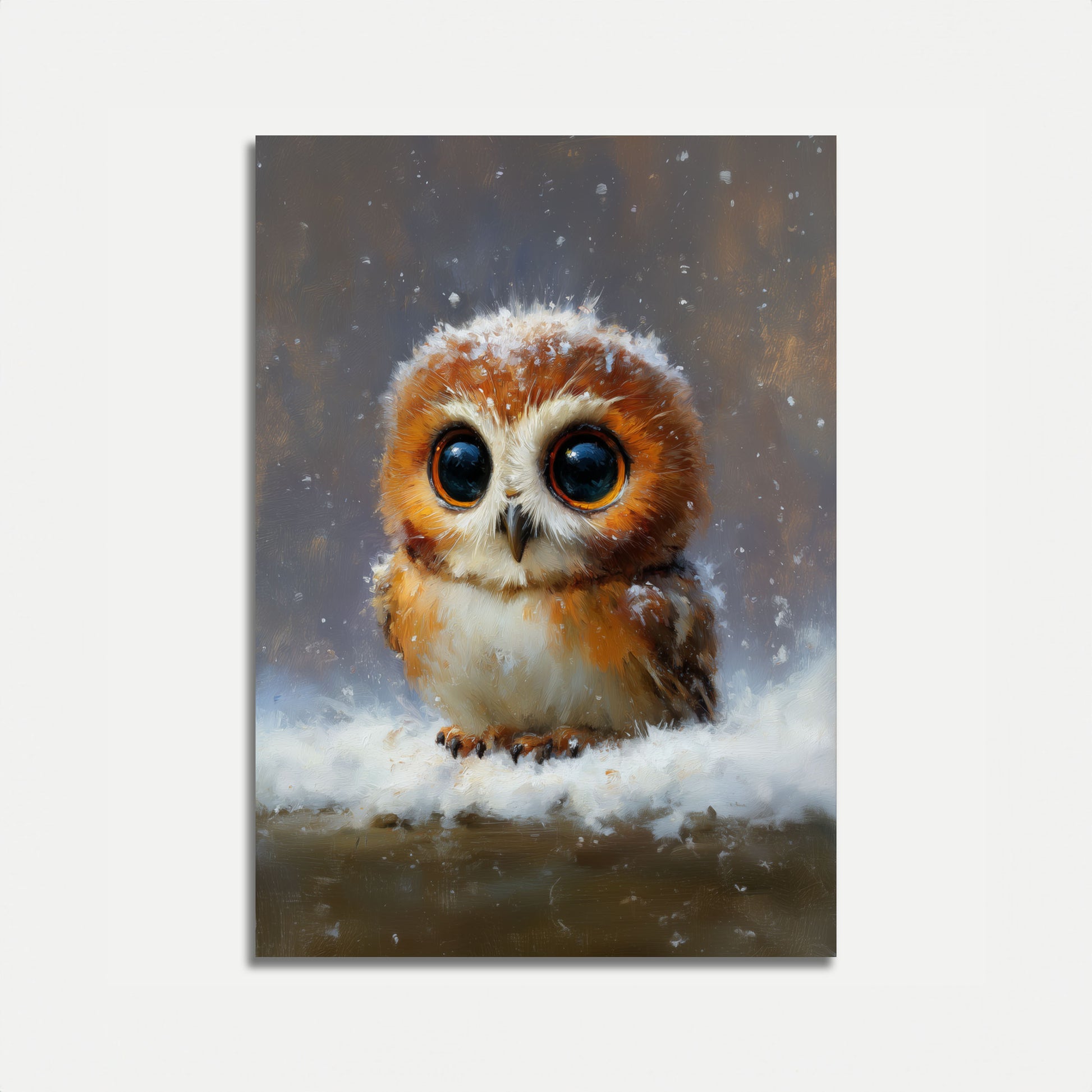 Indfang den fortryllende verden af en lille ugle placeret i et blødt, snedækket landskab. Dette storslåede kunstværk viser en vidtåben ugle med lysende ravfarvede øjne, hvis bløde orange og hvide fjer er drysset med fine snefnug. Den bløde, maleriske stil tilfører varme og karakter til denne charmerende vintercene, hvilket gør den til et perfekt tillæg til enhver naturelskers samling.