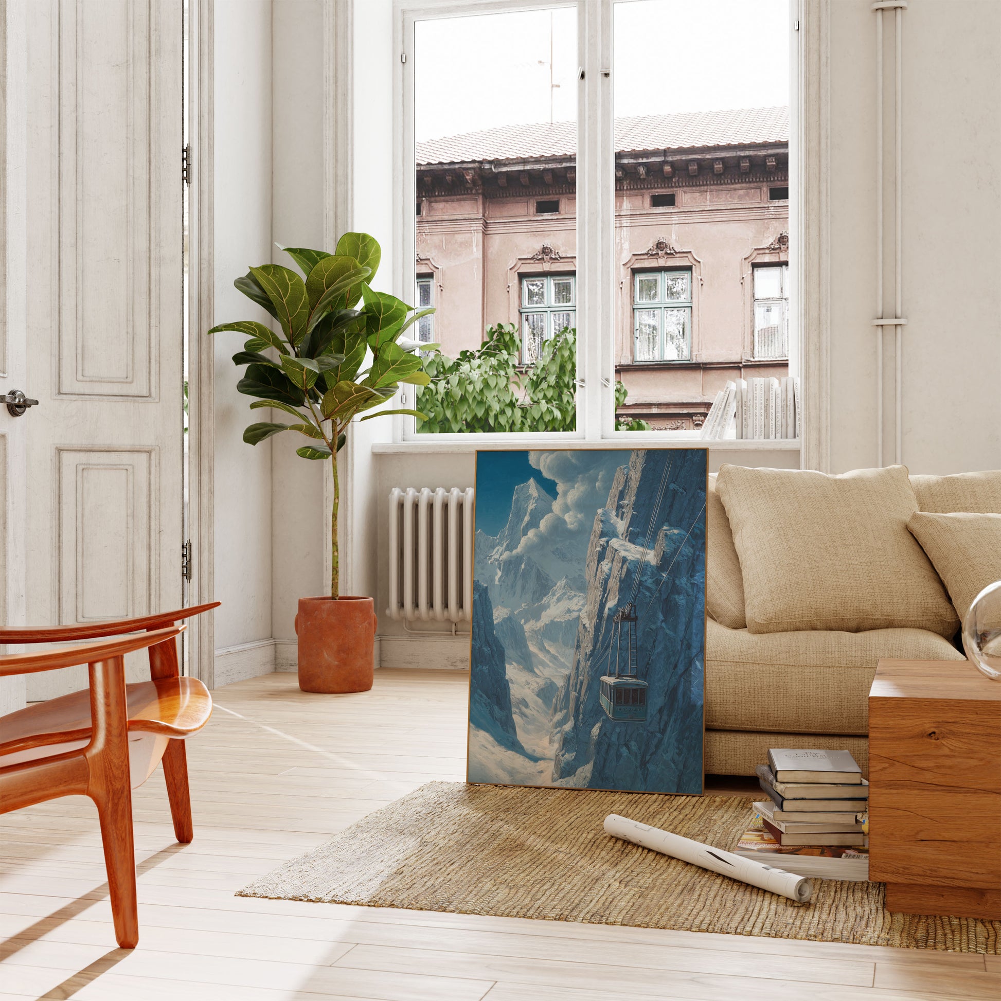 Svæv gennem det betagende alpine landskab med denne storslåede luftkabelbane-plakat. Majestætiske snedækkede bjergtoppe og dramatiske klippeskrænter skaber en betagende vintescene, der indfanger den rolige skønhed og tekniske bedrift ved bjergbefordring. De eteriske blå toner og vældende skyer bringer en følelse af fredelig eventyr til dette ekstraordinære landskabsudsyn.