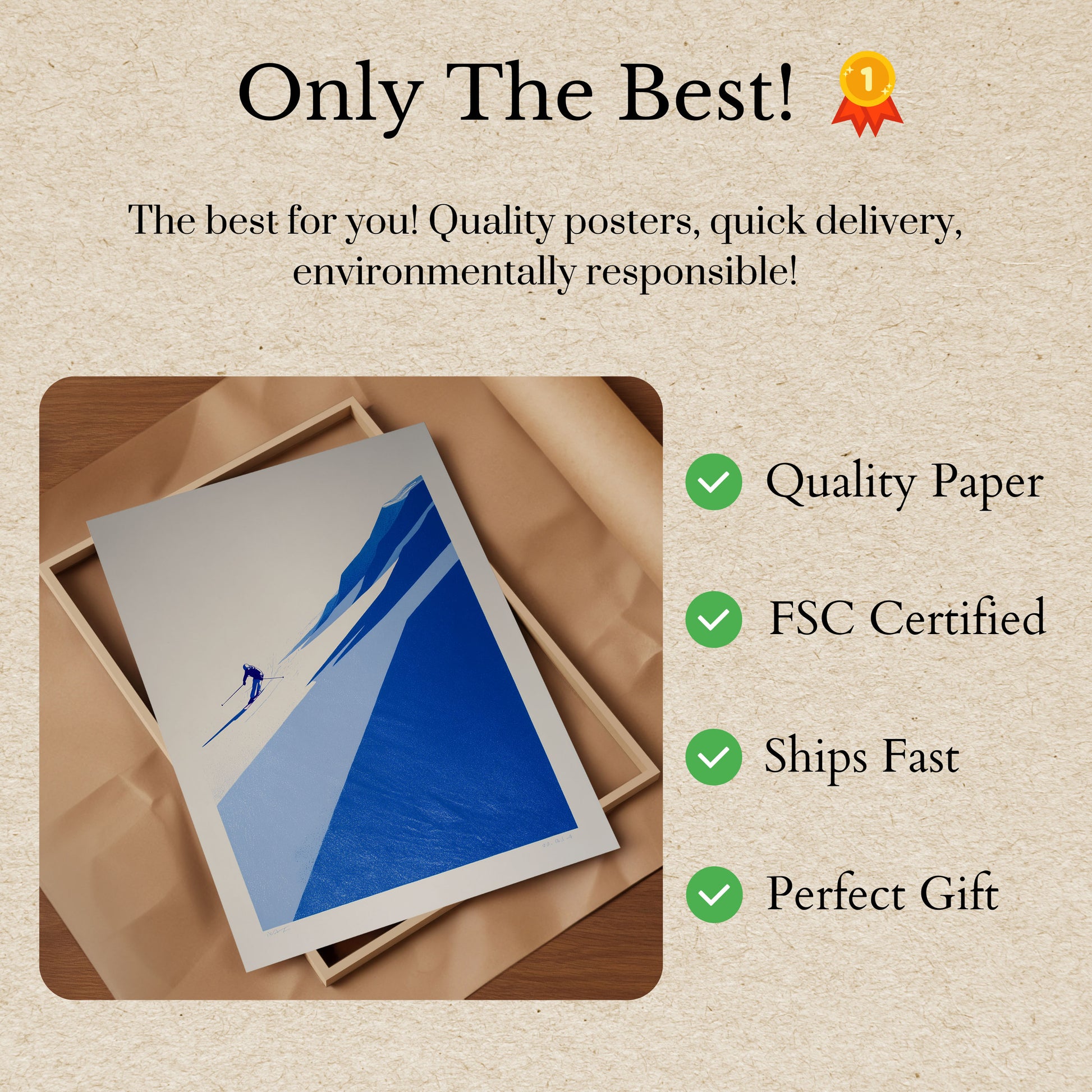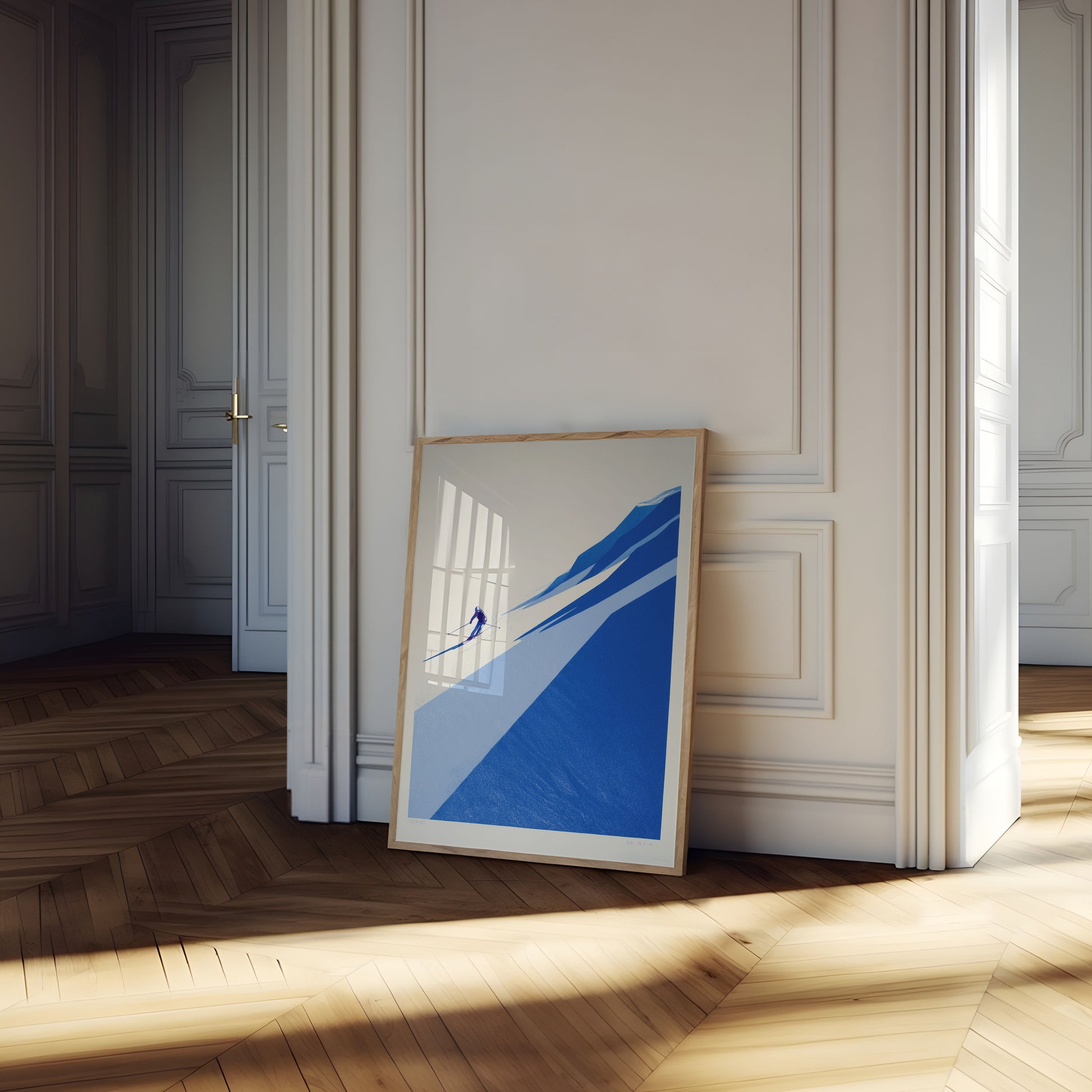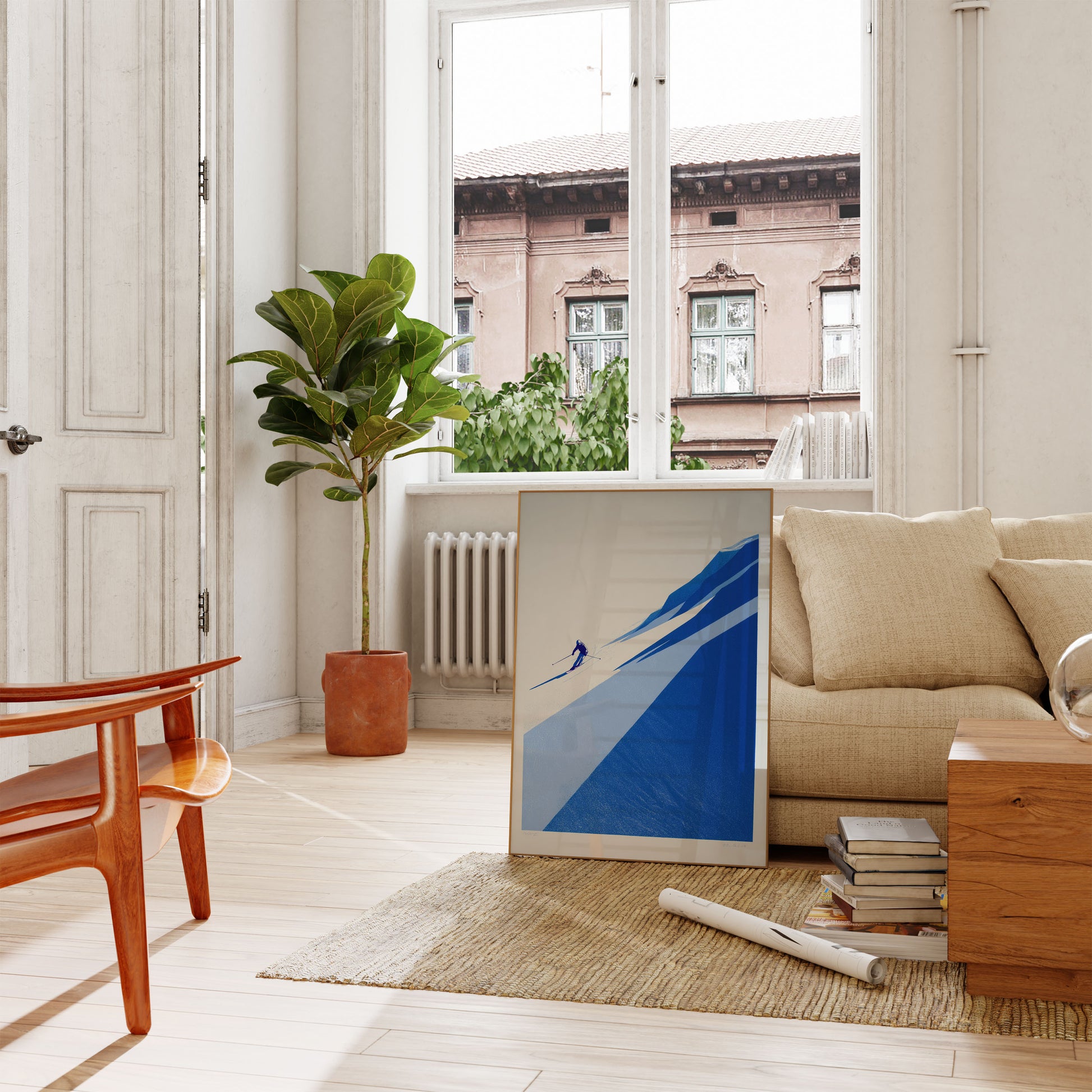 Oplev den forfriskende rus ved en ensom skiløber, der farer ned ad et minimalistisk blåt bjerglandskab. Dette iøjnefaldende kunsttryk indfanger vintersportens væsen med sin dristige geometriske design og betagende farvegraduering fra lys til dyb blå. Den elegante silhuet af skiløberen skaber en følelse af bevægelse og frihed mod den stiliserede bjergkulisse.