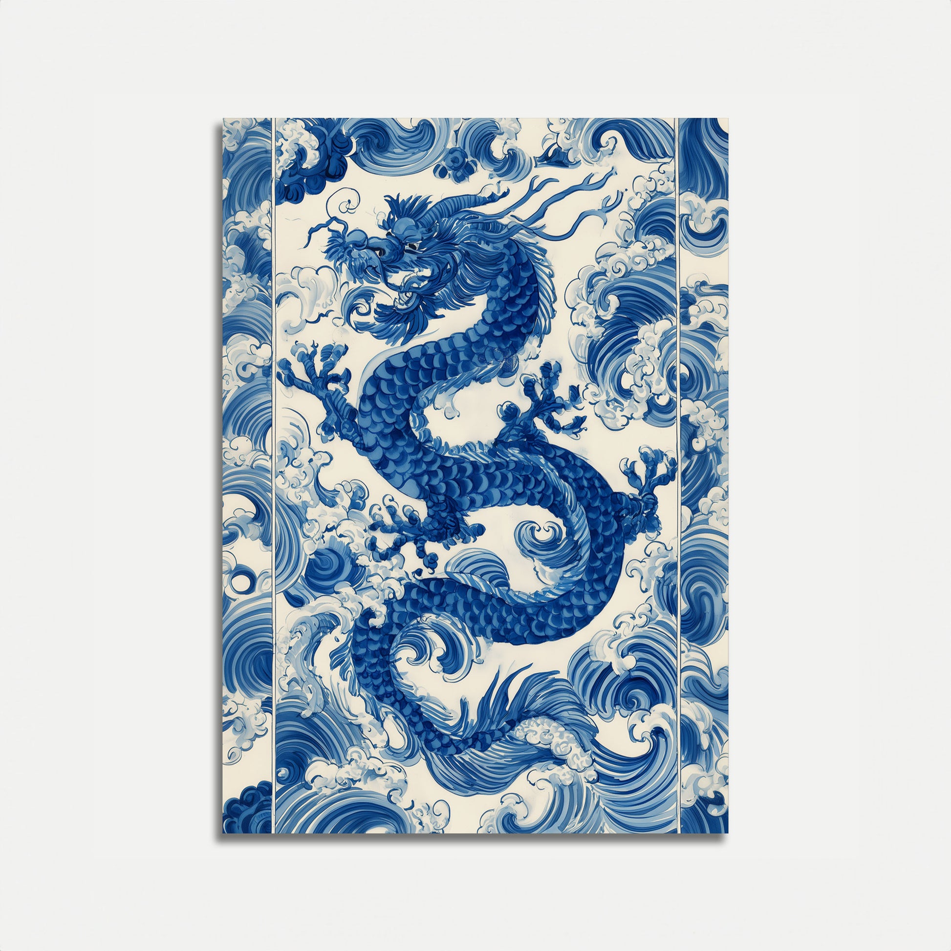 Dyp dig ned i dette betagende blå og hvide porcelænsinspirerede dragekunstværk, hvor en elegant slangeagtig skabning danser gennem bølgende havstrømme. De detaljerede detaljer og den monokrome blå palette skaber en hypnotiserende visuel symfonisk oplevelse, der indfanger den mytiske essens af traditionel østasiatisk kunst.