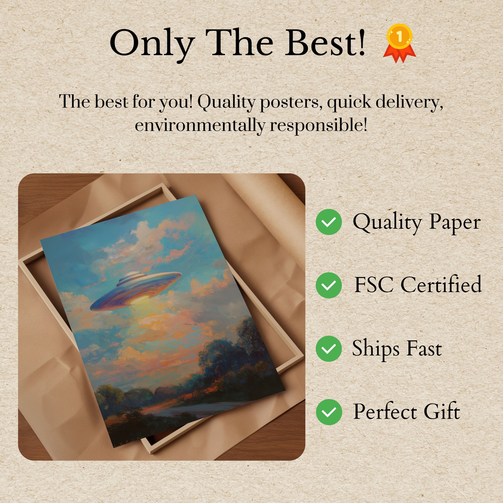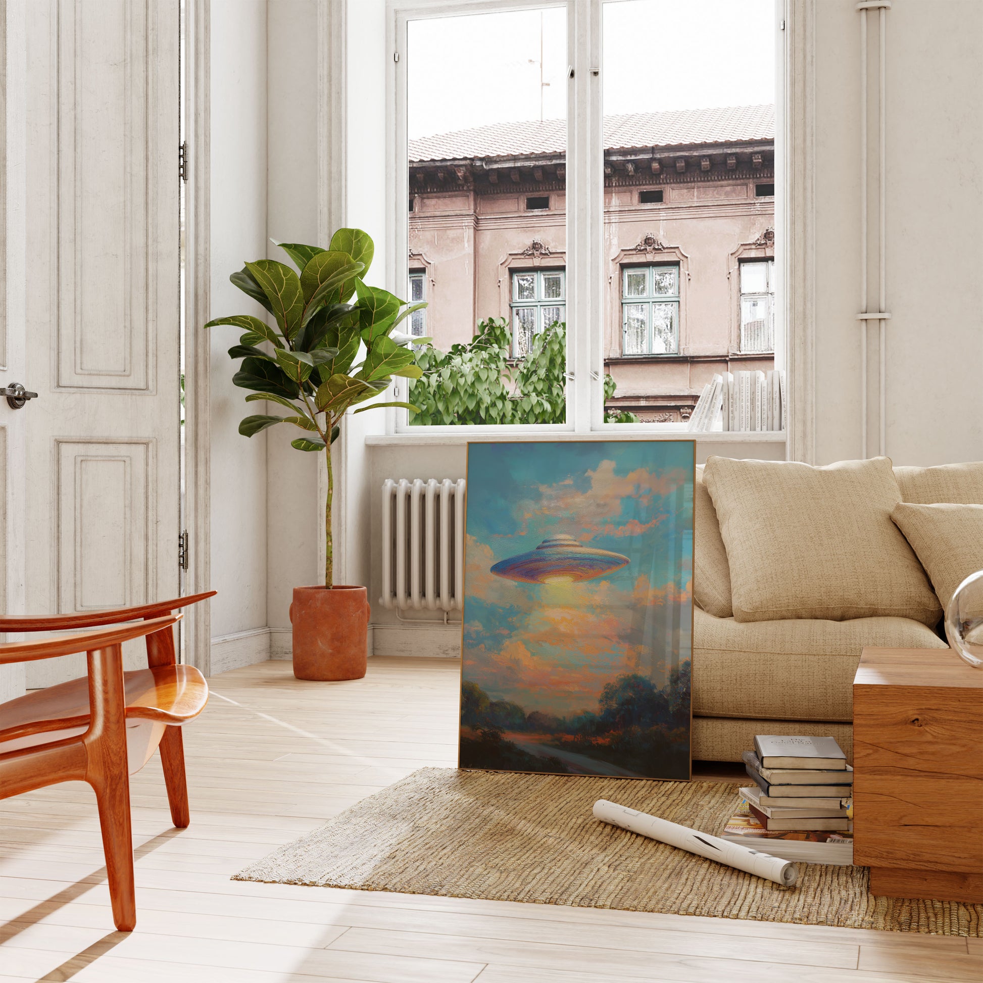 Et fortryllende kunstværk, der indfanger en levende UFO ophængt i en drømmeagtig himmel og blander surreelle farver og æteriske skyer. Det fremmede rumfartøj svæver majestætisk over et fredeligt landskab og udsender et overnaturligt skær, der forvandler det dagligdags til det ekstraordinære. Bløde blå, varme orange og rige violette farver skaber en storslået visuel fortælling om et mystisk kosmisk møde.