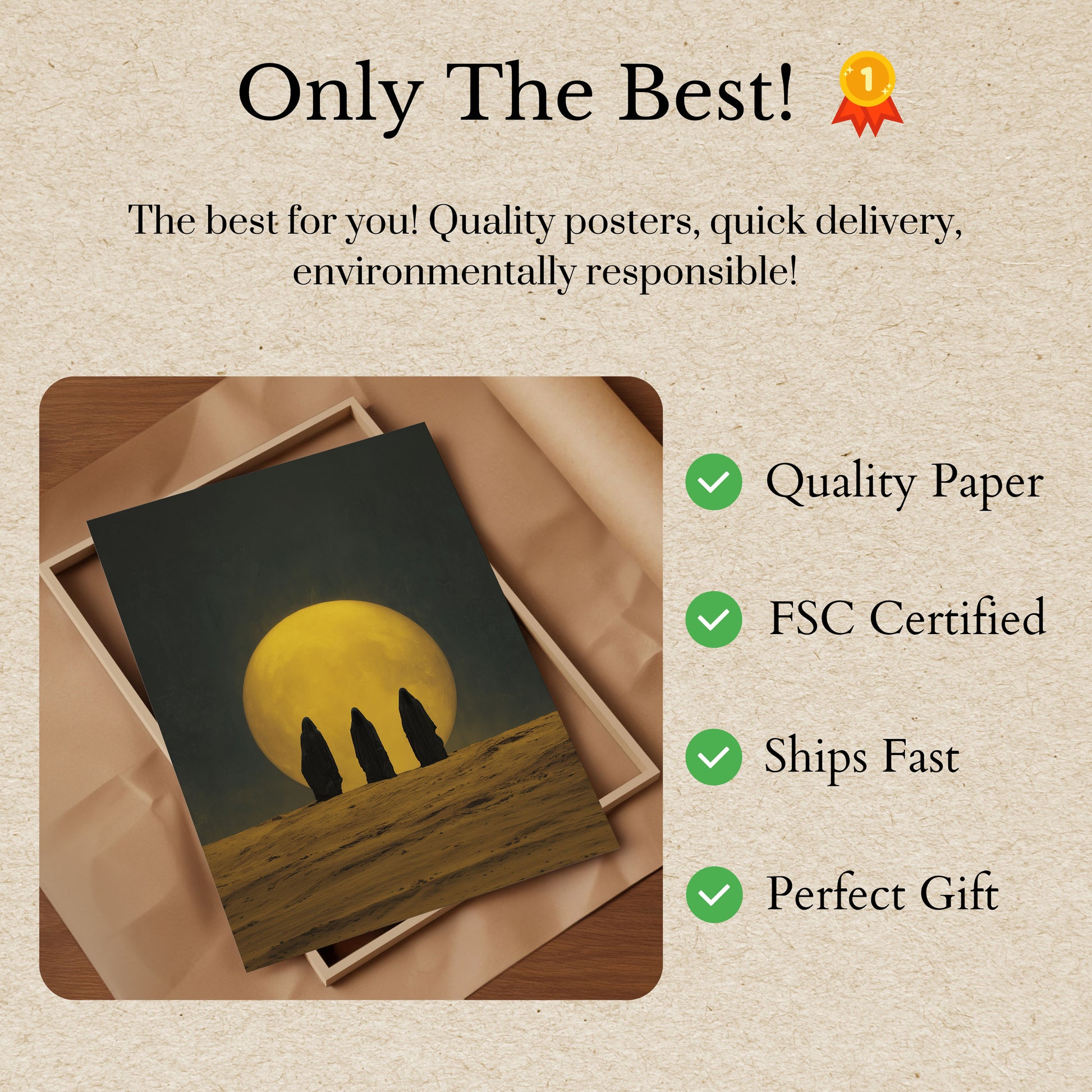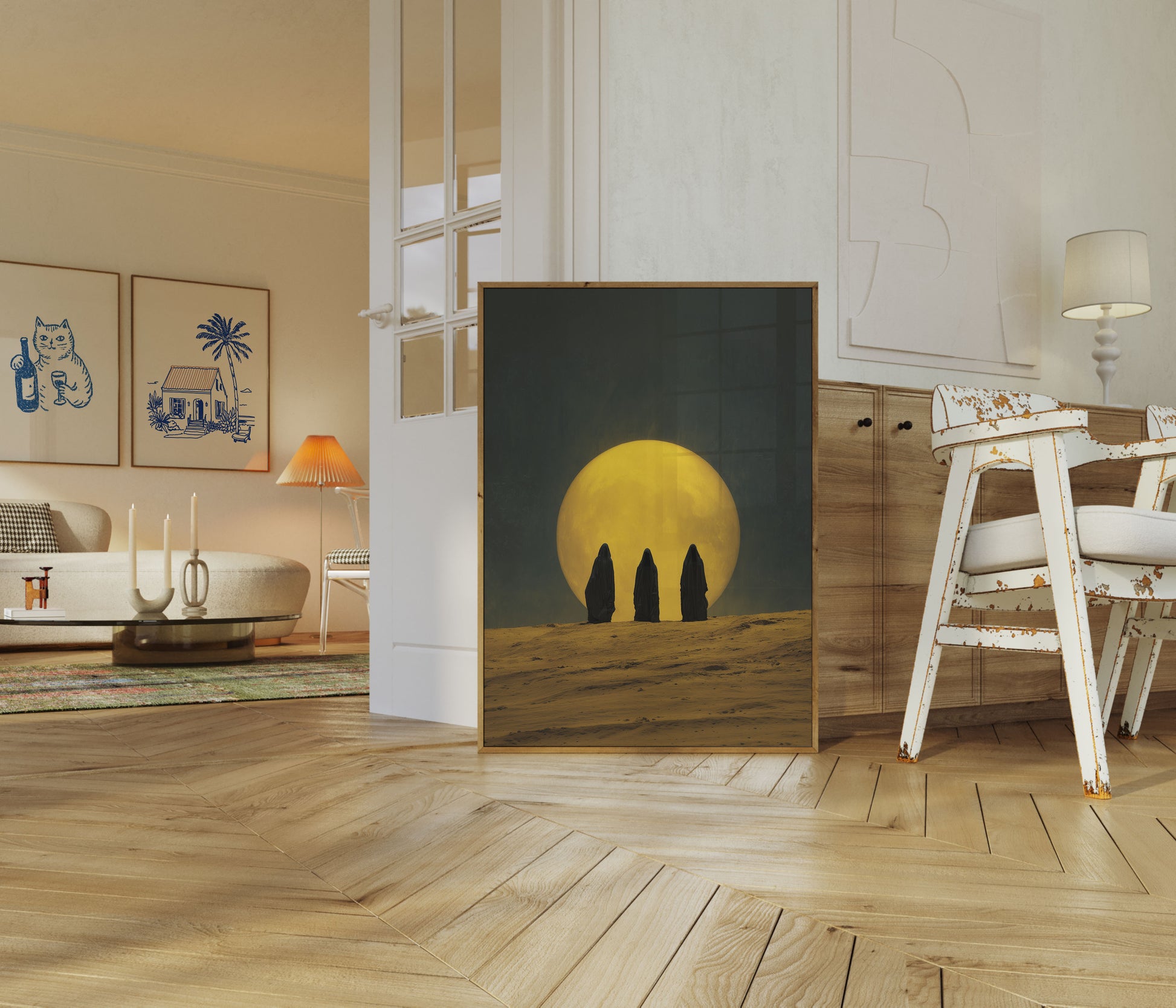 Tre mystiske skikkelser står i silhuet mod en kæmpemæssig gylden måne og skaber et ætereisk og uhyggeligt landskab. Den nøgne ørkenterræn og dramatiske belysning fremkalder en fornemmelse af dyb ro og udefrakommende isolation. Rige gule og dybe grønne nuancer skaber en fortryllende kontrast, der trækker beskueren ind i denne surreelle scene.