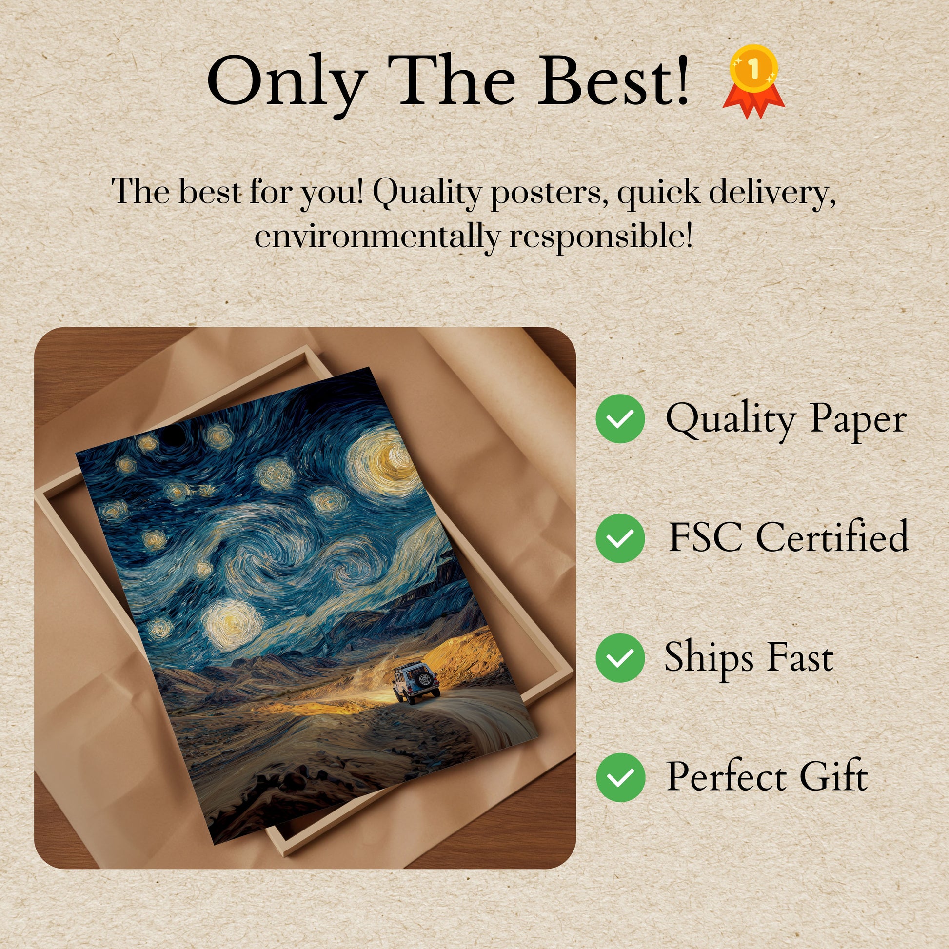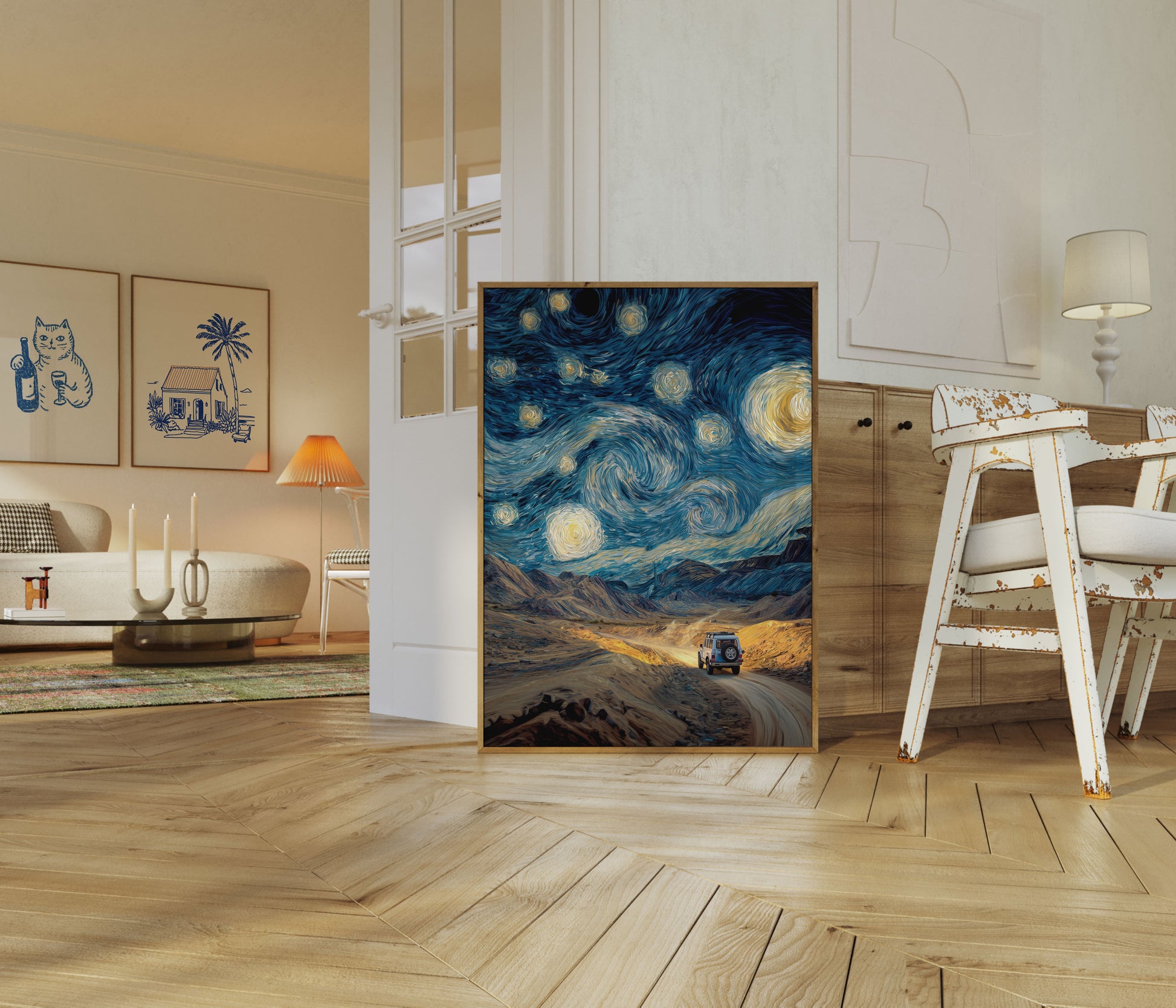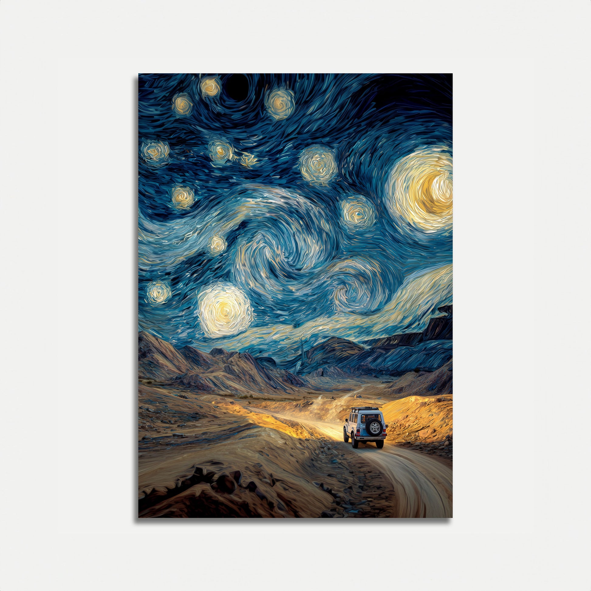 Oplev den fortryllende sammensmeltning af Van Goghs ikoniske 'Starry Night' og et barsk ørkelandskab, hvor svimlende himmelsk energi møder jordisk eventyr. En vintage SUV slynger sig gennem gyldne bjergstier under en hypnotisk himmel af blå og gyldne spiraler, hvilket skaber en drømmeagtig scene, der blander kunst, rejse og forestillingsevne.