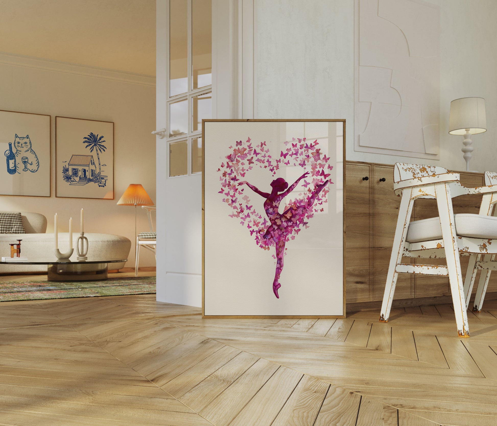 Dieses atemberaubende Kunstwerk zeigt eine anmutige Tänzerin im Sprung, deren Silhouette mit einer bezaubernden Wirbel aus rosa und magenta Schmetterlingen gefüllt ist. Die Komposition verbindet wunderbar die Eleganz des Balletts mit der zarten Symbolik von Schmetterlingen und schafft ein faszinierendes visuelles Bild, das Freiheit, Transformation und künstlerischen Ausdruck feiert. Sanfte Aquarellfarbtöne und eine träumerische Farbpalette machen dieses Werk perfekt für inspirierende Räume, in denen Anmut und Schönheit geschätzt werden.