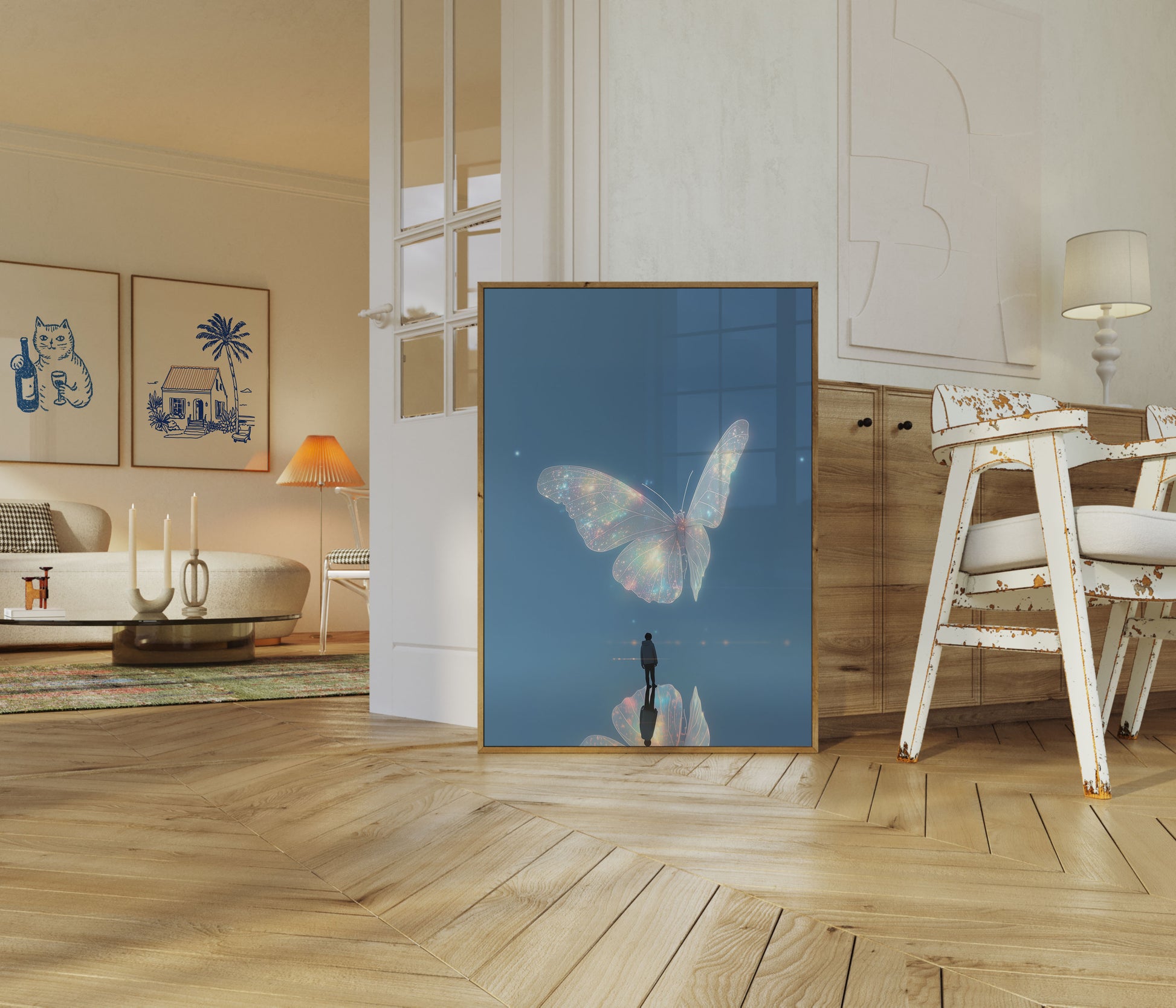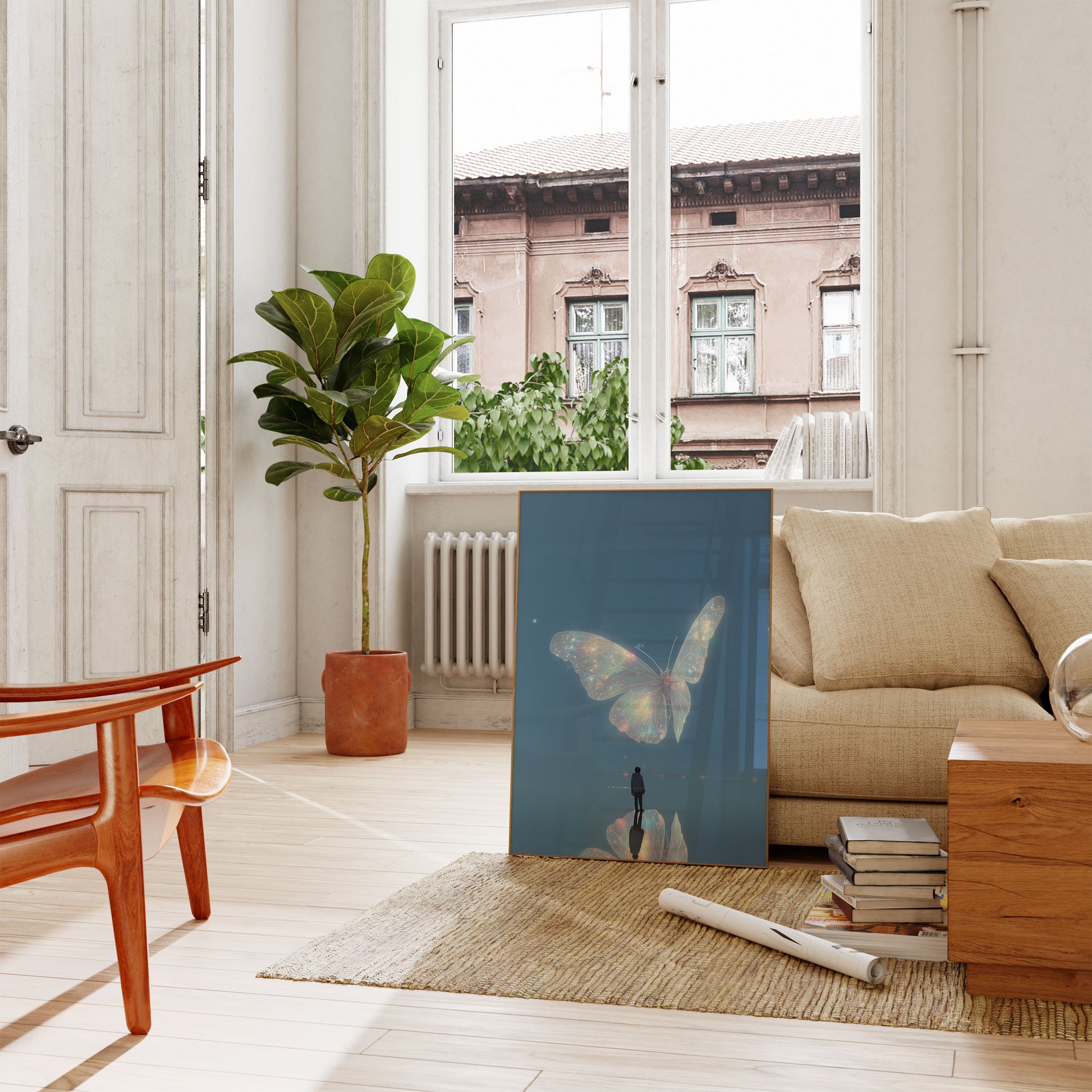 Ein hypnotisierender ätherischer Schmetterling mit durchscheinenden, sternenklaren Flügeln schwebt majestätisch über einer einsamen Gestalt, die auf einer leuchtenden Oberfläche steht. Das Bild fängt eine traumhafte Atmosphäre von Wunder und Introspektion ein, mit weichen Pastelltönen und funkelnden himmlischen Texturen, die den Schmetterling in ein magisches, überirdisches Wesen verwandeln.