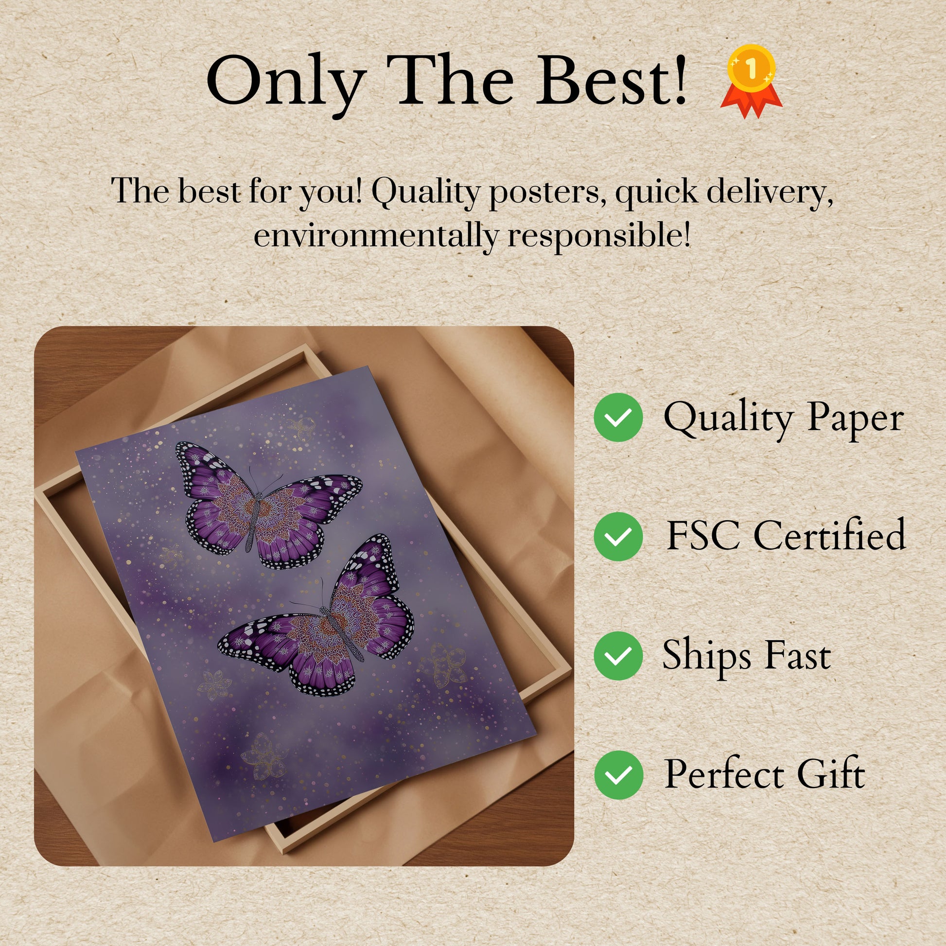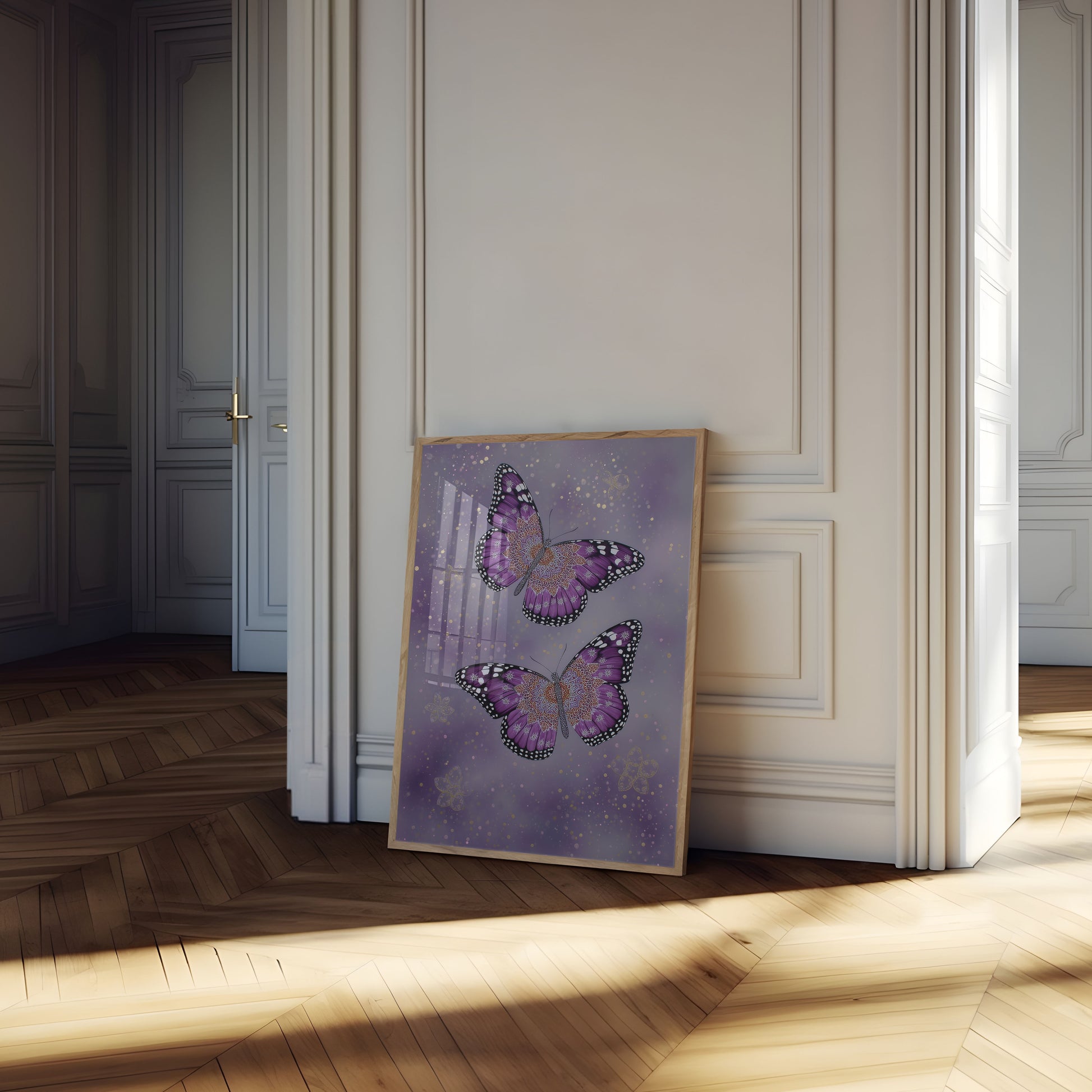 Tauchen Sie ein in die bezaubernde Welt dieser atemberaubenden violetten Monarchfalter, zart geschmückt mit kunstvollen Mandala-Mustern. Der ätherische Hintergrund funkelt mit goldenen und weichen violetten Bokeh-Lichtern und schafft eine faszinierende himmlische Atmosphäre, die dieses Poster in ein magisches Kunstwerk verwandelt. Jeder Schmetterling ist ein Meisterwerk der Details, mit weiß gefleckten Flügeln und einem kunstvollen zentralen Design, das natürliche Schönheit mit künstlerischer Komplexität verschmilzt.