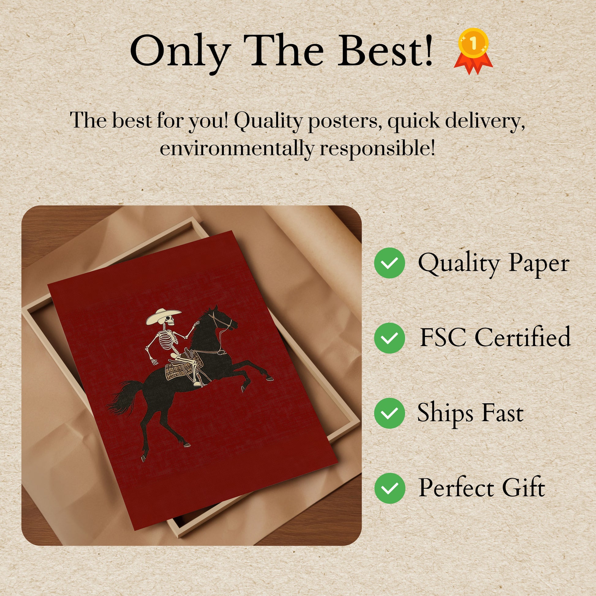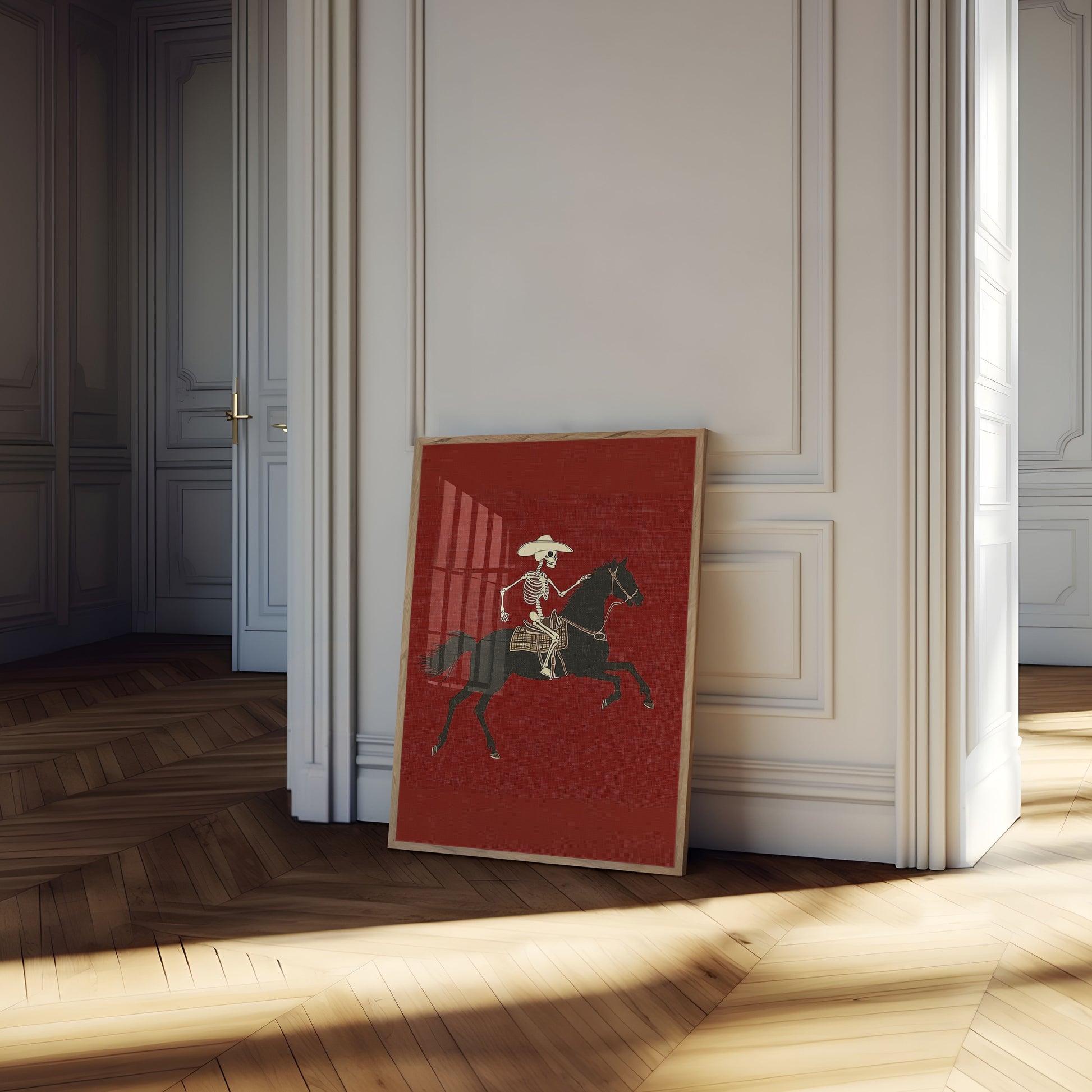 Eine beeindruckende Darstellung eines Skelettreitesr auf einem dunklen Pferd, vor einem reichen, roten texturierten Hintergrund. Das Skelett, geschmückt mit einem klassischen Cowboyhut, sitzt selbstbewusst auf dem Pferd und schafft ein kraftvolles und mysteriöses, vom Tag der Toten inspiriertes Kunstwerk. Dieses einzigartige Poster verbindet Symbolik der mexikanischen Volkskunst mit einer dramatischen visuellen Erzählung.