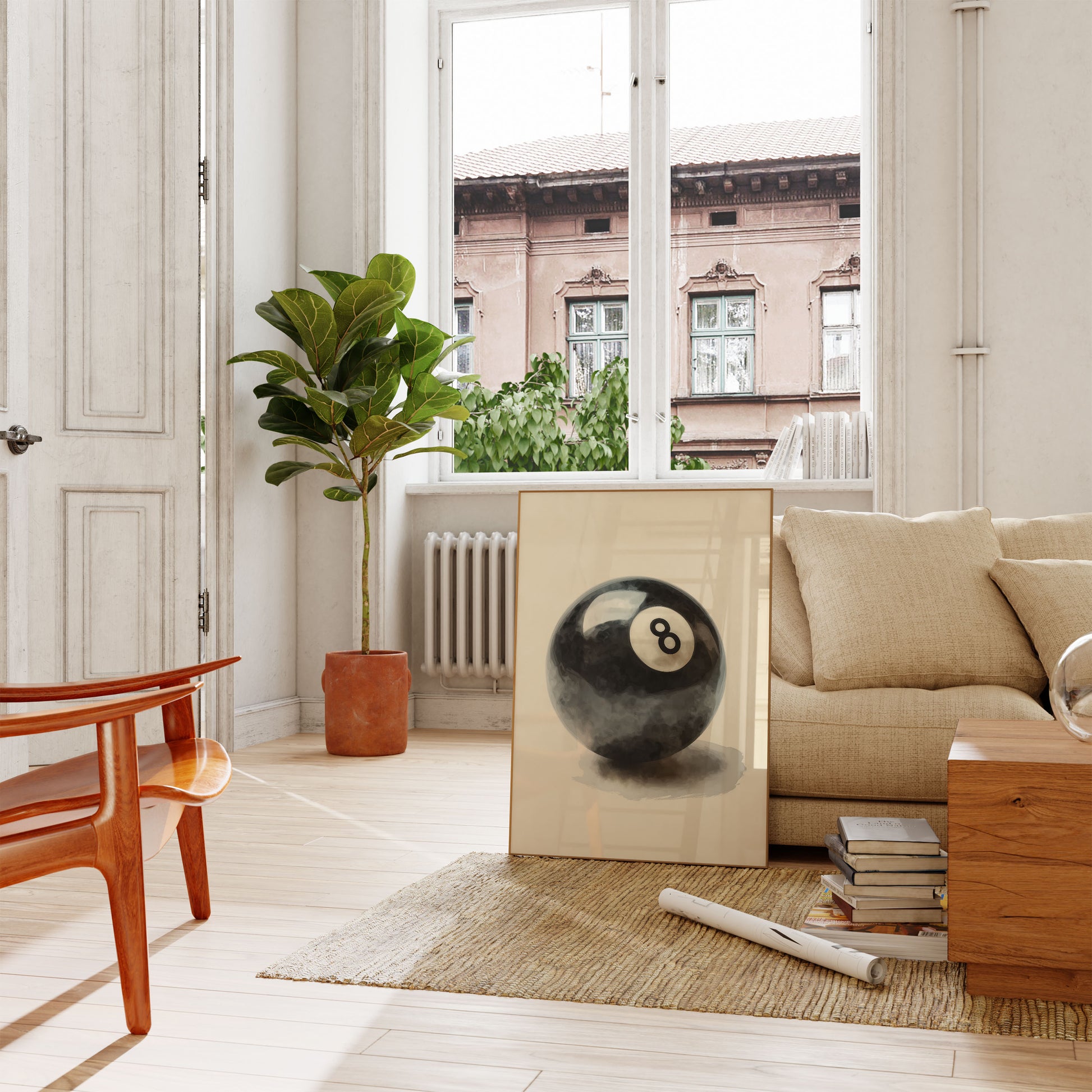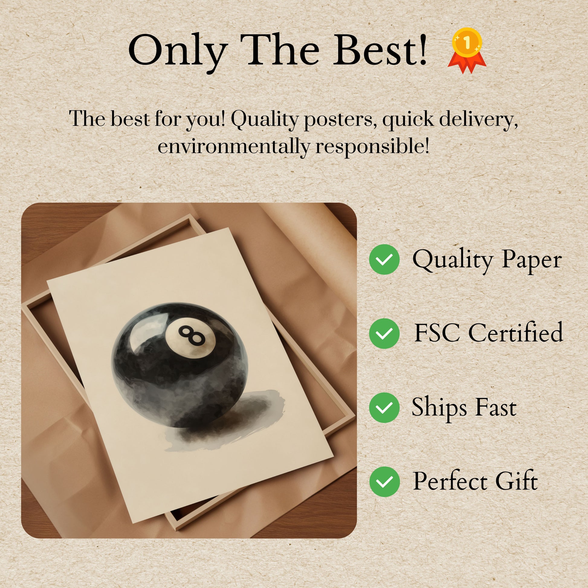 Tauchen Sie ein in die geheimnisvolle Welt des Billards mit diesem aufregenden schwarzen und weißen 8-Ball-Poster. Das Bild fängt eine wunderschön dargestellte Poolkugel mit unglaublicher Tiefe und Textur ein, mit einer glänzenden Oberfläche, die Licht und Schatten mit bemerkenswerter Präzision reflektiert. Sein stimmungsvoller, fast malerischer Stil verwandelt ein alltägliches Spielobjekt in ein faszinierendes Kunstwerk, das sowohl Poolliebhaber als auch Kunstbegeisterte gleichermaßen faszinieren wird.