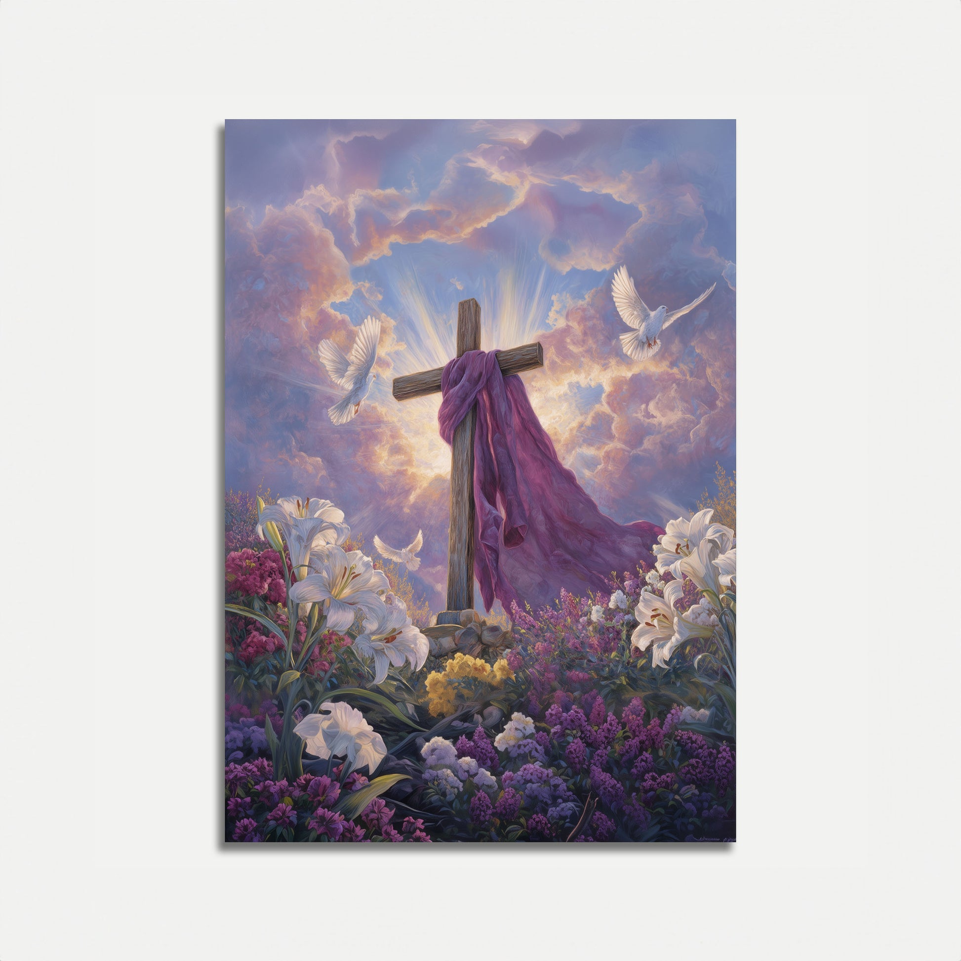 Dieses atemberaubende spirituelle Kunstwerk zeigt ein Holzkreuz, das in reichem violettem Stoff drapiert ist und majestätisch in einem Garten weißer Lilien und leuchtender Blumen steht. Goldene Strahlen göttlichen Lichts strahlen hinter dem Kreuz aus und durchbrechen leuchtende Wolken am Himmel, während zwei weiße Tauben friedlich auf beiden Seiten flattern. Die ruhige Komposition vereint Elemente des Glaubens, der Hoffnung und der spirituellen Gnade und schafft eine erhebende Atmosphäre, die zur Seele spricht. Perfekt für alle, die Inspiration, Trost oder einen bedeutungsvollen religiösen Brennpunkt in ihrem Zuhause suchen, erfasst dieses Poster das Wesen der Erlösung und des himmlischen Friedens mit seiner sanften, ätherischen Farbpalette und meisterhaft gestalteten botanischen Elementen.
