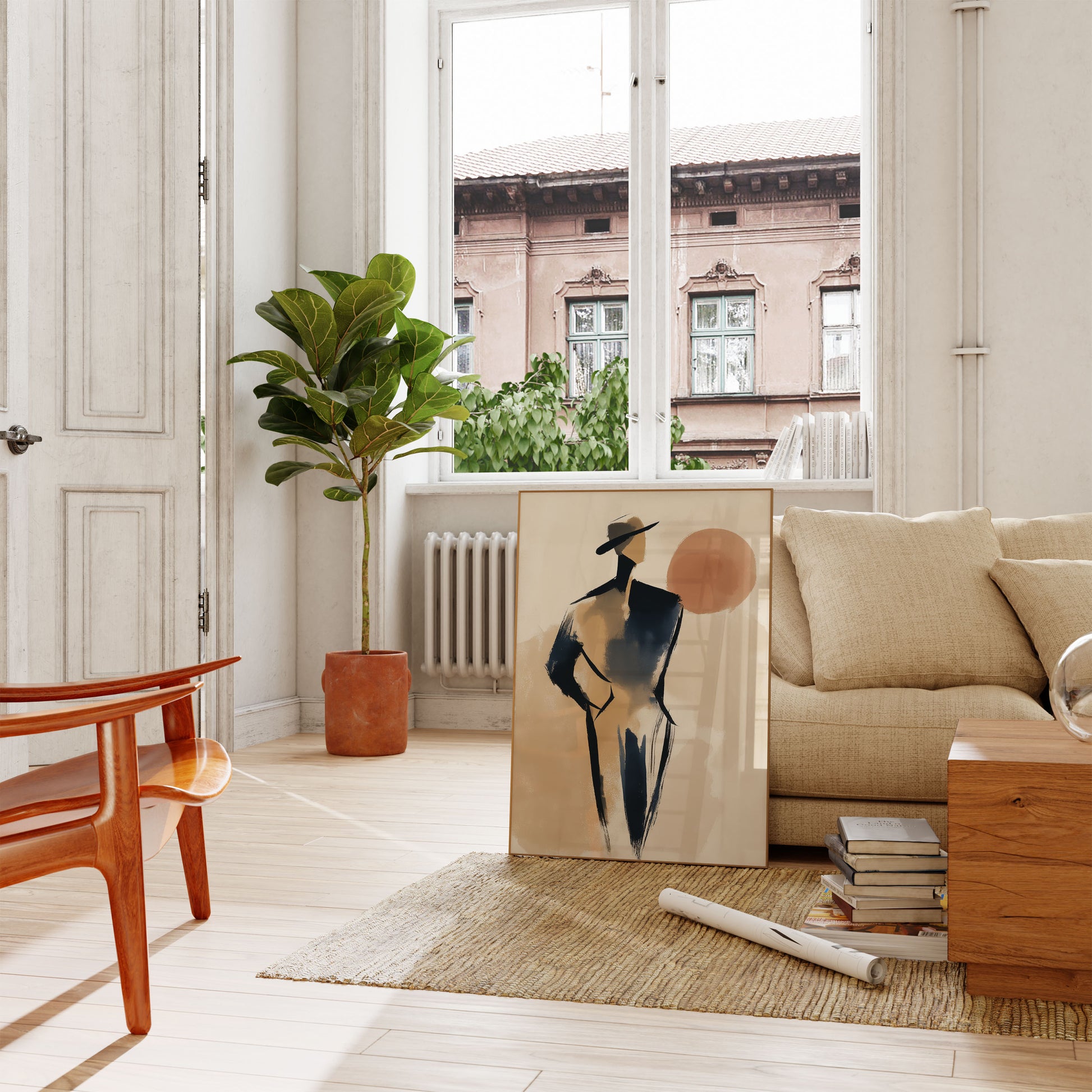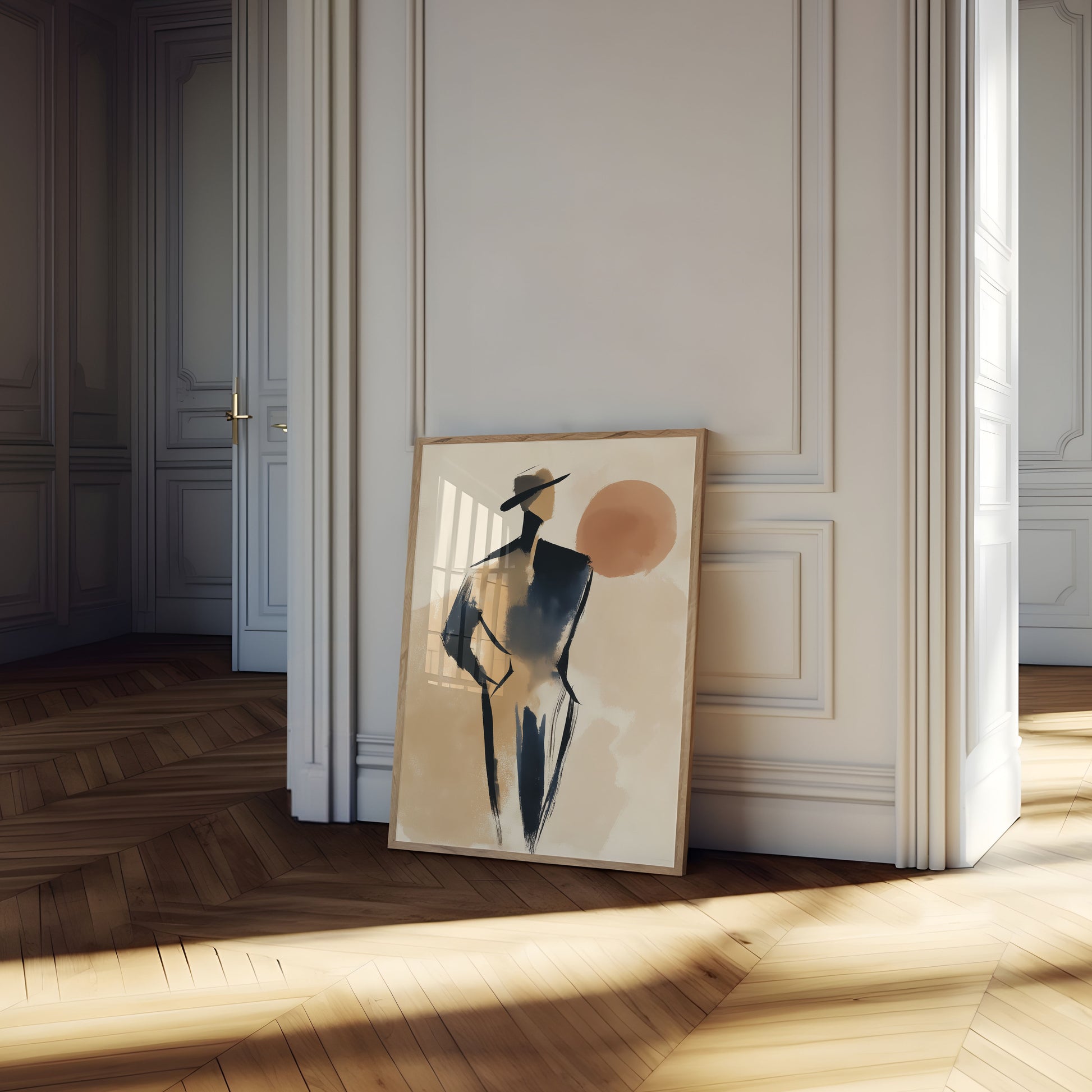 Diese auffällige minimalistische Illustration erfasst die Essenz westlicher Eleganz und kühnem Stil. Die Figur steht selbstbewusst in einem klassischen Cowboyhut und sophistischem schwarzem Outfit, vor einer warmen, neutralen Palette, die Wüstensunnenuntergänge und zeitlose Americana hervorruft. Die künstlerische Pinselführung schafft eine moderne, galerien-würdige Ästhetik, die Modeillustration mit zeitgenössischer Kunst verbindet und macht es zu einem perfekten Statement-Piece für jeden, der Stil, Attitüde und den romantischen Reiz des Wilden Westens schätzt.