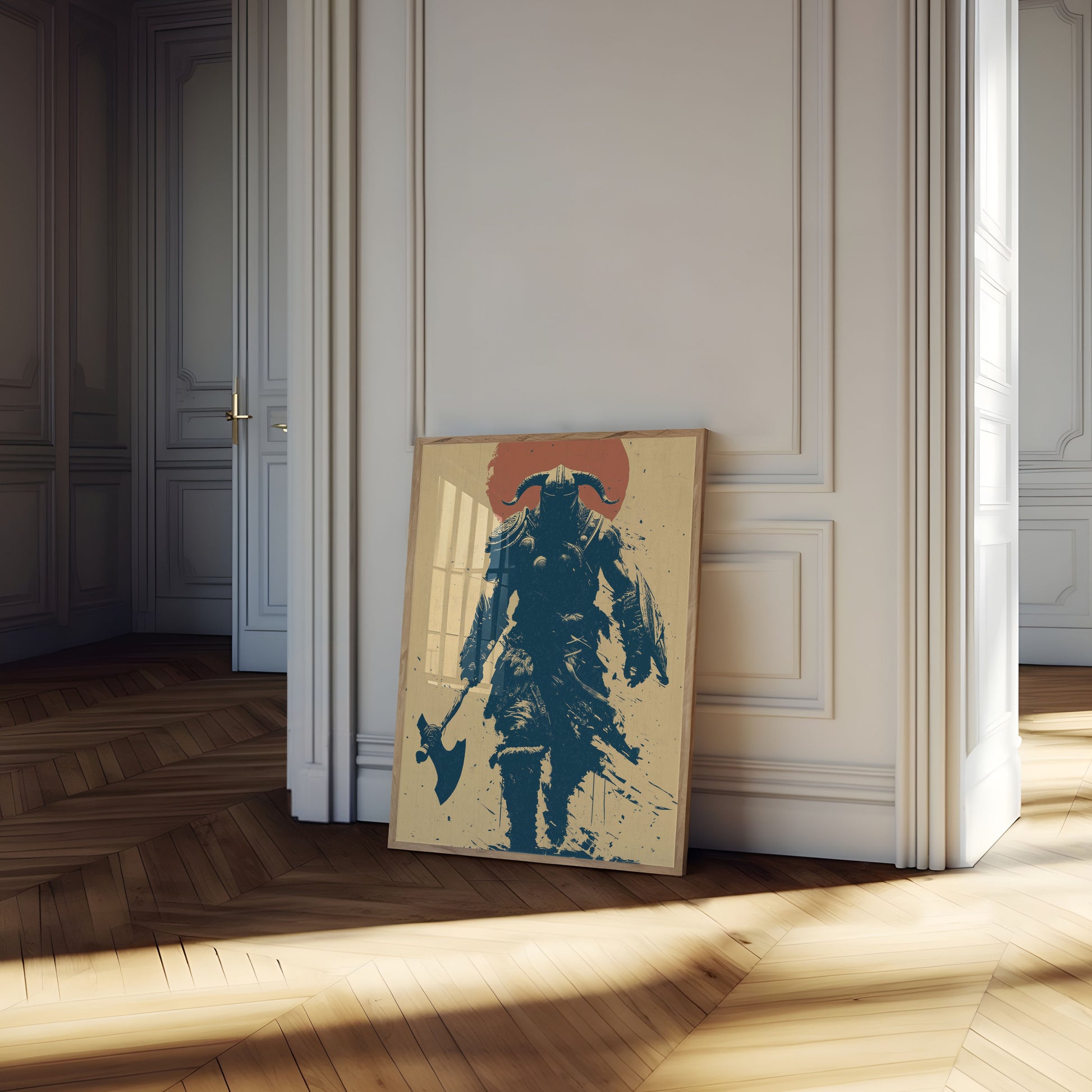 Tauchen Sie ein in die mächtige Welt der nordischen Mythologie mit diesem beeindruckenden Wikinger-Krieger-Poster. In einer kühnen Blau- und Rostfarbpalette gerendert, fängt das Bild eine befehlshabende Figur ein, die eine Axt schwingt, vor einem dramatischen Sonnenuntergrundmotiv. Die kunstvoll gearbeitete Rüstung und die imposante Silhouette des Kriegers verkörpern Stärke, Mut und den ungezähmten Geist der alten nordischen Krieger.