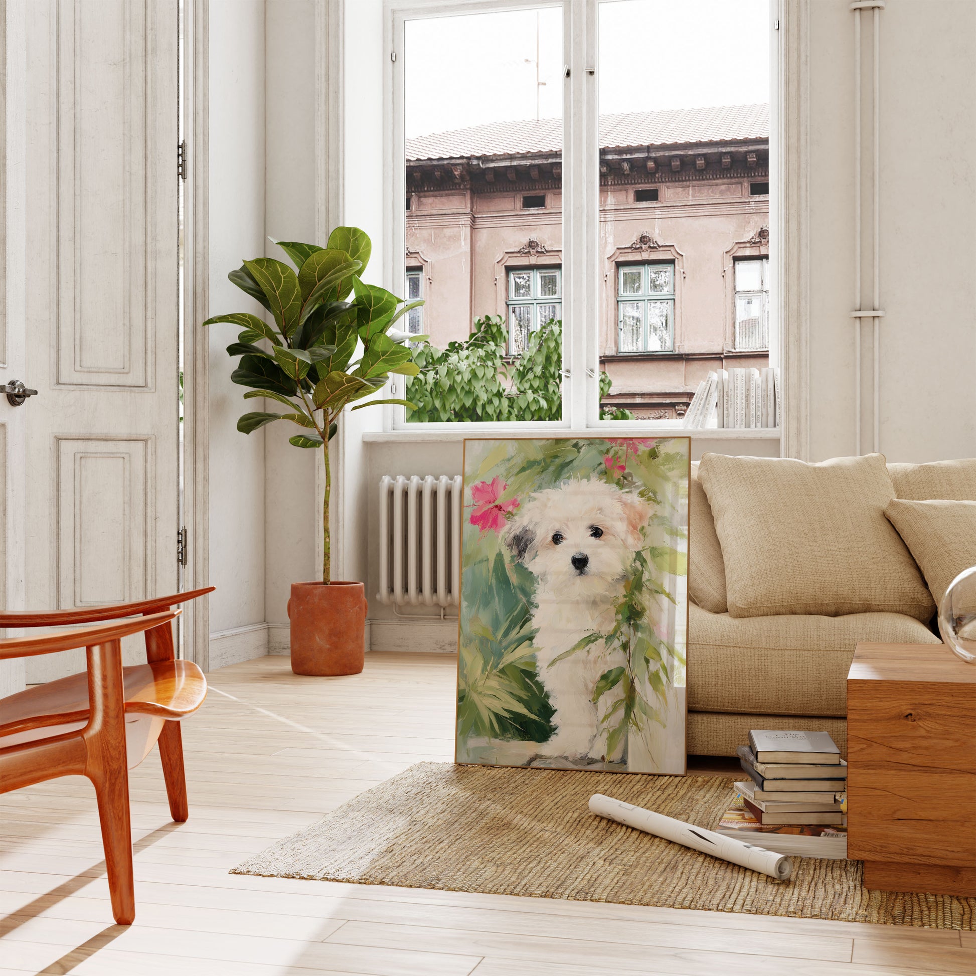 Ein entzückendes Porträt eines süßen weißen Welpen, der zwischen weichen grünen Blättern und leuchtend pinken Blumen eingebettet ist. Diese künstlerische Darstellung fängt die pure Unschuld und den Charme eines jungen Hundes ein, wobei sein wolkenartiges Fell und seine seelenvollen dunklen Augen eine herzerwärmende Szene schaffen, die sofort Freude und Wärme vermittelt. Der impressionistische Stil verschmilzt den Welpen mit seinem üppigen Hintergrund und schafft ein traumhaftes und zärtliches Kunstwerk.