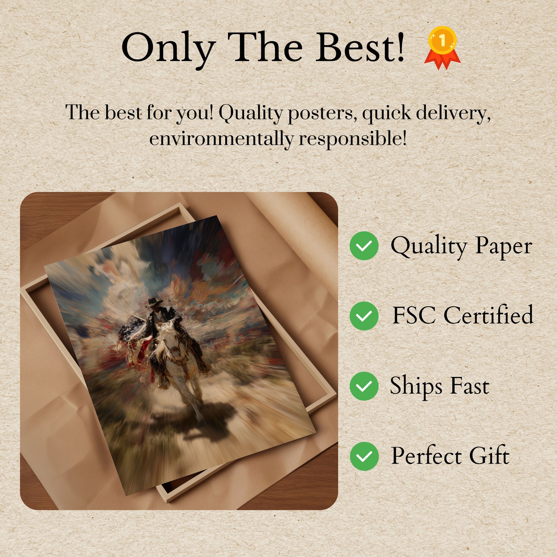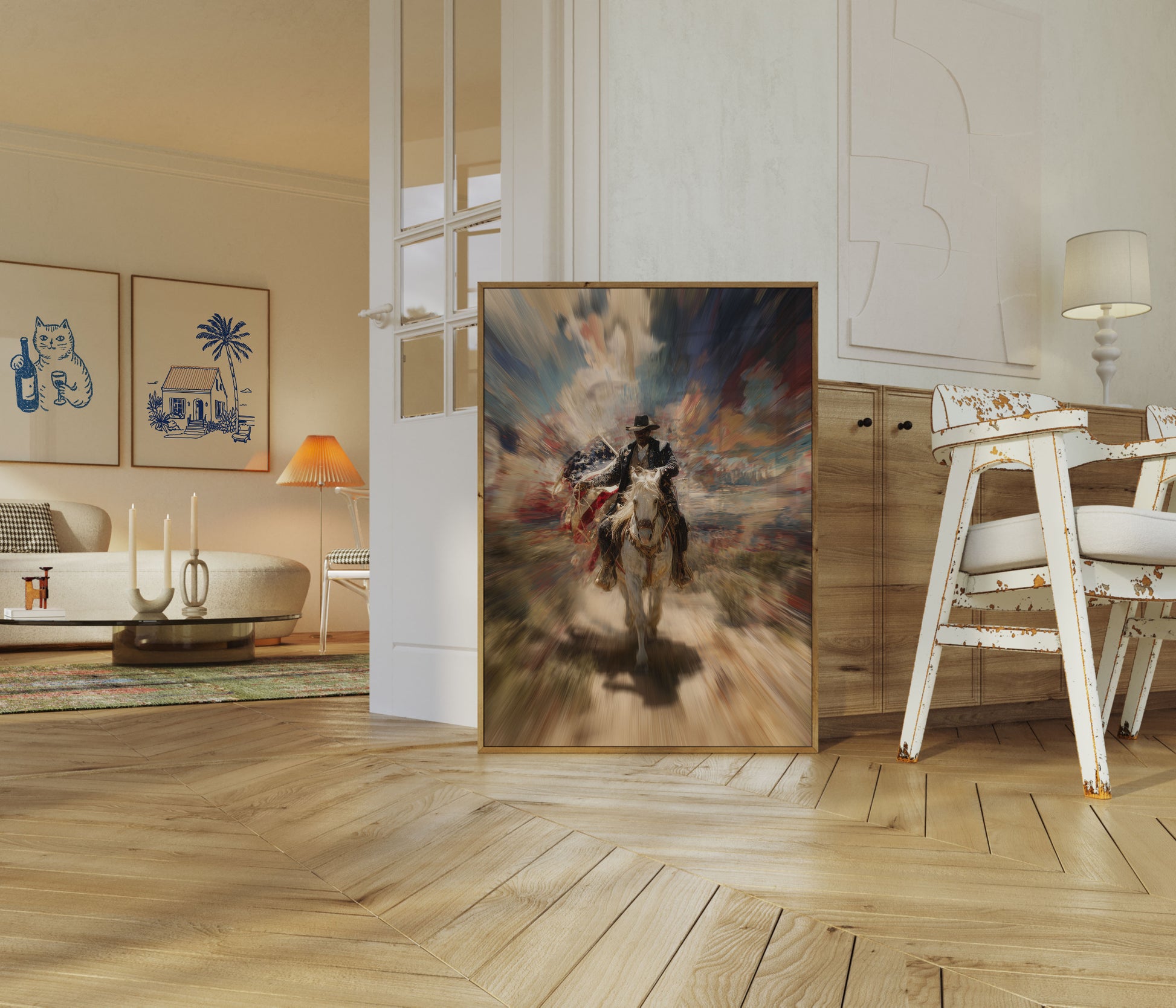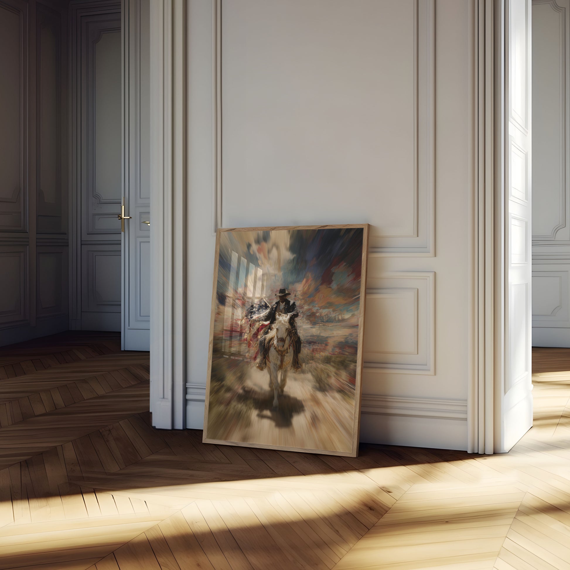 Eine dynamische und kraftvolle künstlerische Darstellung eines Cowboys, der auf einem weißen Pferd reitet und die amerikanische Flagge vor einem wirbelnden, farbenfrohen Hintergrund trägt. Das Bild fängt den Geist der amerikanischen Grenze ein, mit einem verschwommenen Bewegungseffekt, der ein Gefühl von Bewegung und Energie erzeugt. Reiche, explosive Farben vermischen sich um die zentrale Figur und symbolisieren die Leidenschaft und Dynamik des amerikanischen Westens.