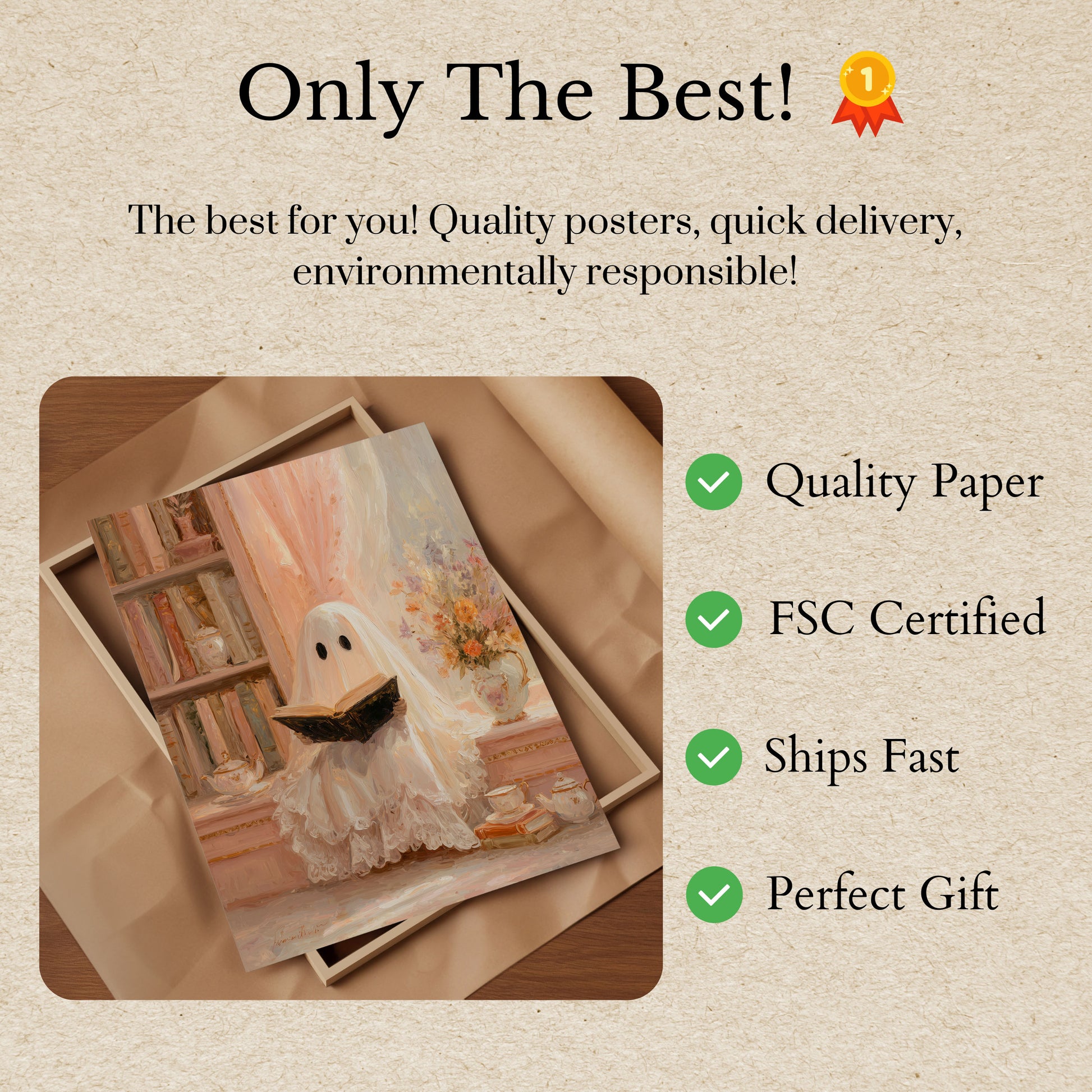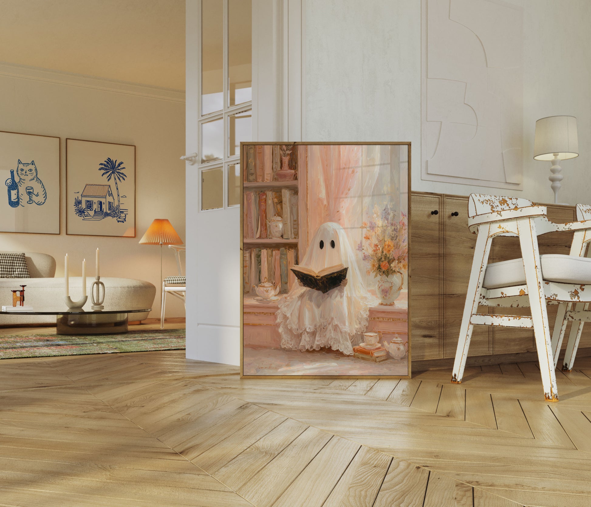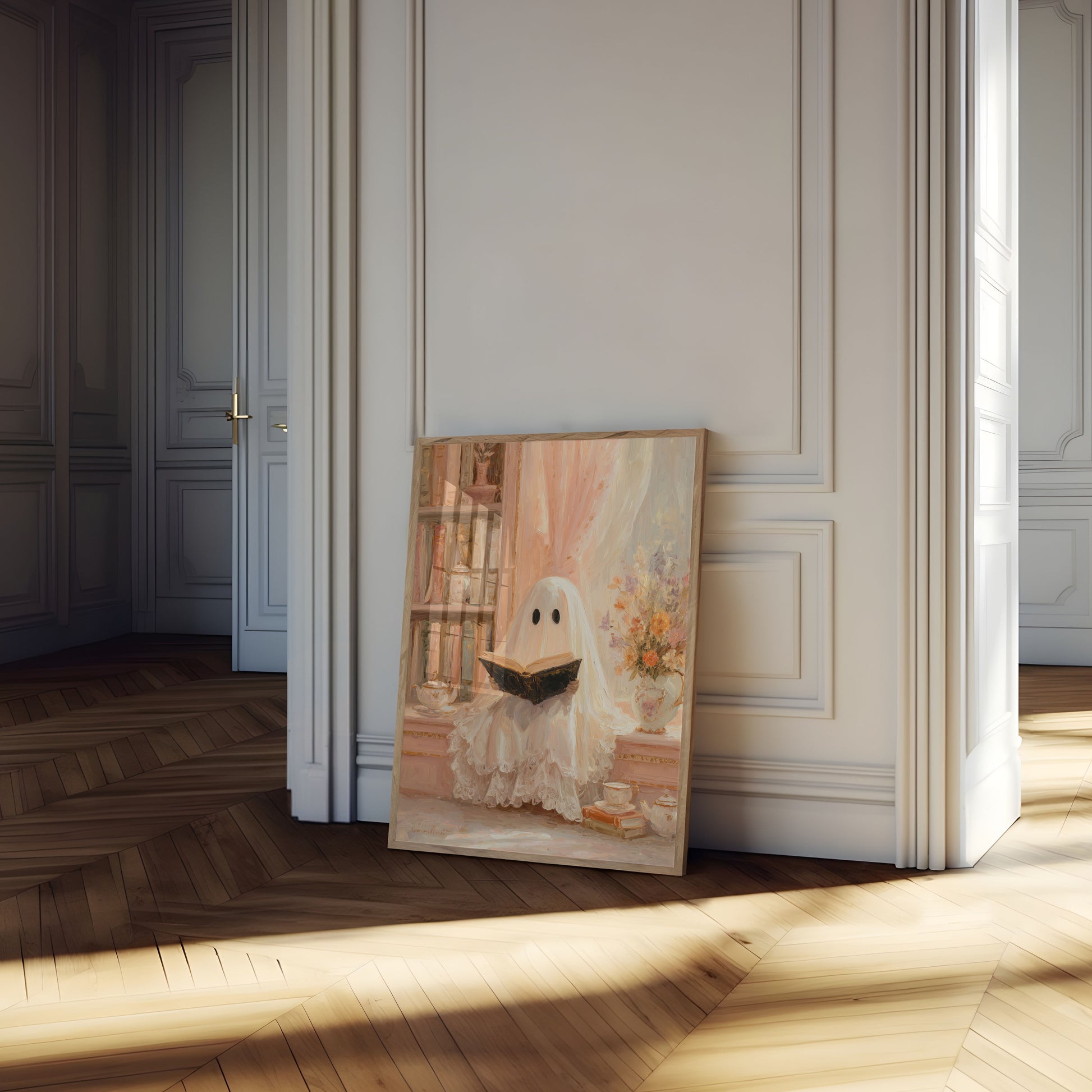 Entdecken Sie eine gespenstisch bezaubernde Szene eines zarten Geistes, der in das Lesen vertieft ist, umgeben von antiken Bücherregalen und sanften Pastelltönen. Diese charmante Kunstarbeit fängt einen magischen Moment eines geisterhaften Lesers inmitten von antiken Teetassen, feiner Spitze und einer Vase mit herbstlich getönten Blumen ein. Das sanfte, verträumte Gemälde lädt die Betrachter in eine gemütliche, ätherische Welt ein, in der Geister Trost in der Literatur finden.
