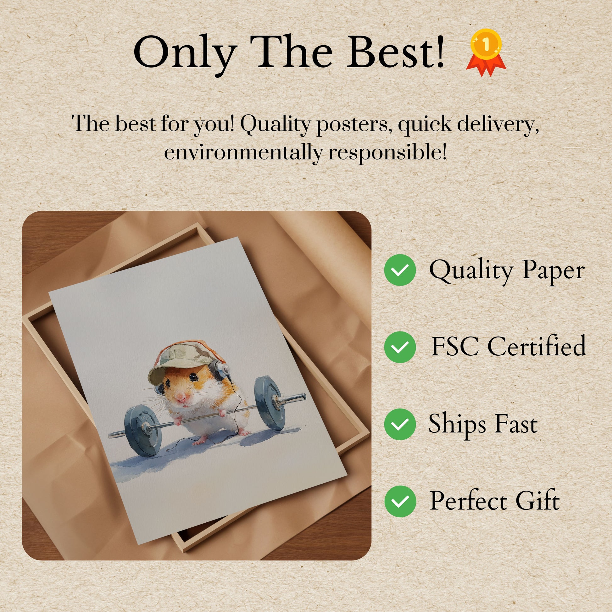 Lerne den entzückendsten Fitness-Motivator kennen, den du je gesehen hast - einen charmanten Hamster mit Eimerhut und Kopfhörern, der heldenhaft eine Langhantel stemmt. Diese Aquarellkunst fängt pure Entschlossenheit im Miniaturformat ein und verbindet Humor und Inspiration mit weichen, zarten Farben und einer unerwarteten athletischen Wendung. Der süße Nagetier-Athlet zeigt, dass Stärke in allen Größen existiert und verspricht, ein Lächeln und einen Motivationsschub in jeden Raum zu bringen.