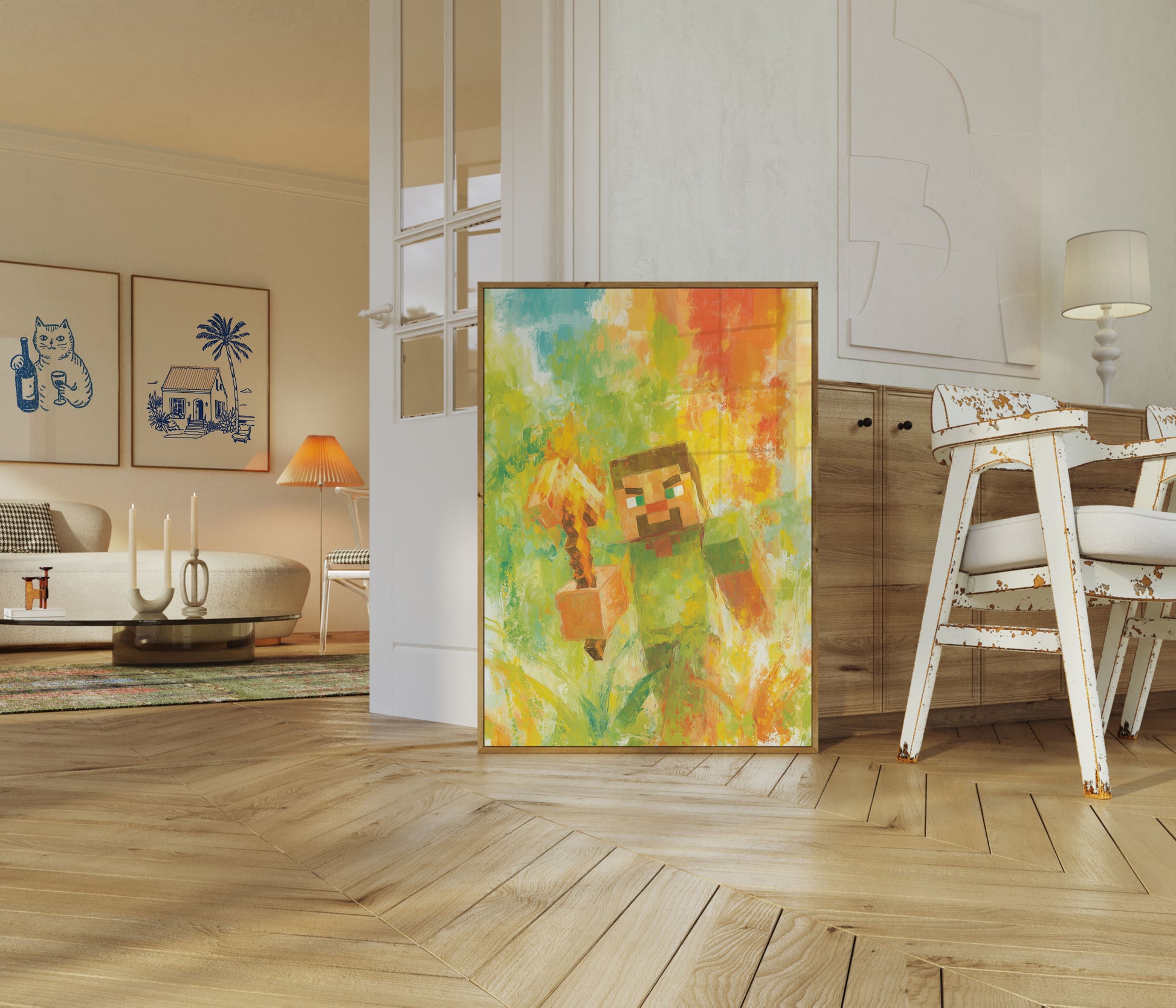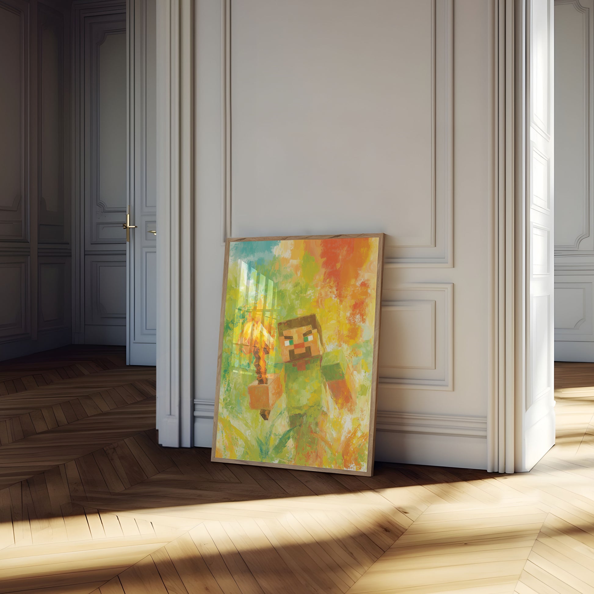 Tauchen Sie ein in die lebendige Welt von Minecraft mit diesem atemberaubenden Aquarellposter, das einen klassischen Charakter mit einem feurigen Block zeigt. Erfüllt von warmen Gelb-, Orange- und Grüntönen fängt das Kunstwerk die dynamische Energie und den pixeligen Charme des beliebten Spiels ein. Der abstrakte Hintergrund schafft ein Gefühl von Bewegung und Aufregung, der dieses Poster zu einem Muss für jeden Minecraft-Enthusiasten macht.