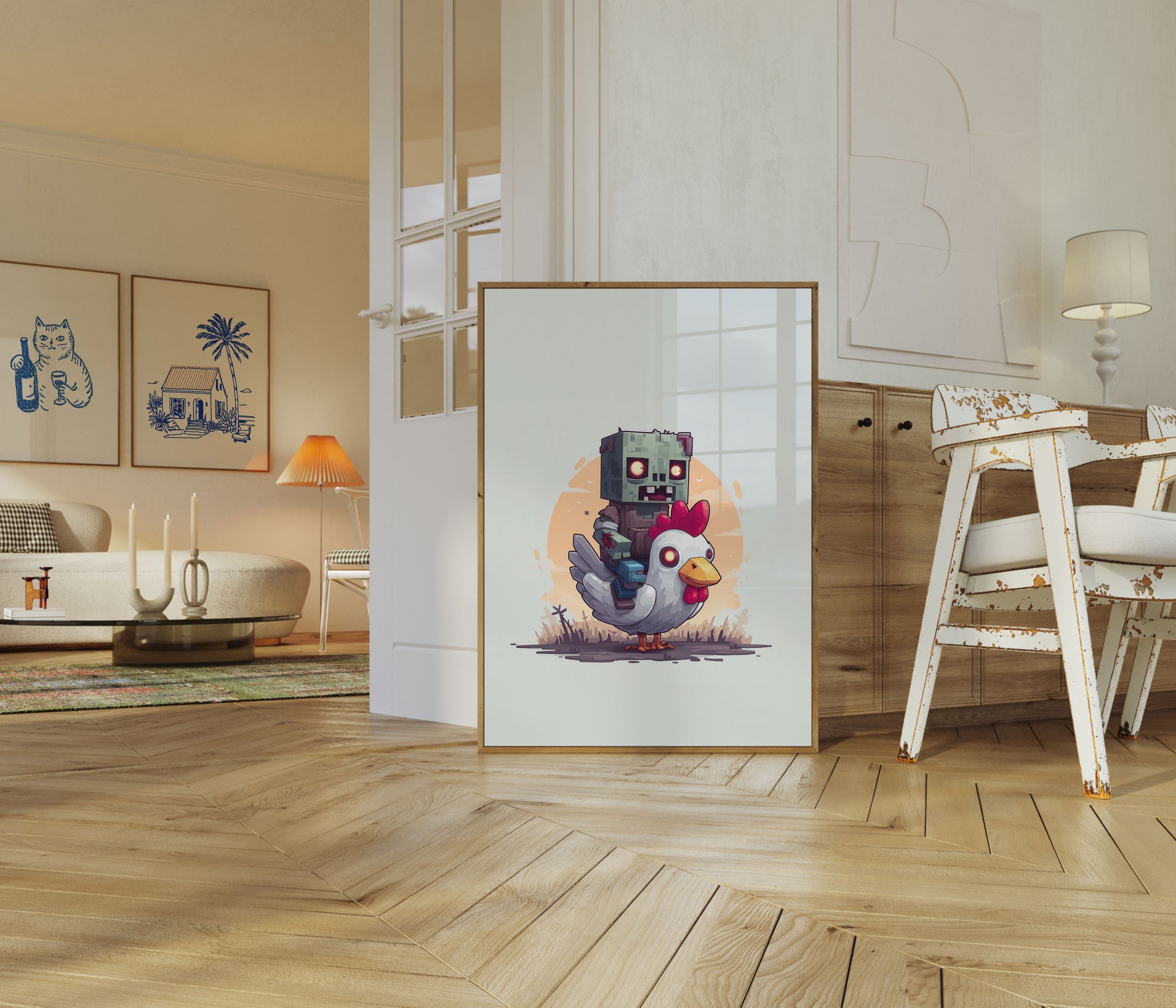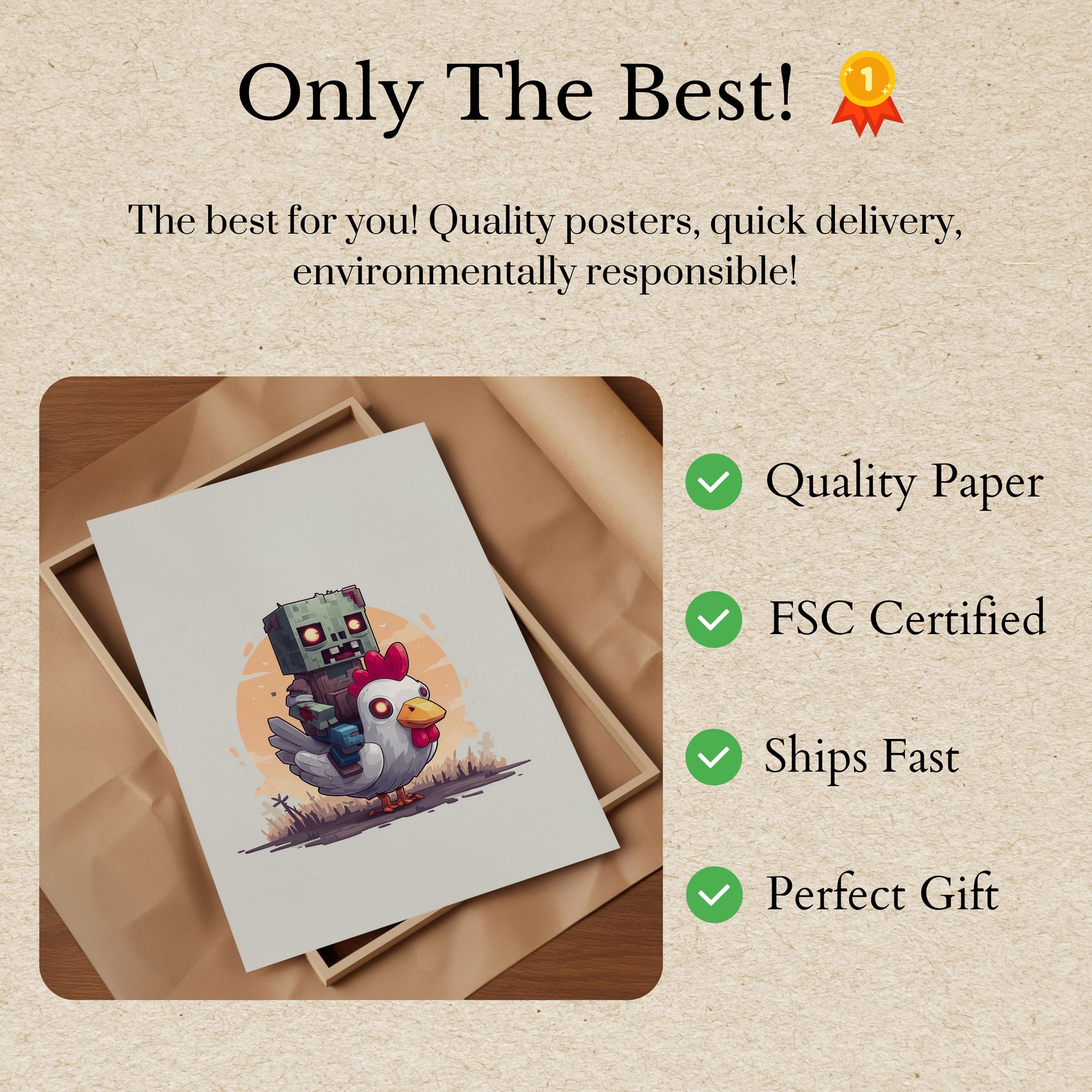 Tauche ein in eine skurrile Welt, in der Pixel-Kunst auf süßes Chaos trifft! Diese entzückende digitale Illustration zeigt einen eckigen Zombie-Reiter, der auf einem charmanten Cartoon-Huhn sitzt, vor einer warmen Sonnenuntergangskulisse. Mit leuchtend roten Augen und einem verspielten Design fängt dieses Poster den verspielten Geist von Minecrafts unerwartetestem Abenteuerbegleiter ein.