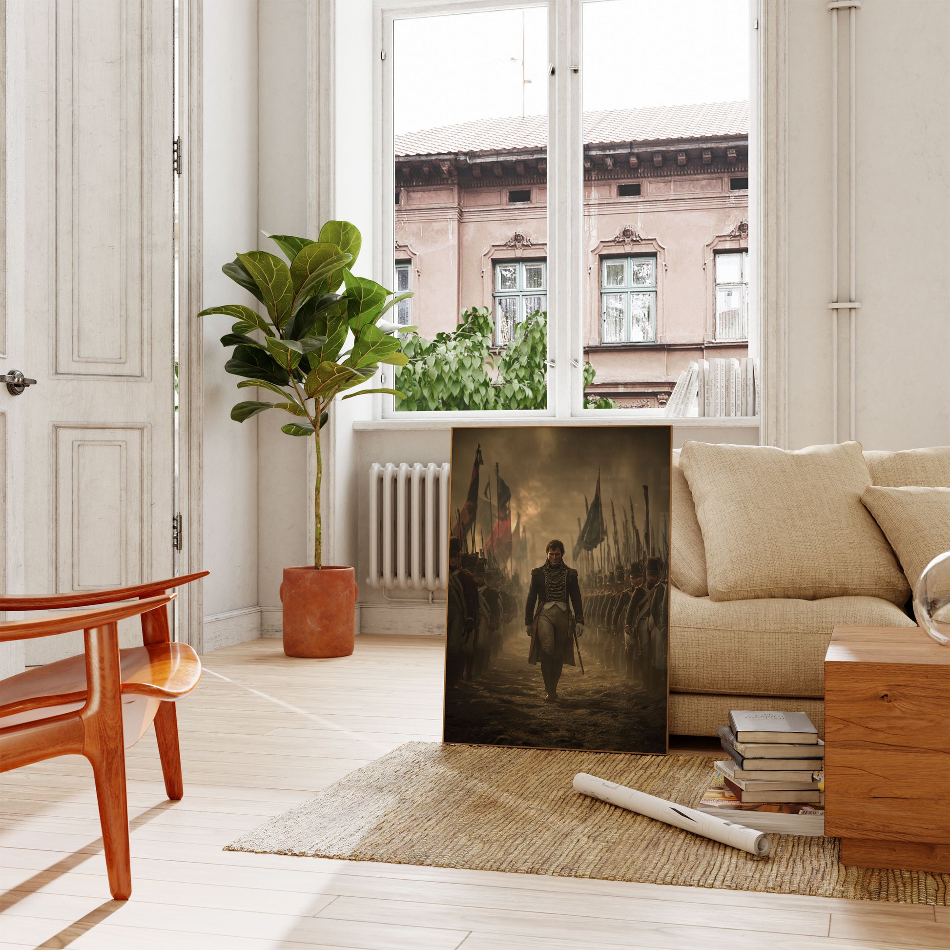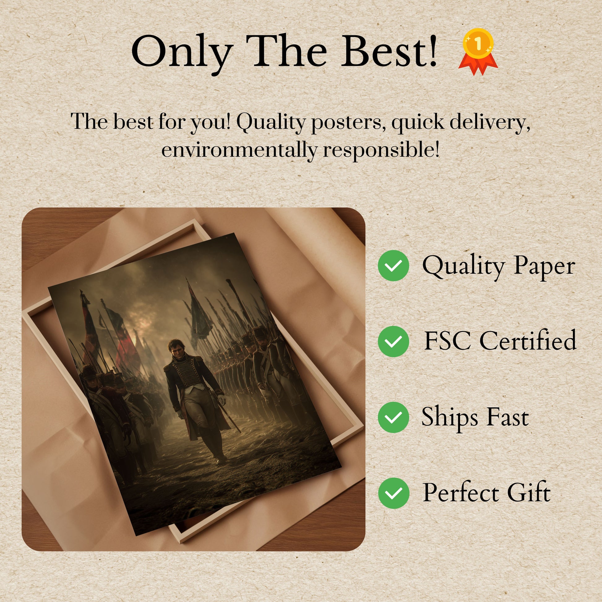 Tauchen Sie ein in die epische Welt militärischer Größe mit diesem atemberaubenden historischen Poster, das einen kraftvollen Militärführer einfängt, der selbstbewusst zwischen Reihen disziplinierter Soldaten schreitet. Die stimmungsvolle, atmosphärische Szene ist in goldbraune Töne getaucht und schafft eine dramatische und intensive visuelle Erzählung von Führung und militärischer Stärke. Wehende Flaggen, in Habachtstellung stehende Soldaten und eine befehlshabende Zentralfigur machen dieses Poster zu einer atemberaubenden Darstellung der Kriegsführung in der napoleonischen Ära.