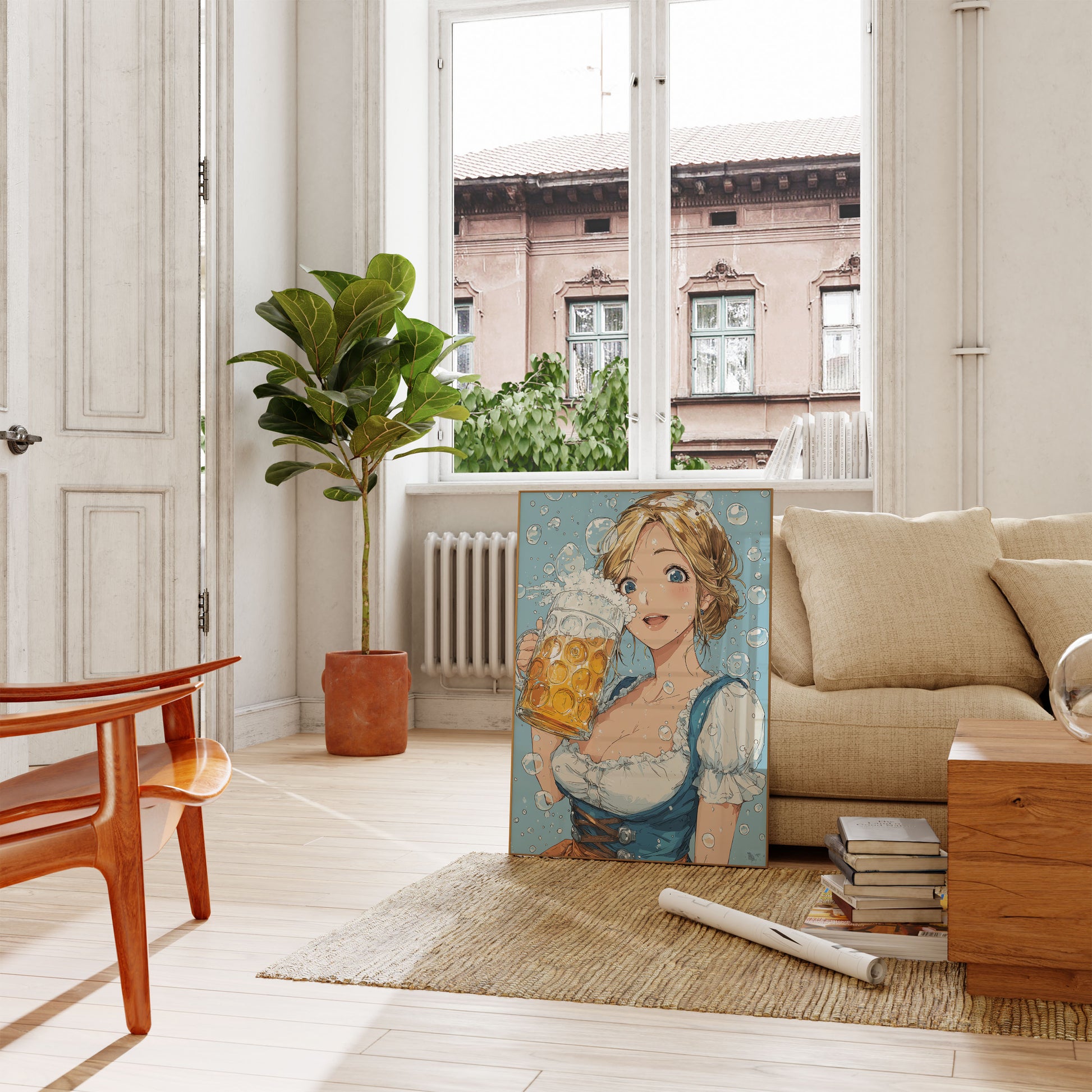Dive into the vibrant spirit of Oktoberfest with this stunning anime-style illustration featuring a cheerful blonde in traditional Bavarian attire. The artwork captures the effervescence of a perfect beer moment, surrounded by sparkling bubbles and holding a massive golden beer mug with infectious joy. Soft blue tones and delicate water droplets create a refreshing, celebratory atmosphere that brings the festive German beer culture to life.