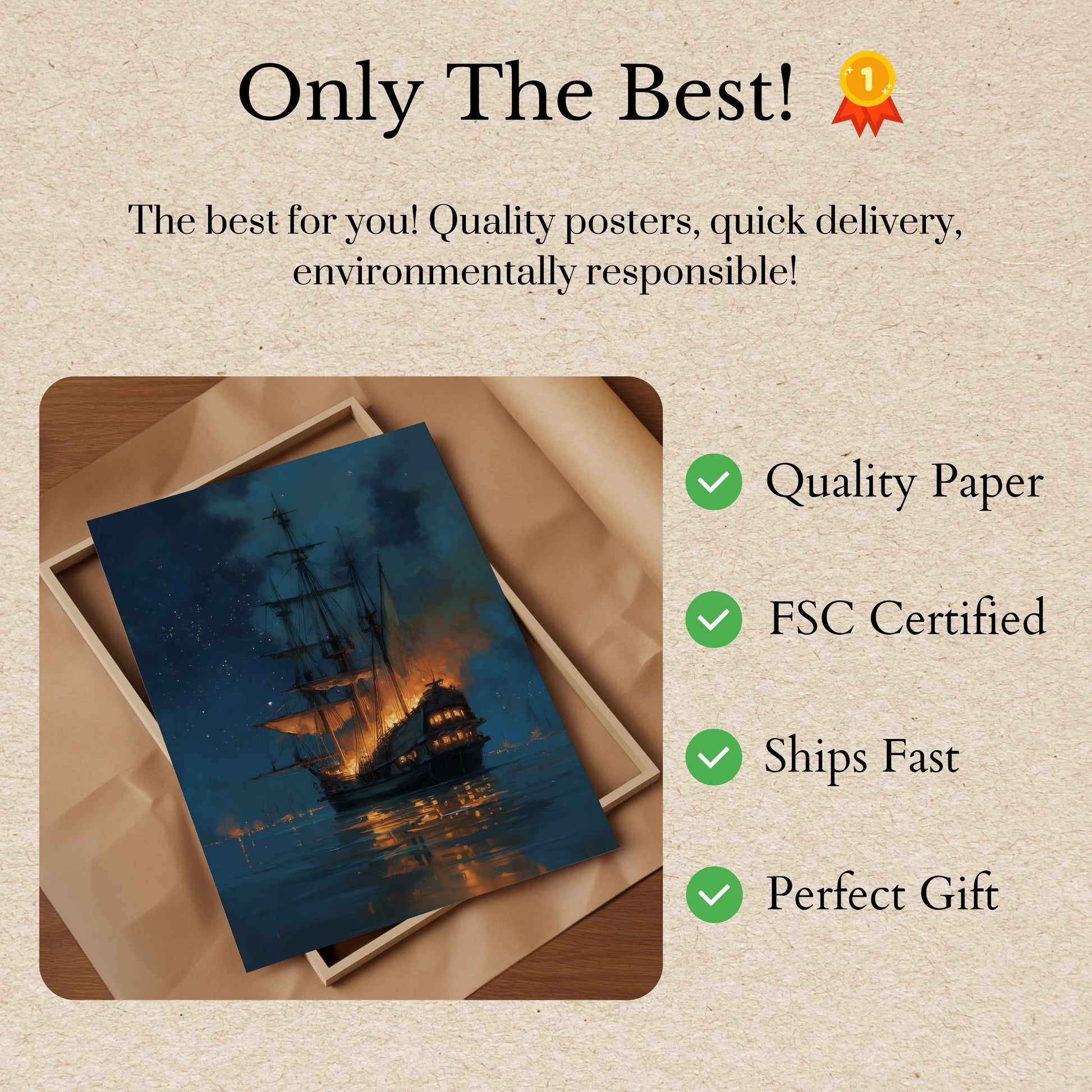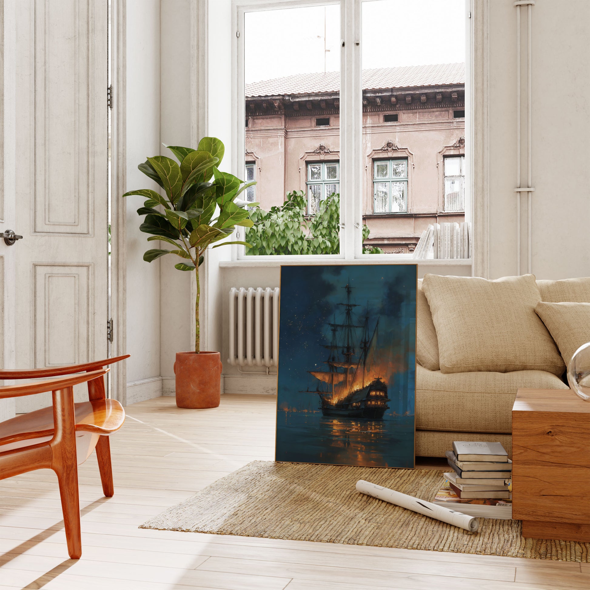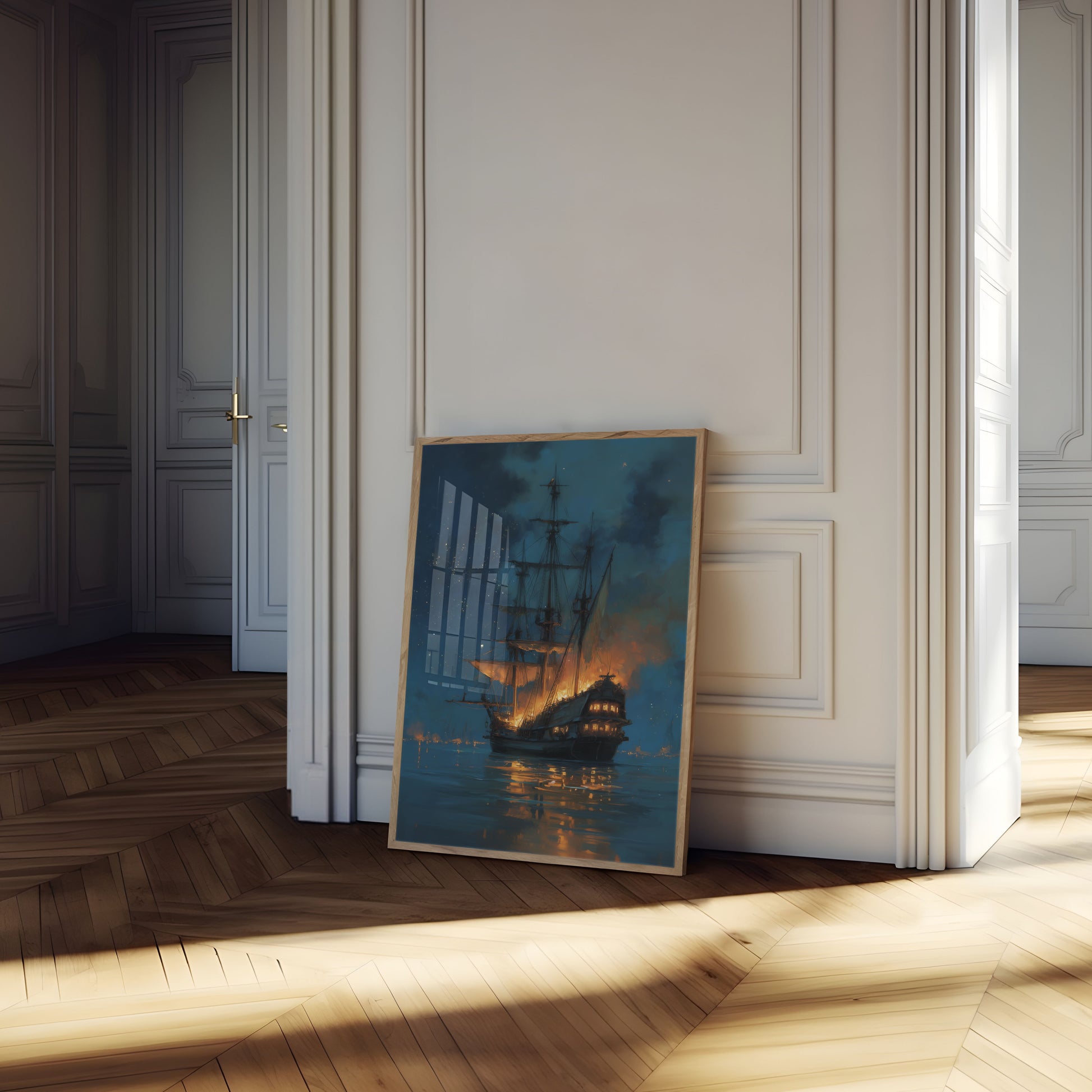 Immerse yourself in the haunting beauty of a maritime masterpiece, where a majestic sailing ship blazes against a deep midnight blue backdrop. Flames lick the vessel's wooden hull, casting an ethereal orange glow that dances across the calm waters and illuminates the intricate rigging. The scene captures a moment of dramatic tension, with starlit skies and distant harbor lights creating an atmosphere of mystery and impending adventure.