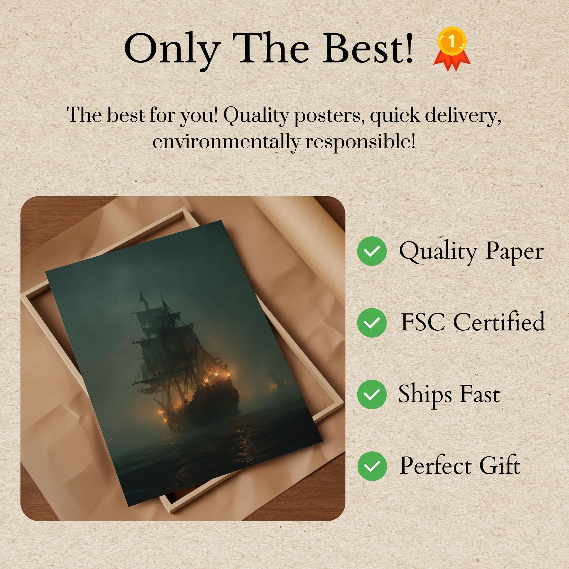 Drift into the mysterious depths of maritime legend with this hauntingly beautiful sailing ship poster. Shrouded in emerald mist and illuminated by flickering lantern light, the tall ship emerges from the shadows like a phantom of the high seas. The intricate details of tattered sails and weathered wooden hull create an atmospheric scene that captures the imagination and transports viewers to a world of maritime mystery and adventure.