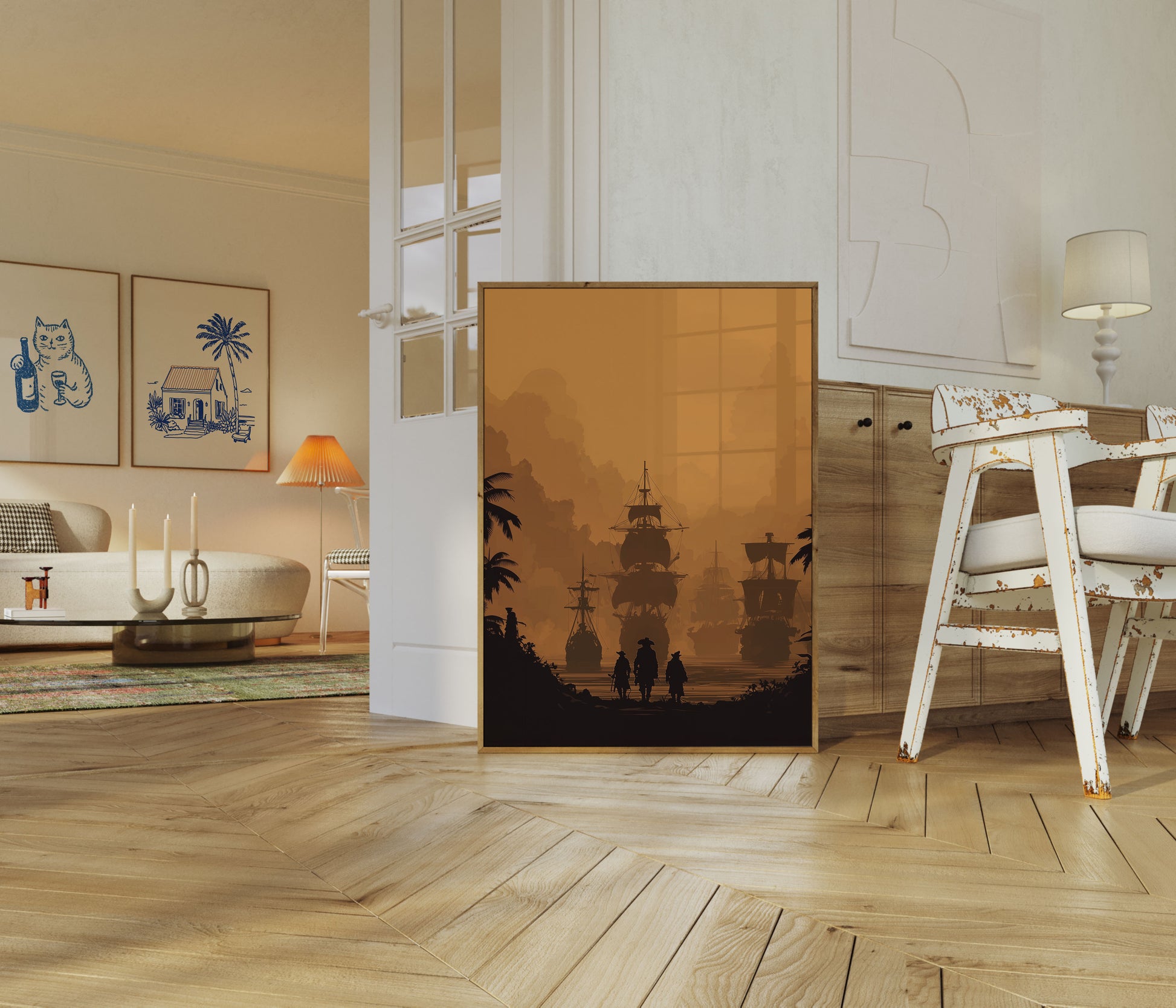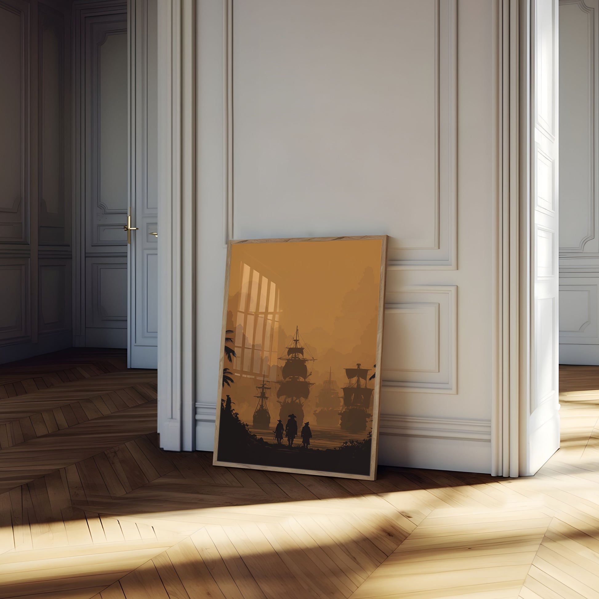Immerse yourself in the mysterious world of maritime adventure with this stunning sepia-toned poster capturing the essence of pirate ships at sunset. The image depicts three silhouetted figures walking towards a fleet of majestic sailing vessels, surrounded by dramatic golden clouds and palm trees, creating an atmosphere of epic nautical exploration. Rich amber tones and intricate ship details transport viewers to a bygone era of high seas adventure and maritime legend.
