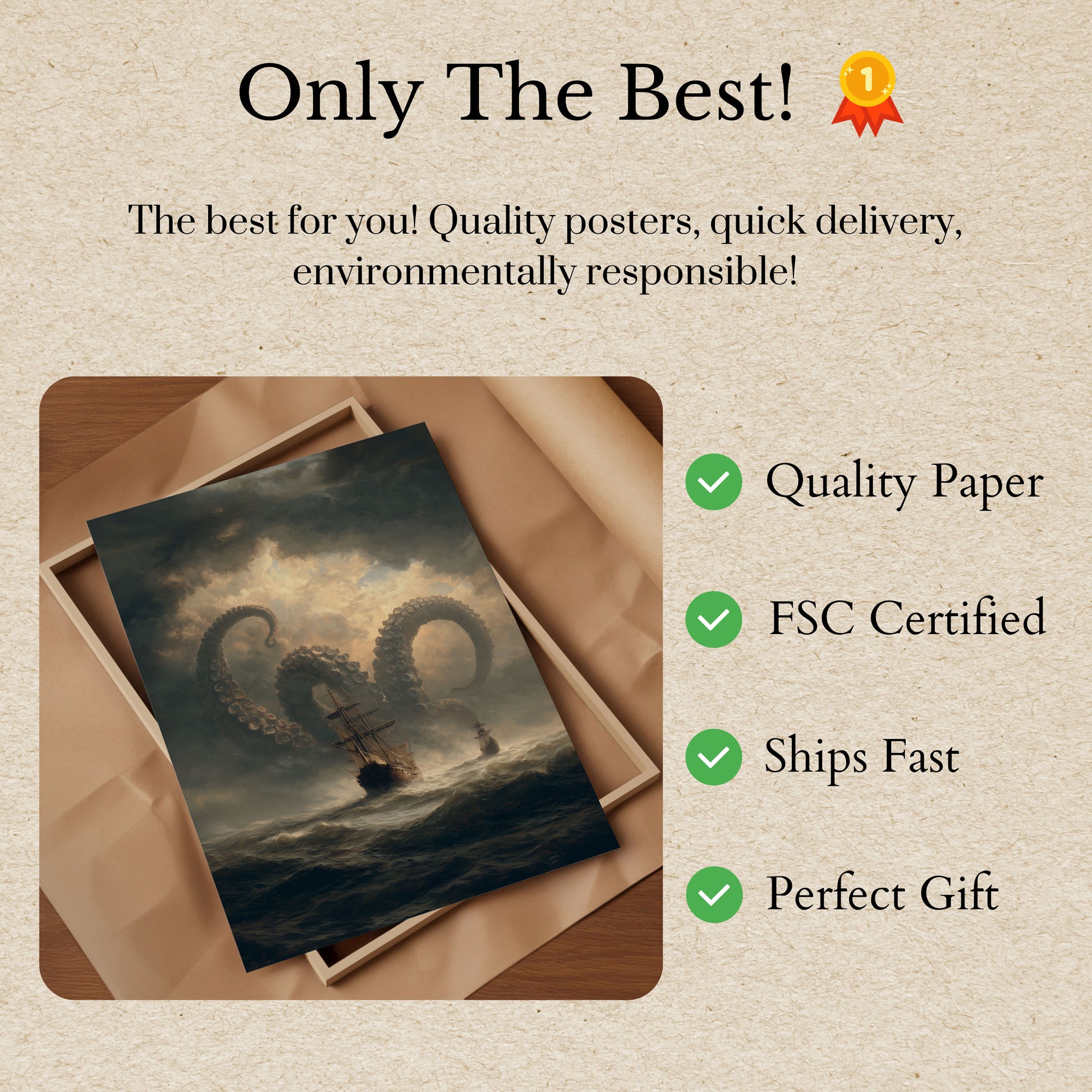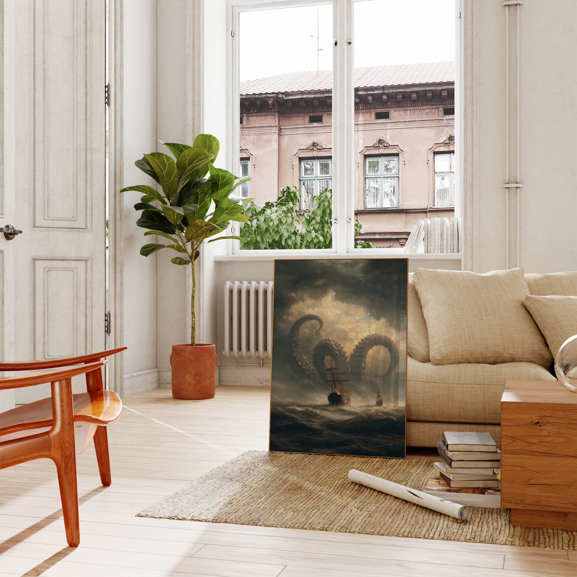 Witness the ultimate maritime nightmare in this breathtaking illustration of a sailing ship confronting massive tentacled sea monsters. Dramatic storm clouds swirl around ancient wooden vessels, with enormous octopus-like appendages threatening to crush the fragile ships amid turbulent waves. The artwork captures a moment of pure nautical terror, blending historical maritime imagery with mythical sea creature legends in a stunning, atmospheric composition.