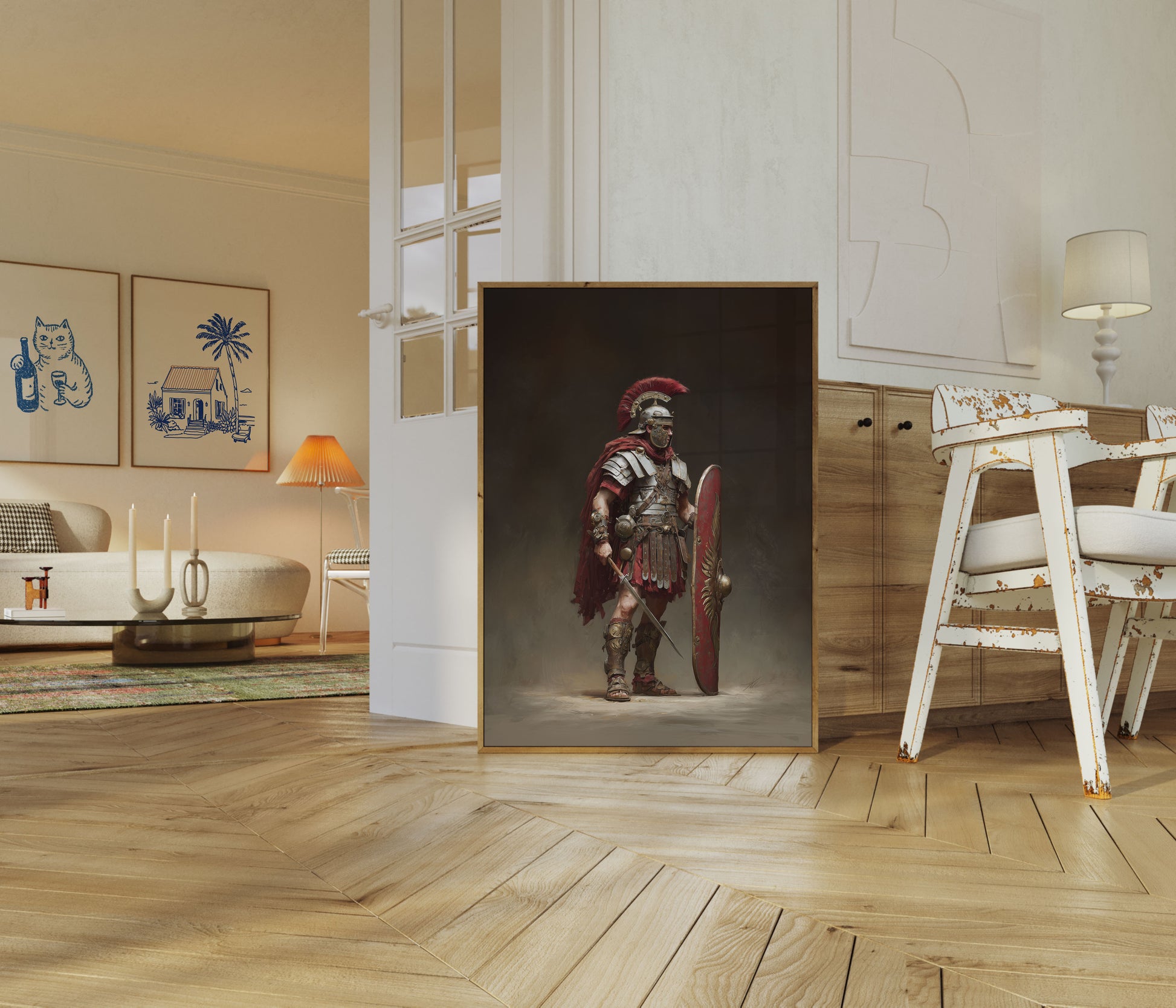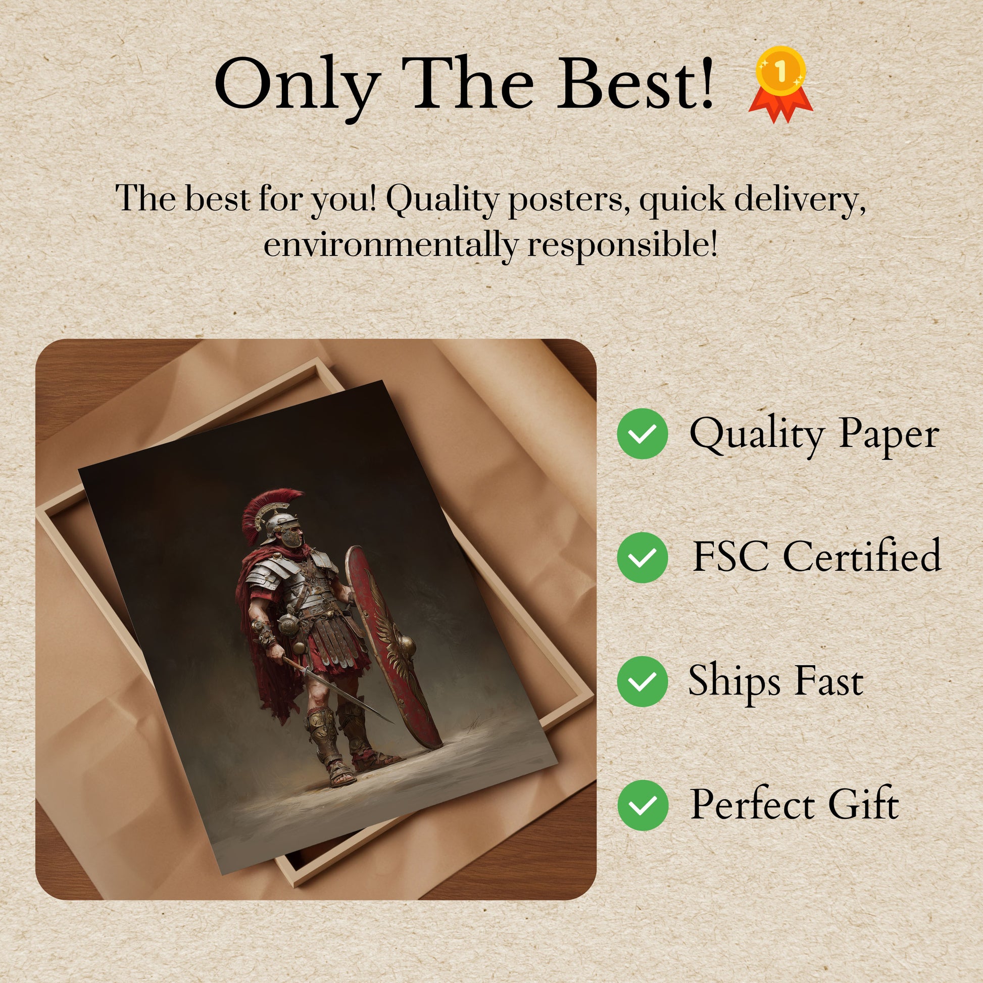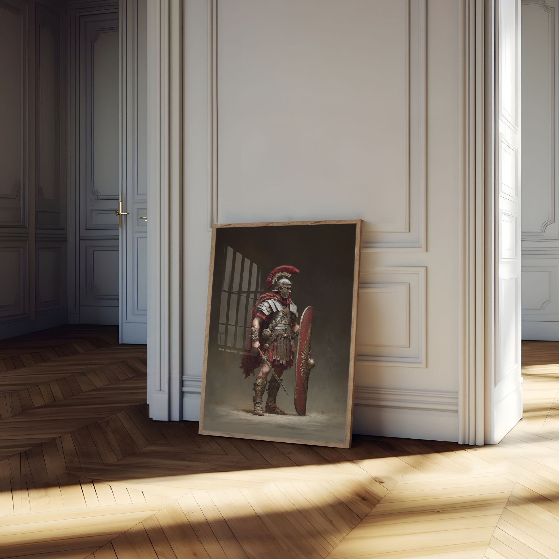 Step into the world of ancient military might with this stunning illustration of a Roman soldier in full battle regalia. Draped in a rich crimson cape and adorned with intricate silver armor, the legionary stands ready for combat, his detailed helmet and gleaming shield capturing the raw power and discipline of the Roman Empire. The dramatic, shadowy background emphasizes the warrior's strength and heroic presence, making this poster a captivating piece of historical art for any space.