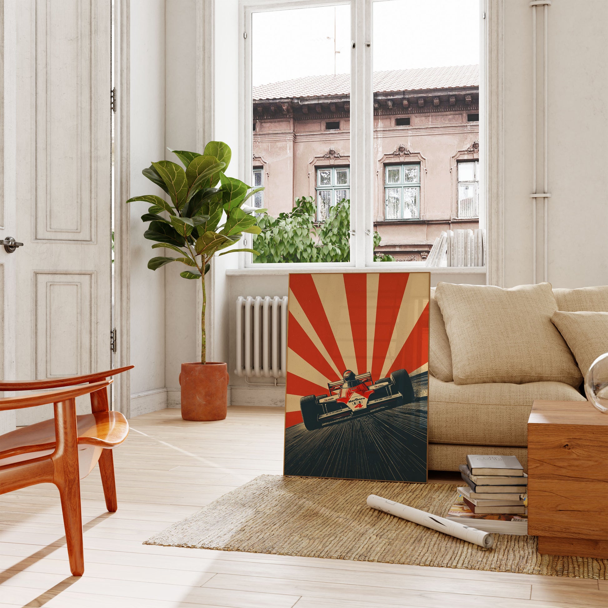 Dive into the heart-pounding world of Formula 1 with this electrifying vintage-style racing poster. Capturing the raw power and dynamic motion of a classic racing car, the image explodes with dramatic red and cream sunburst lines that create an intense sense of speed and energy. The Marlboro-sponsored racing car, marked with the number 4, cuts a sharp silhouette against a backdrop that seems to radiate momentum and excitement.