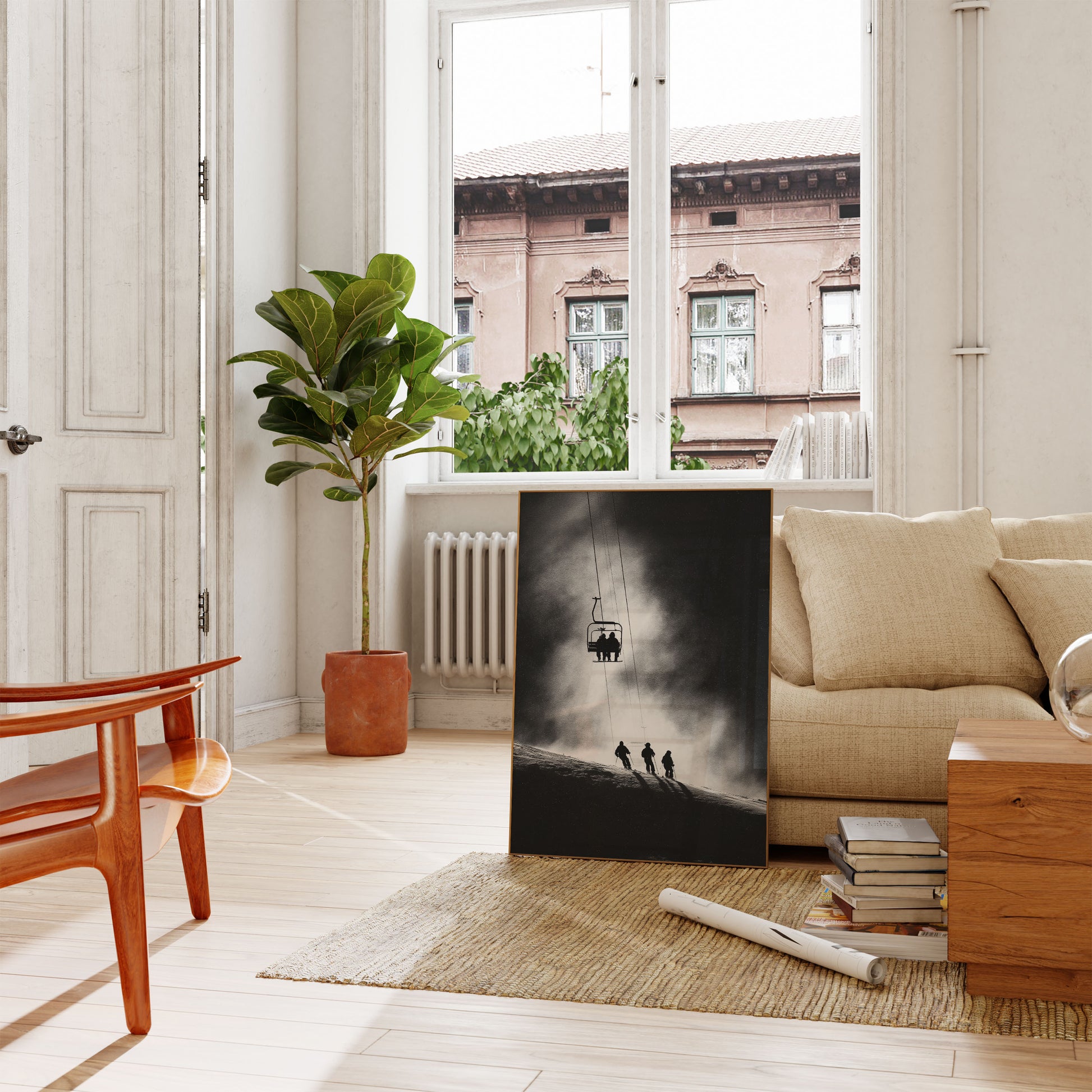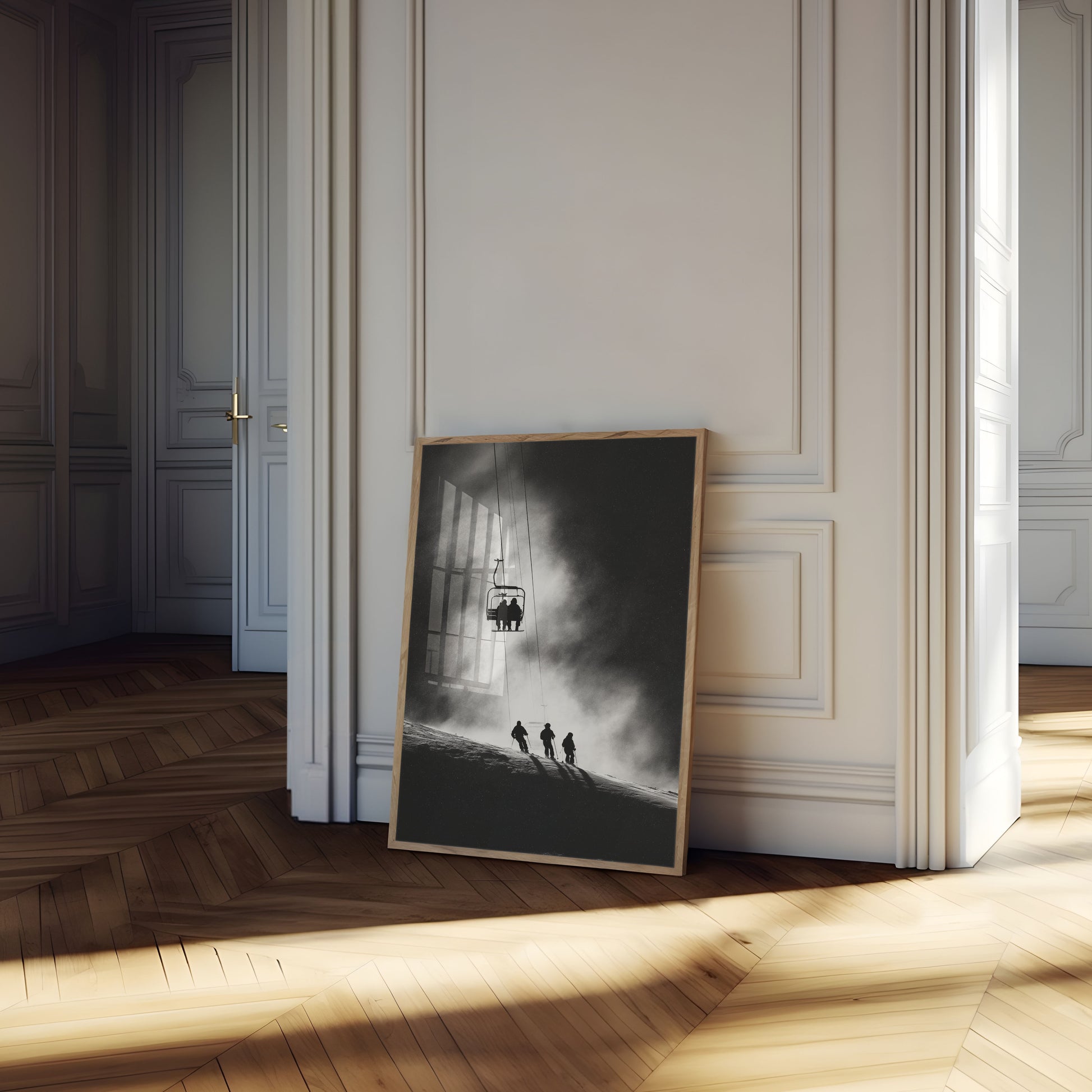 Capture the raw essence of winter sports with this dramatic black and white ski landscape. Silhouetted skiers emerge from swirling mist, riding a chairlift and carving trails down a mysterious snow-covered slope. The high-contrast image transforms an ordinary ski scene into a powerful visual journey of winter exploration and mountain solitude.