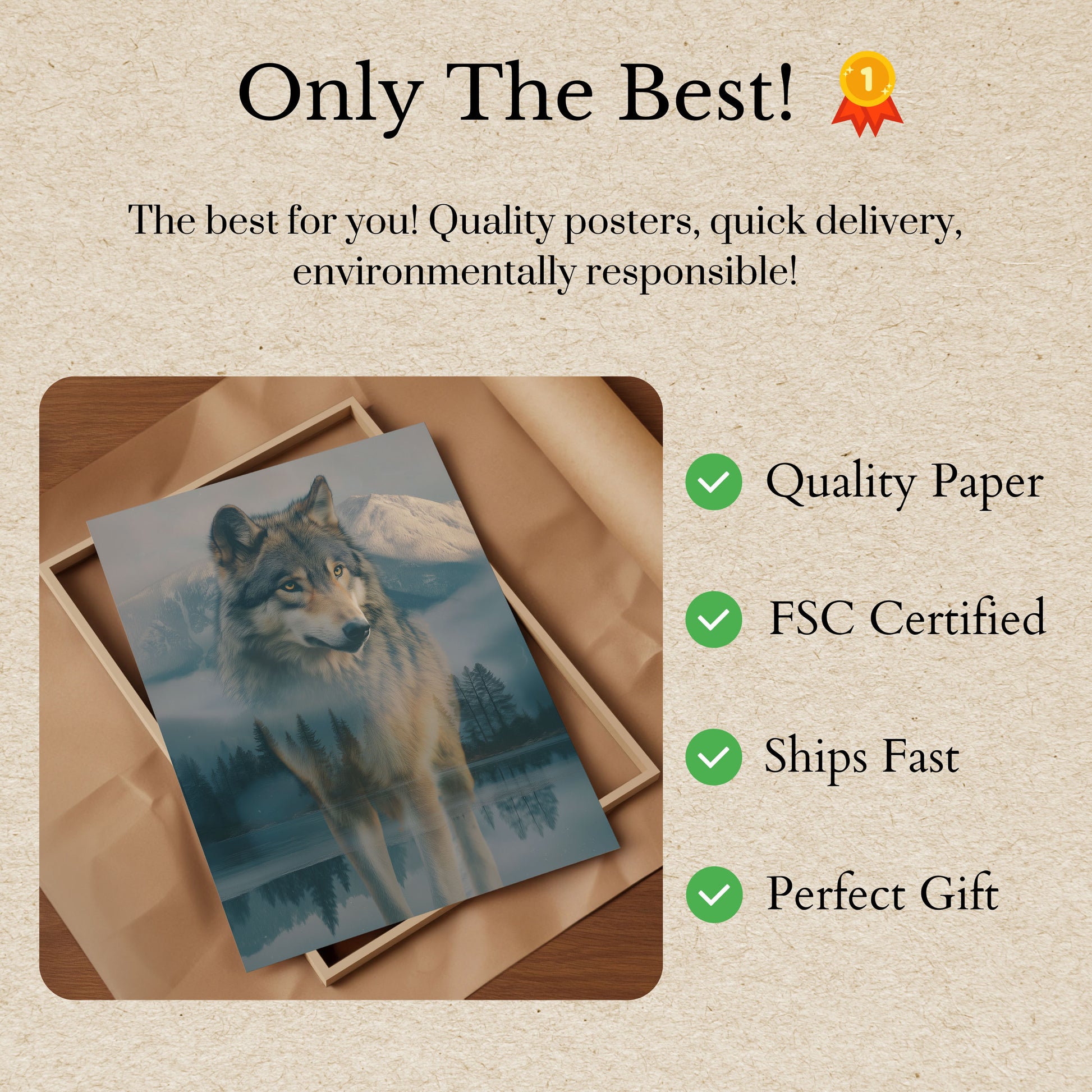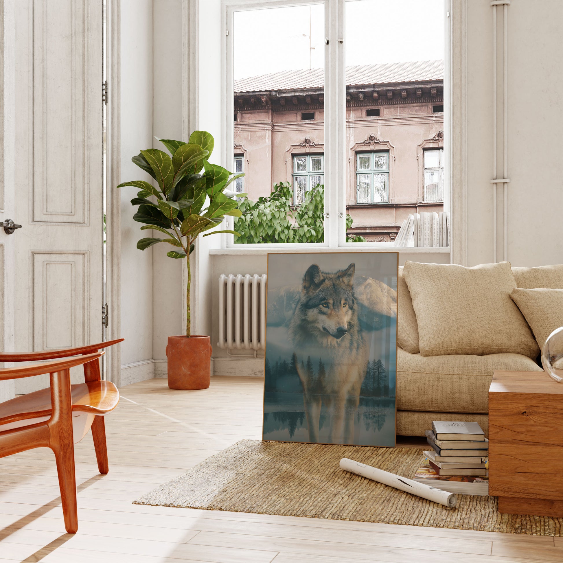 A breathtaking wolf portrait that captures the essence of wilderness and tranquility. Set against a mystical mountain backdrop, this stunning image blends the powerful presence of a wolf with the ethereal beauty of a misty forest and serene lake. The wolf's piercing eyes and majestic stance command attention, creating a mesmerizing visual journey through the untouched landscapes of the wild.